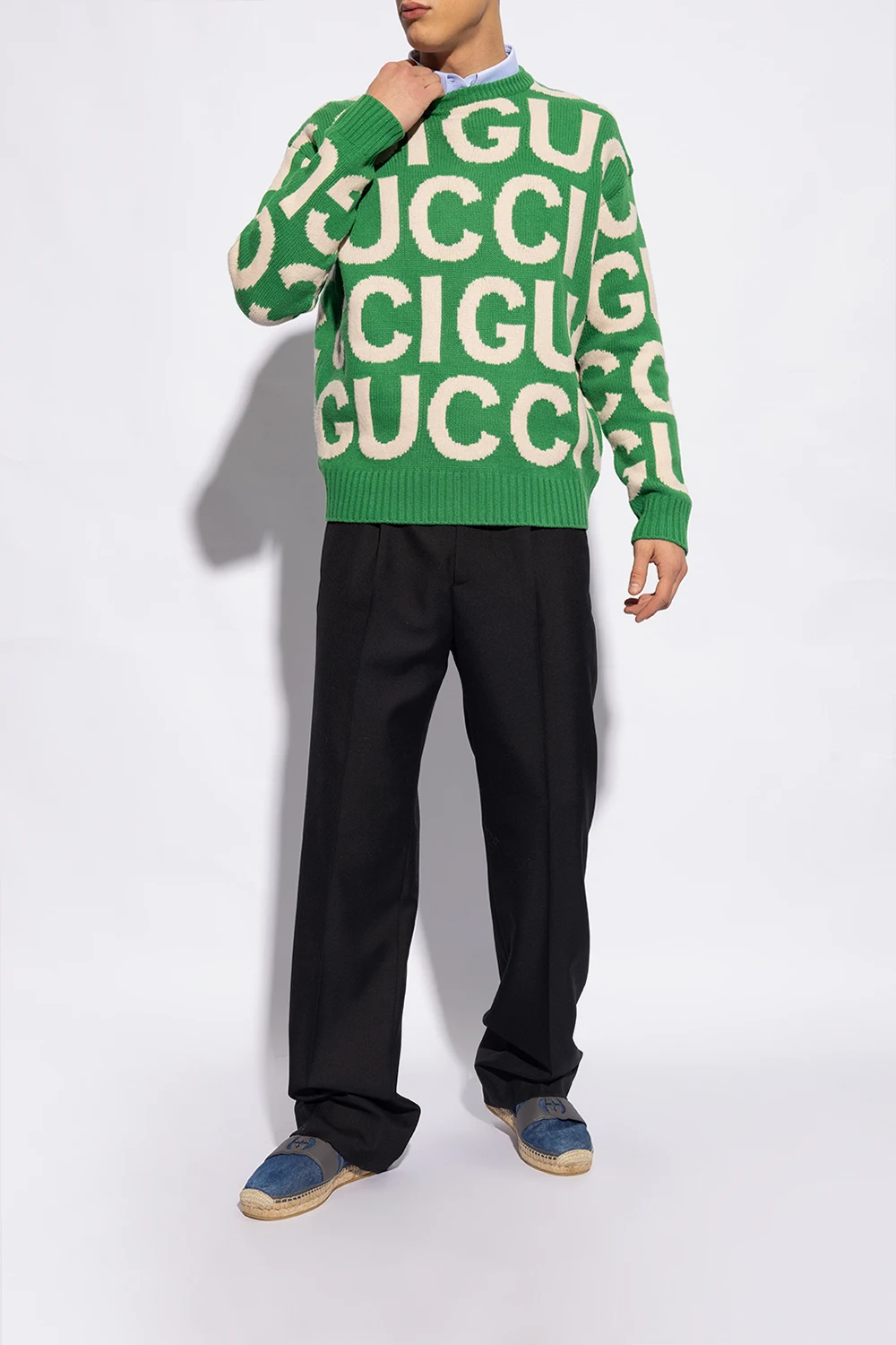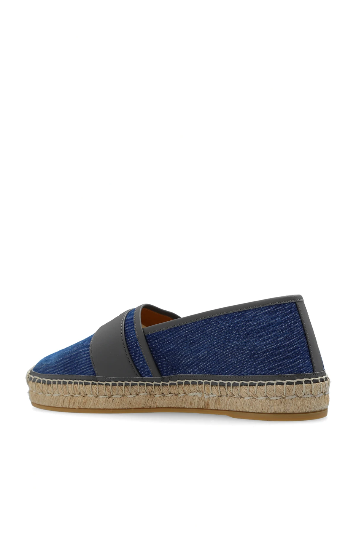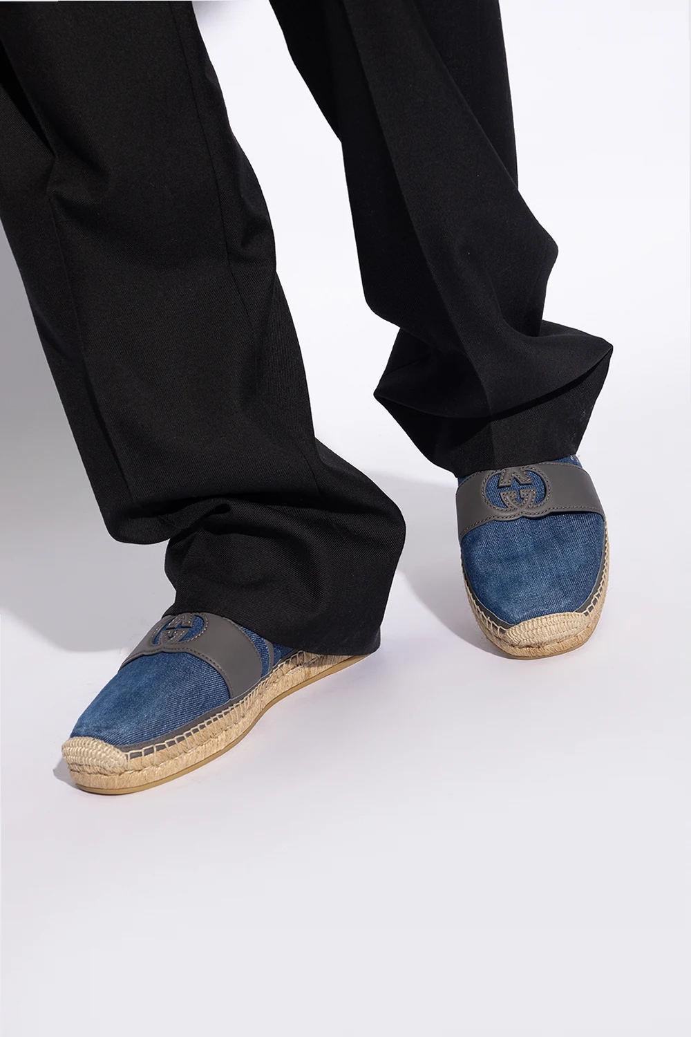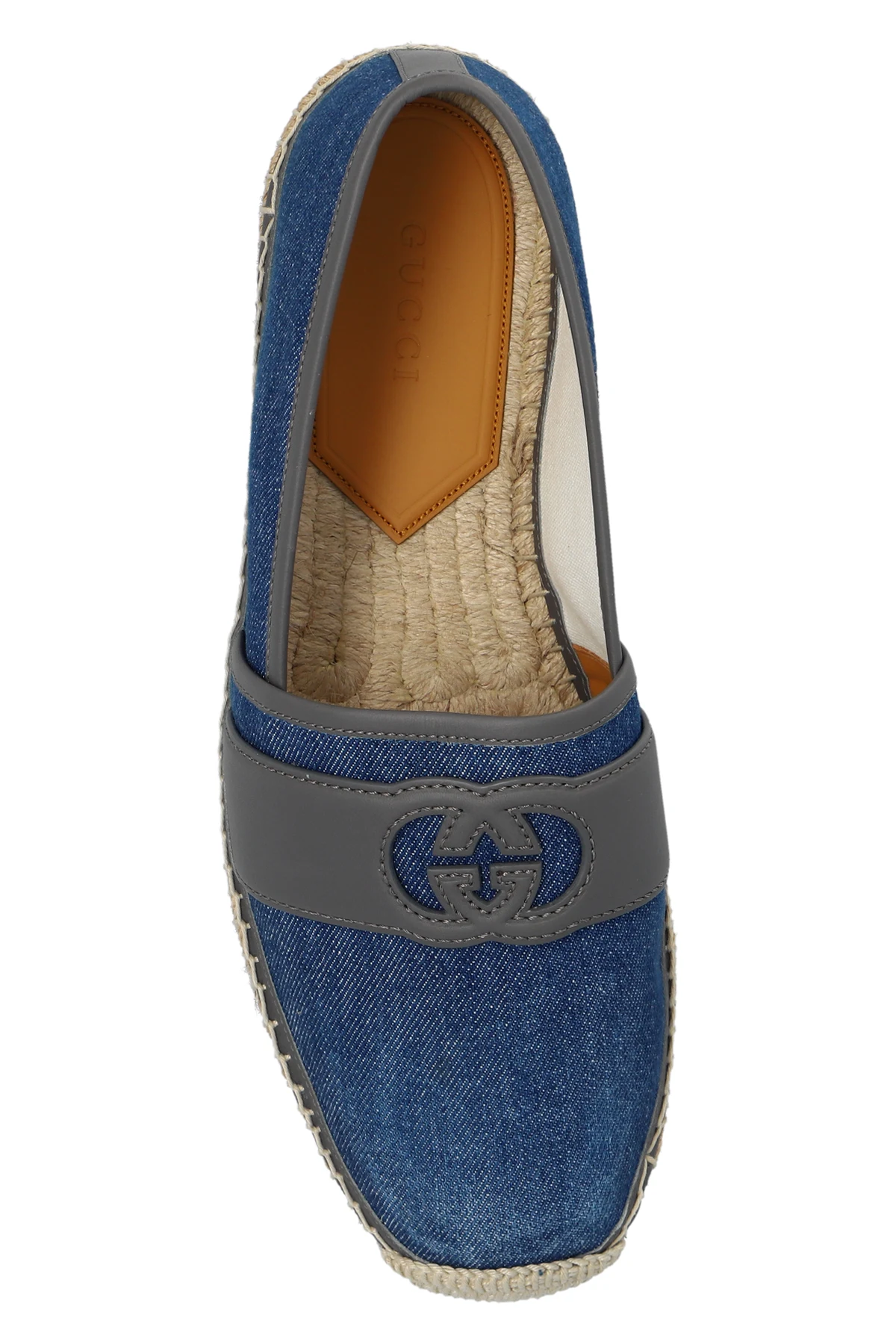Niebieskie, jeansowe espadryle Gucci. Wykończone skórą w kolorze szarym. Z przodu pasek z logo. Beżowa, pleciona podeszwa z juty wykończona gumą.
