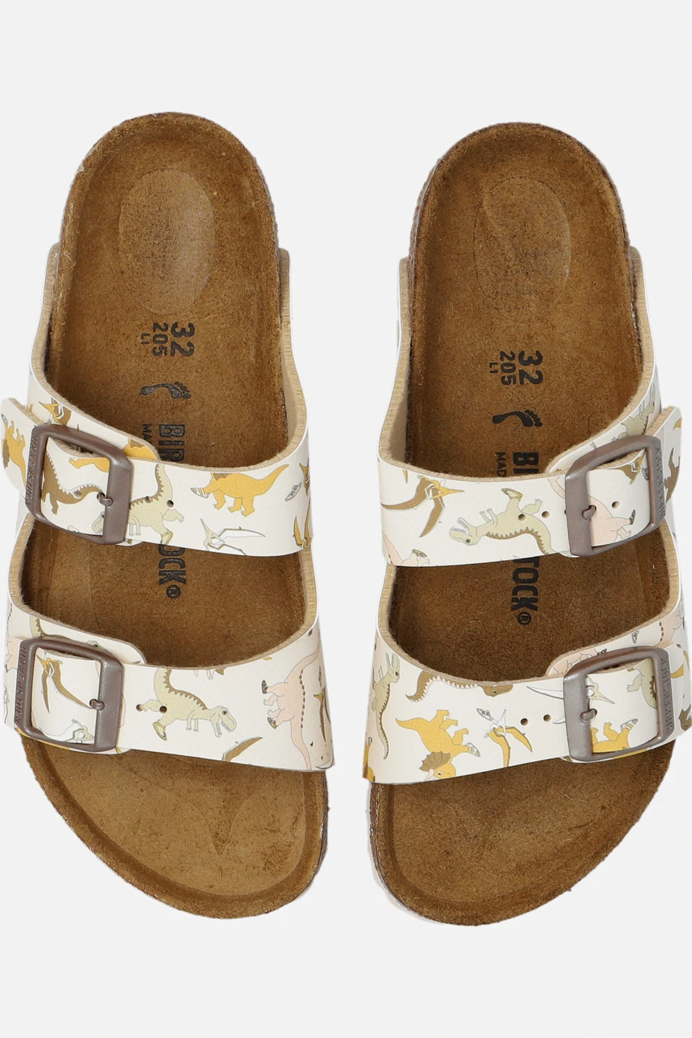 Jasnoróżowe klapki, model ‘Arizona’ Birkenstock Kids. Cholewka o zwężanej szerokości wykonana z wytrzymałego tworzywa sztucznego Birkoflor®. Zapinane na regulowane paski z klamrami w kolorze ciemnego srebra. Ozdobione kolorowym wzorem z motywem dinozaurów. Anatomiczne ukształtowana wkładka korkowo-lateksowa. Brązowa podeszwa z naturalnego korka oraz jasnoróżowej pianki EVA.
