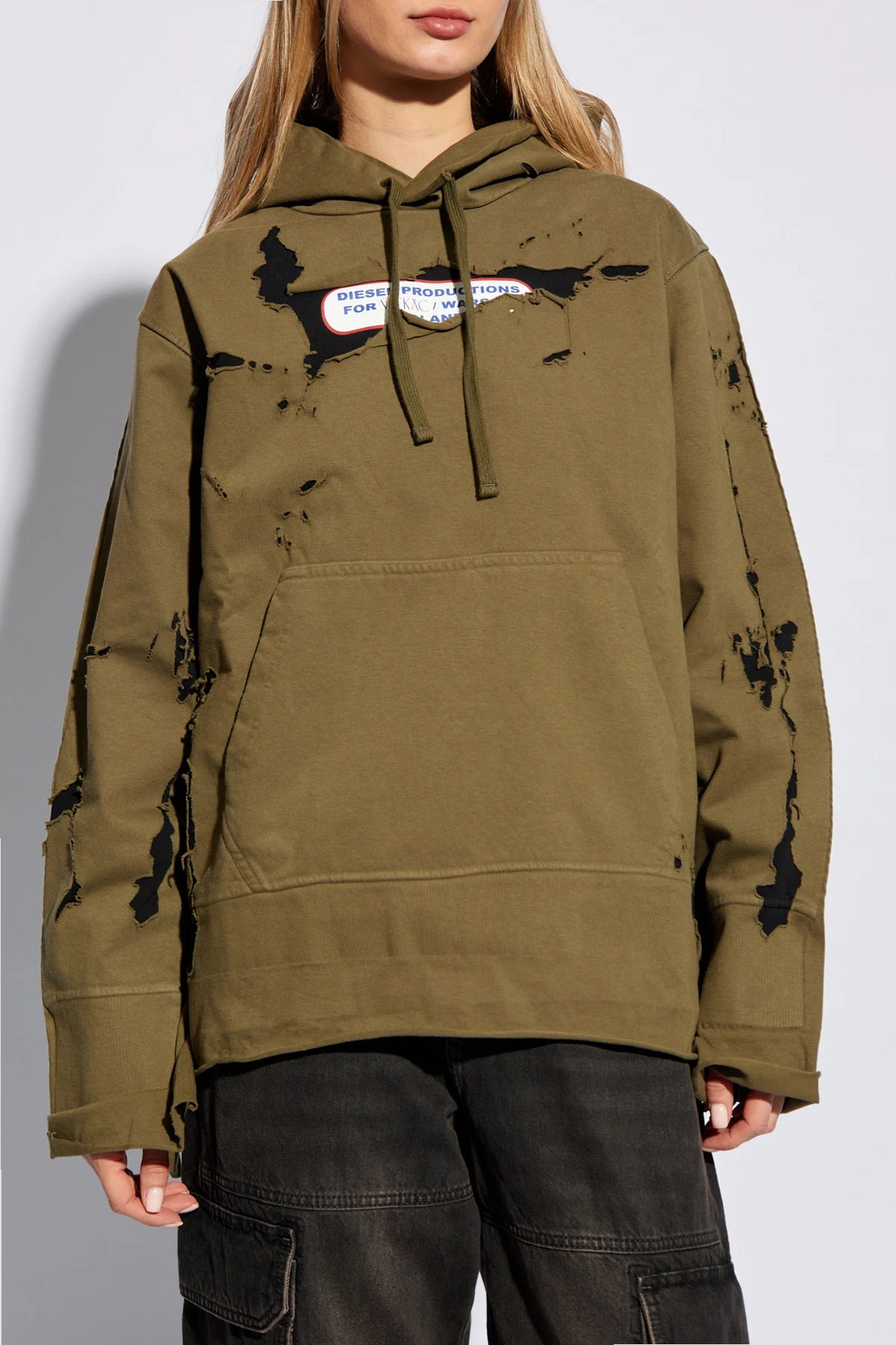 Zielono-czarna bluza, model ‘VK-S-MACS-HOODOFF’ Diesel. Wykonana z bawełny. Ozdobiona nadrukowanym wzorem w kolorze biało-granatowo-czerwonym oraz efektem znoszenia. Kaptur ściągany trokami. Wsuwana kieszeń. Dół i długie rękawy wykończone ściągaczem.