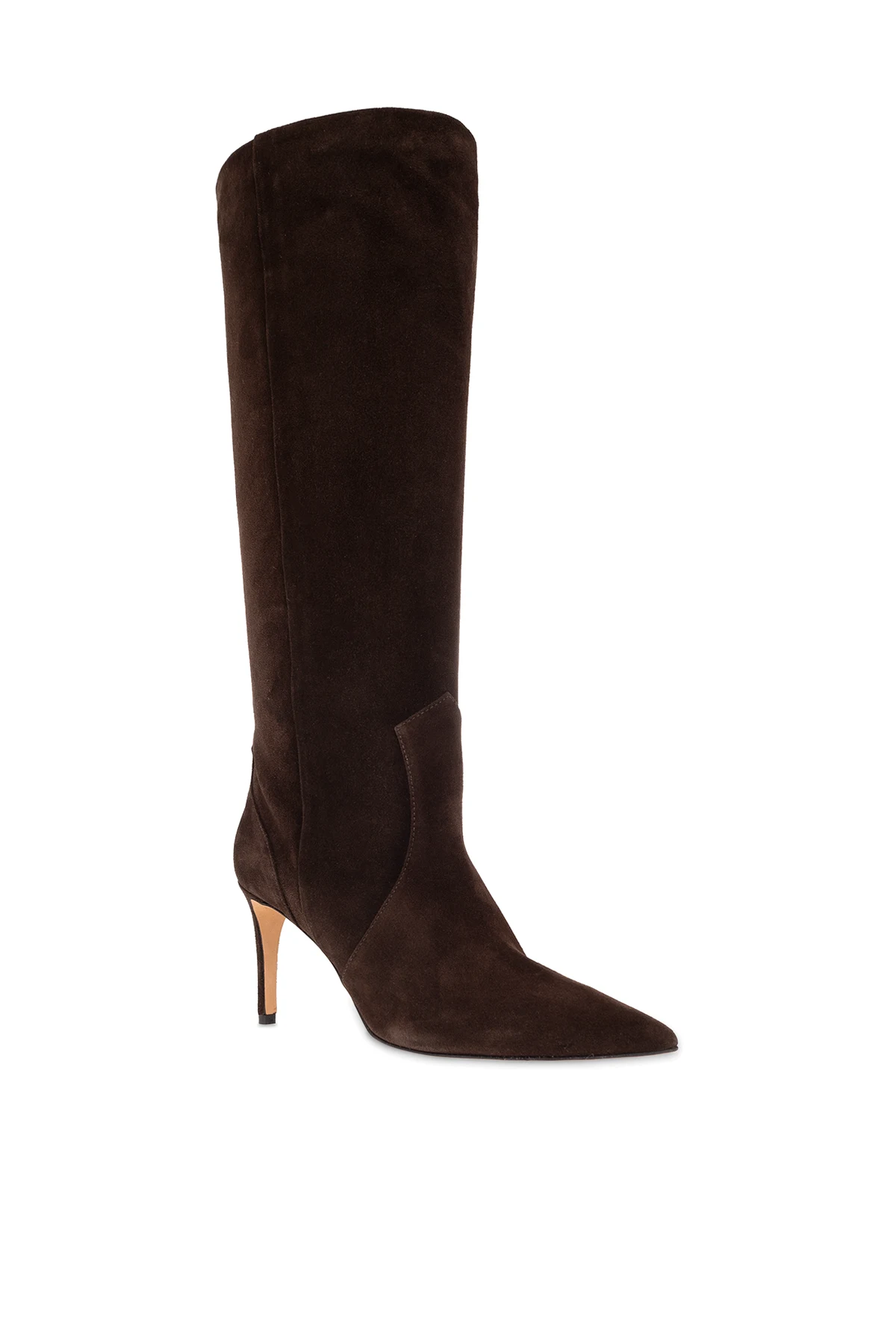 Brązowe, wsuwane kozaki na obcasie, model ‘Davyn’ Iro. Wykonane z zamszu. Nosek w szpic. Brązowa, skórzana podeszwa.