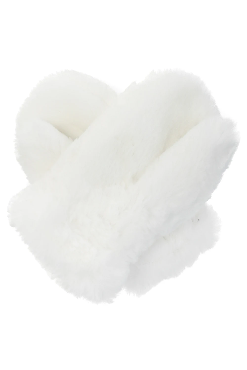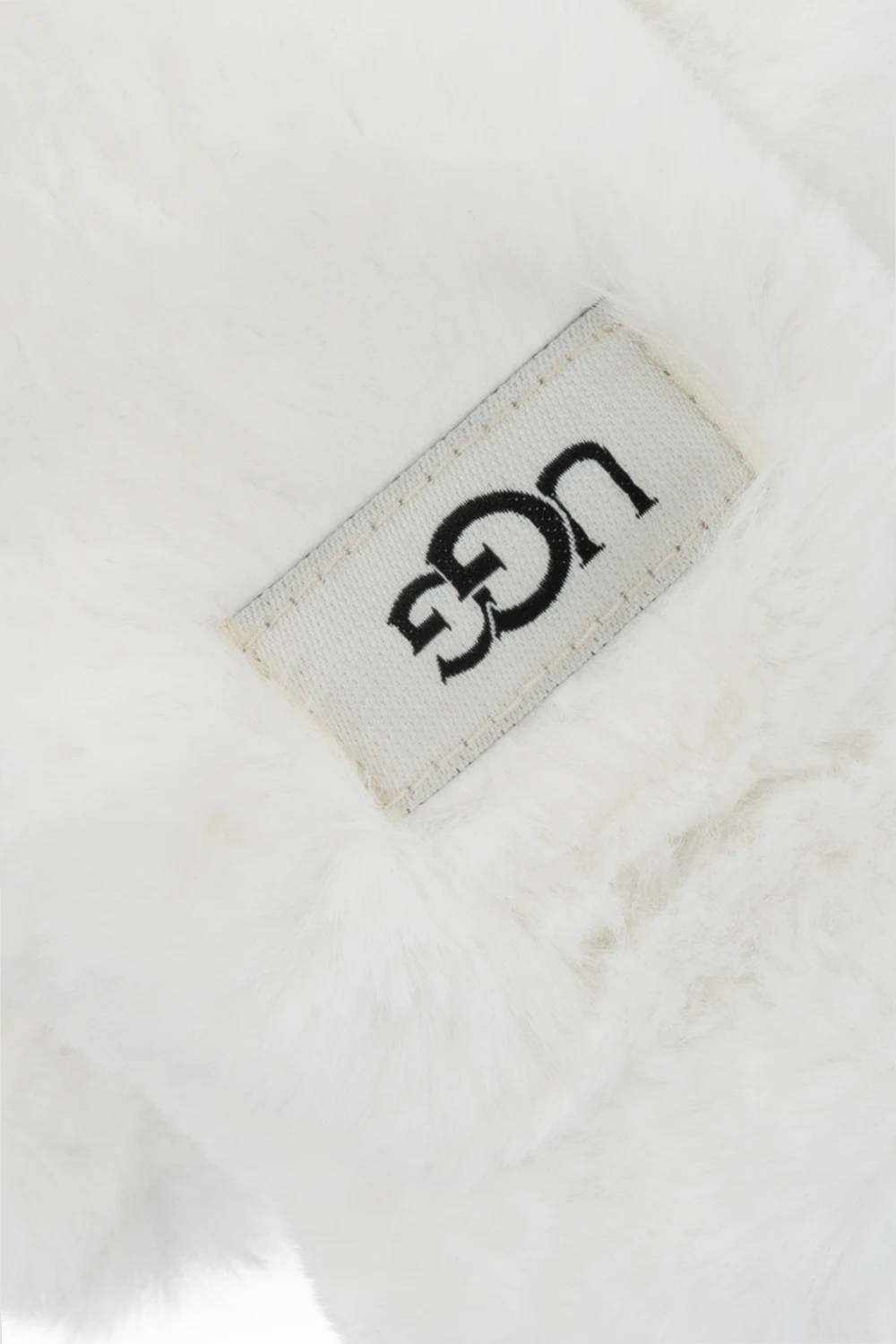 Białe rękawice UGG Kids. Wykonane z materiału imitującego futro. Ozdobione biało-czarną naszywką z logo.