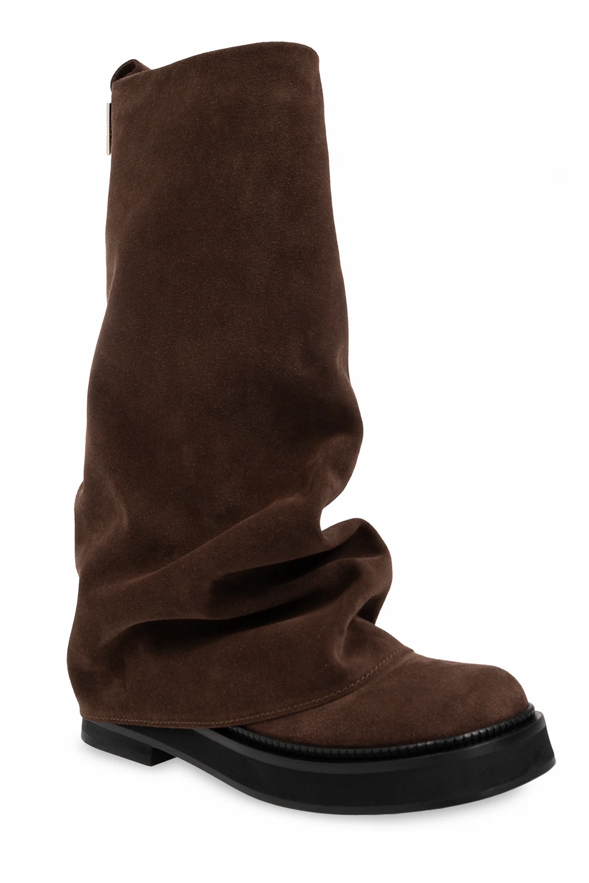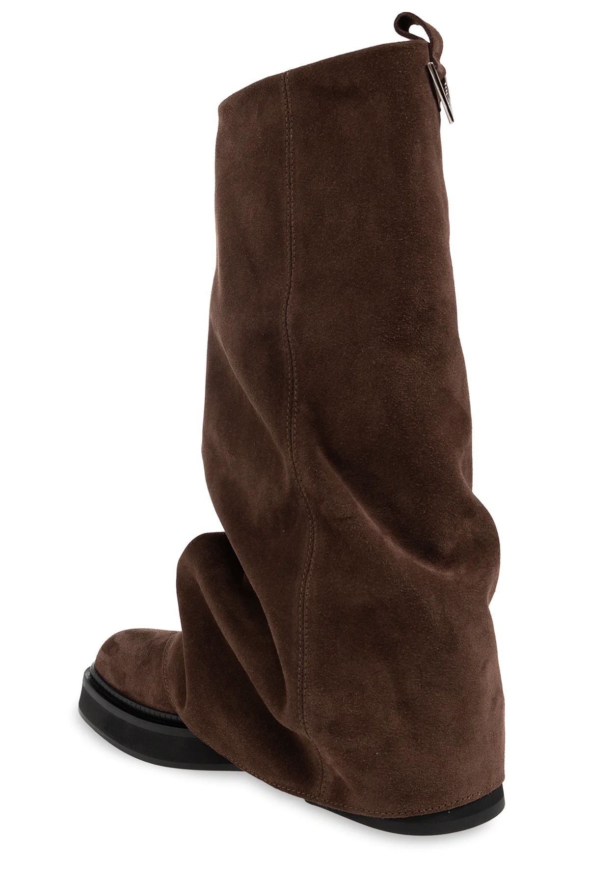 Brązowe, wsuwane kozaki, model 'Robin’ The Attico. Wykonane z zamszu. Kwadratowy nosek. Z tyłu metalowa aplikacja w kształcie logo w kolorze srebrnym. Czarna, skórzana podeszwa wykończona gumą.