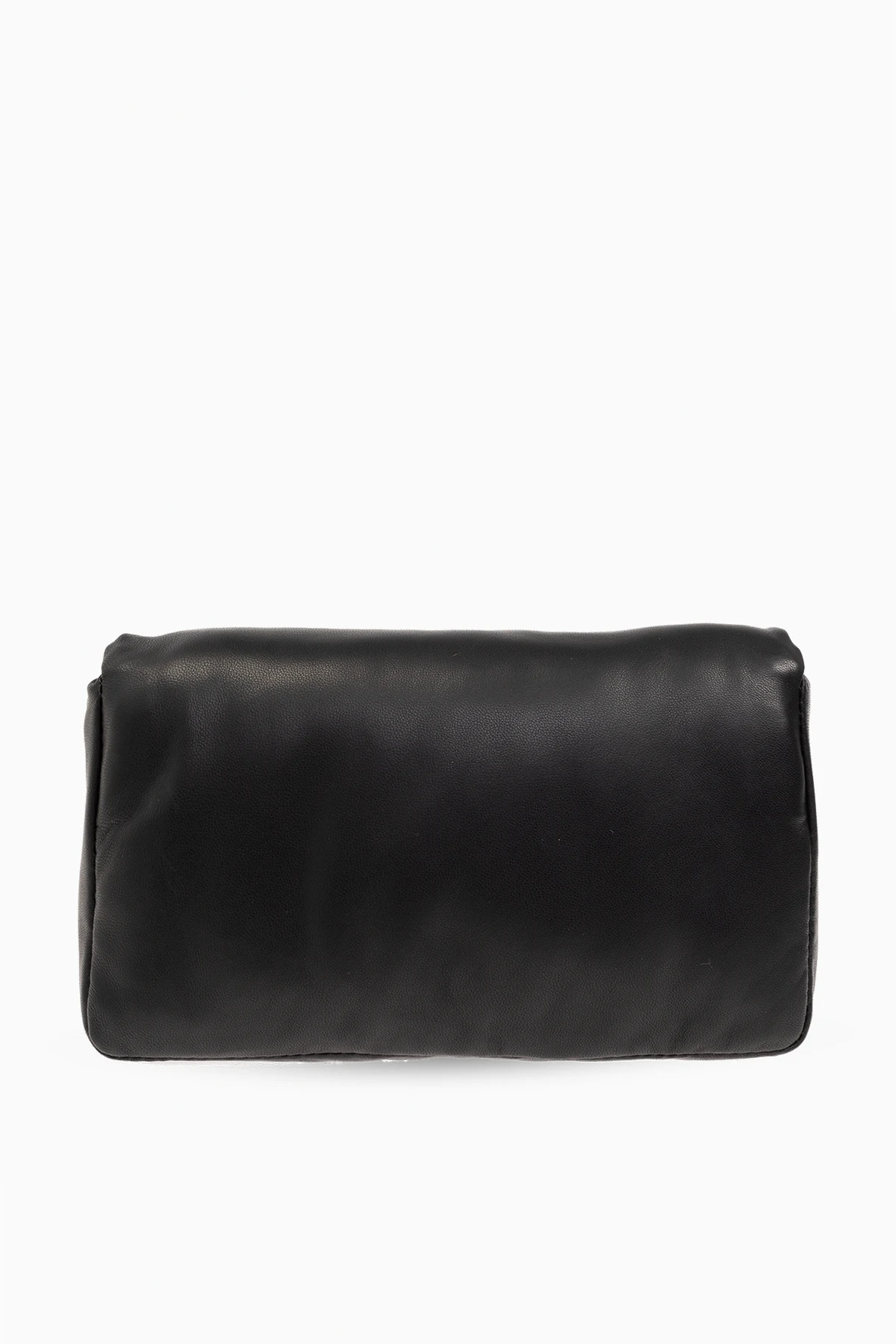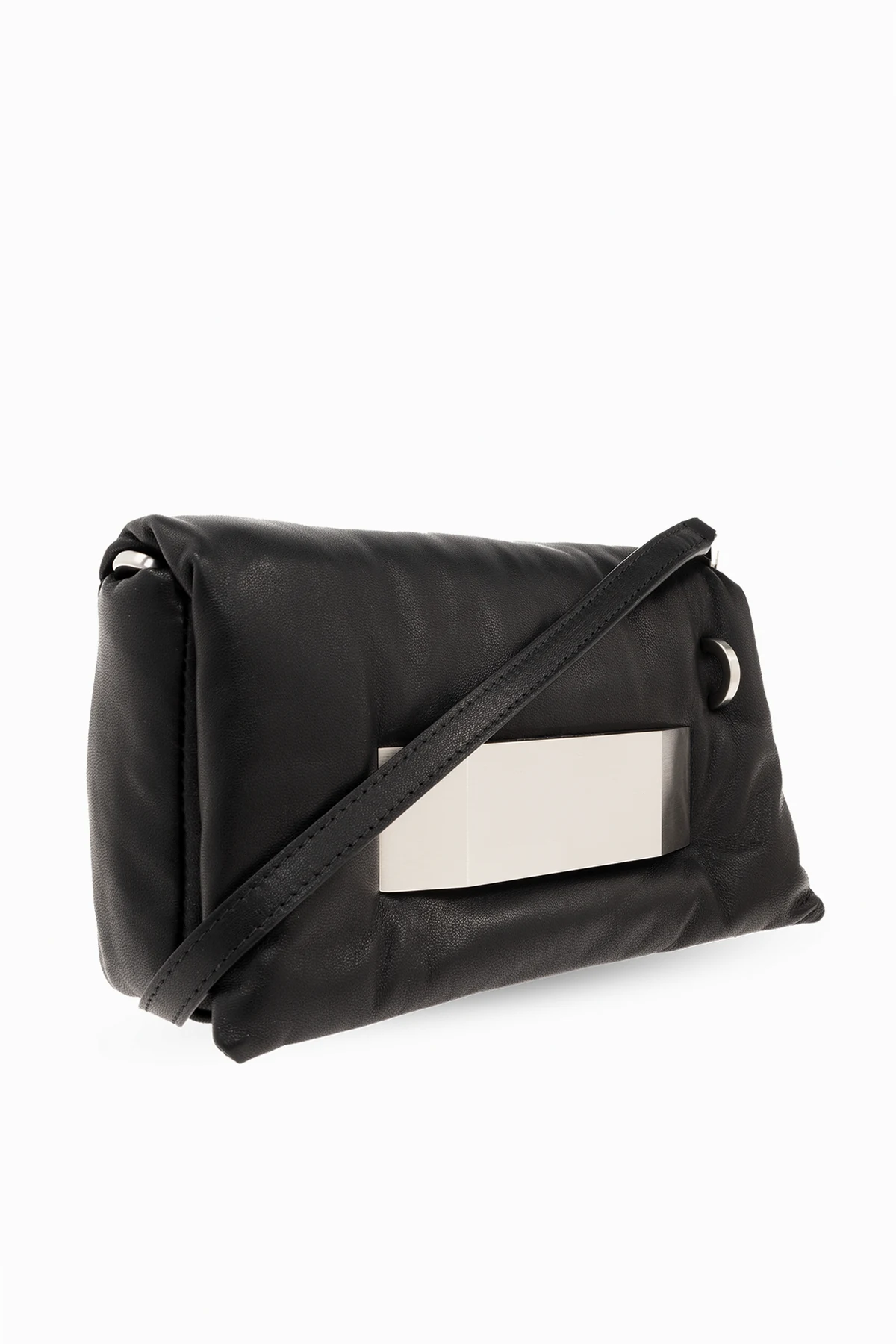 Czarna torba na ramię, model ‘Pillow Griffin’ Rick Owens. Wykonana ze skóry jagnięcej. Ozdobiona aplikacją z logo Magnetyczne zamknięcie. Odpinany pas na ramię. Wewnątrz komora, sześć miejsc na karty, kieszeń wsuwana i zamykana na zamek. Metalowe wykończenie w kolorze srebrnym.