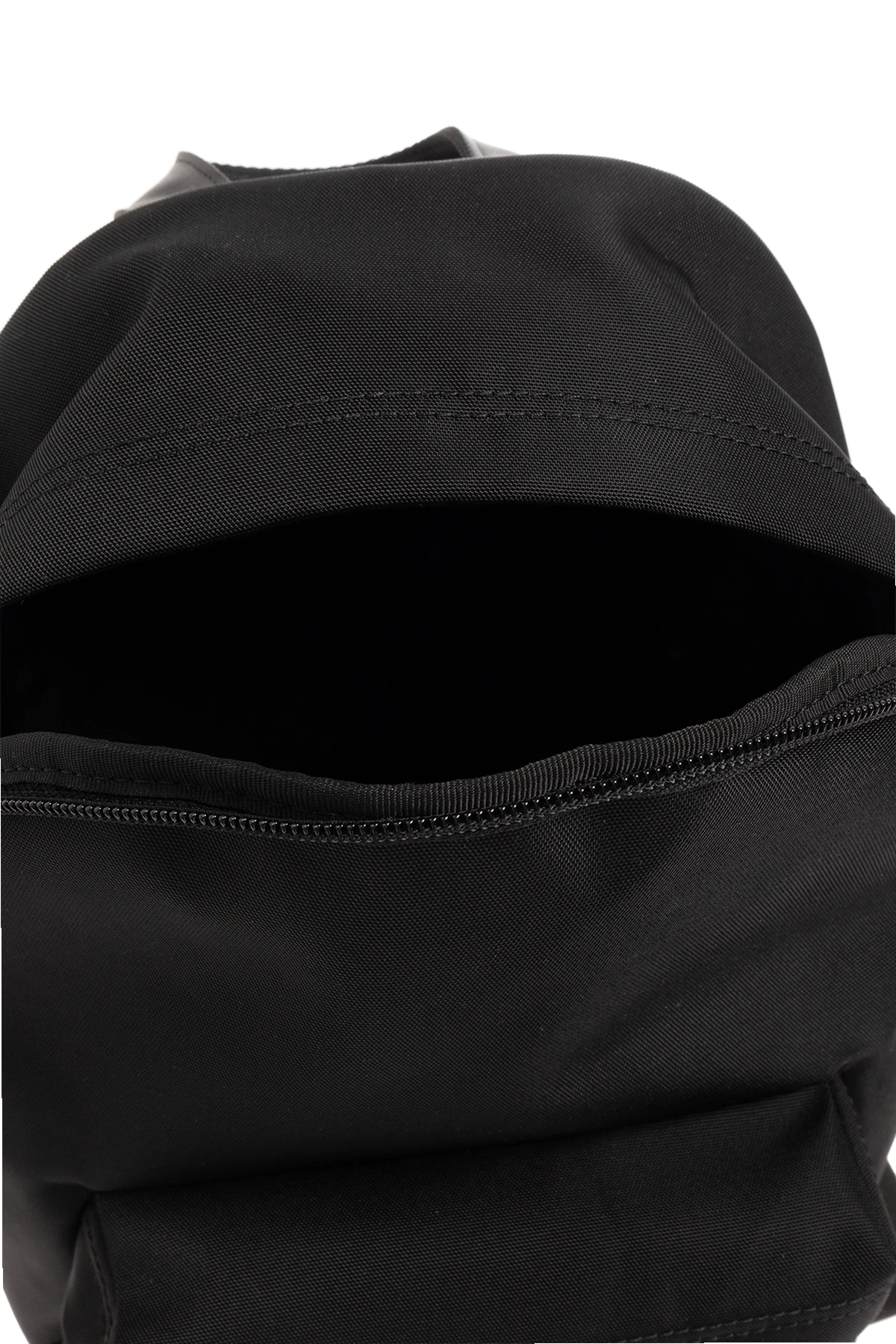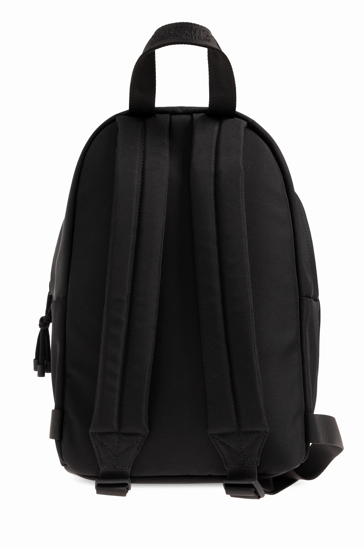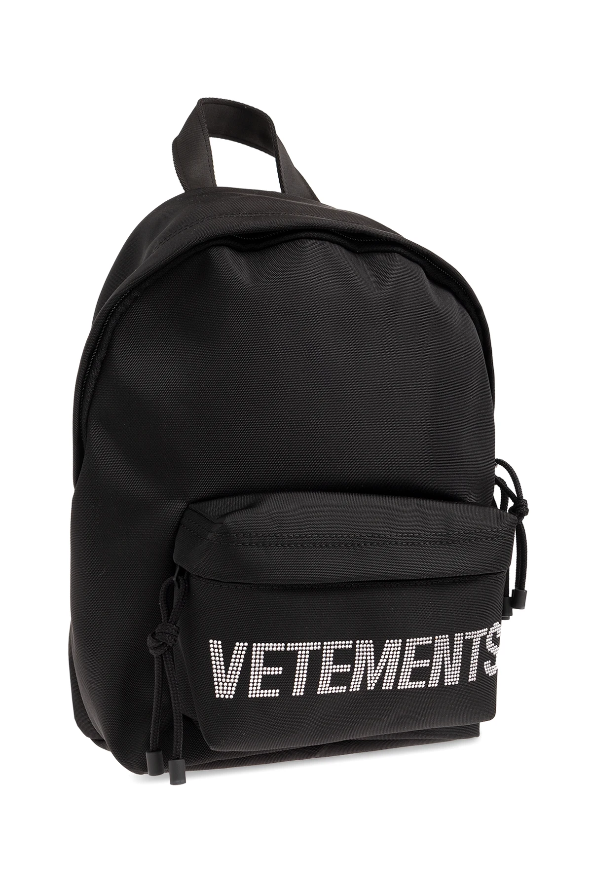 Czarny plecak VETEMENTS. Zamykany na dwubiegunowy zamek. Ozdobiony logo wykończonym połyskującymi kryształami. Kieszeń zamykana na zamek. Półokrągła rączka. Szelki z możliwością regulacji długości. Wewnątrz komora. Metalowe elementy w kolorze czarnym.