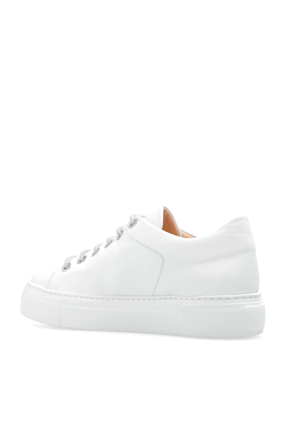 Białe, sznurowane buty sportowe na platformie, model ‘Crystal’ AGL. Wykonane ze skóry. Dekoracyjne sznurowadła wykończone połyskującymi kryształami. Biała, gumowa podeszwa.