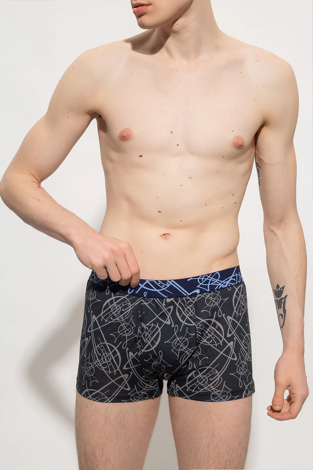 Czarno-szare bokserki, model ‘Graffiti Orb’ Vivienne Westwood, kolekcja ‘Underwear’. Wykonane z bawełny. W pasie wszyta guma w kolorze granatowo-niebieskim.