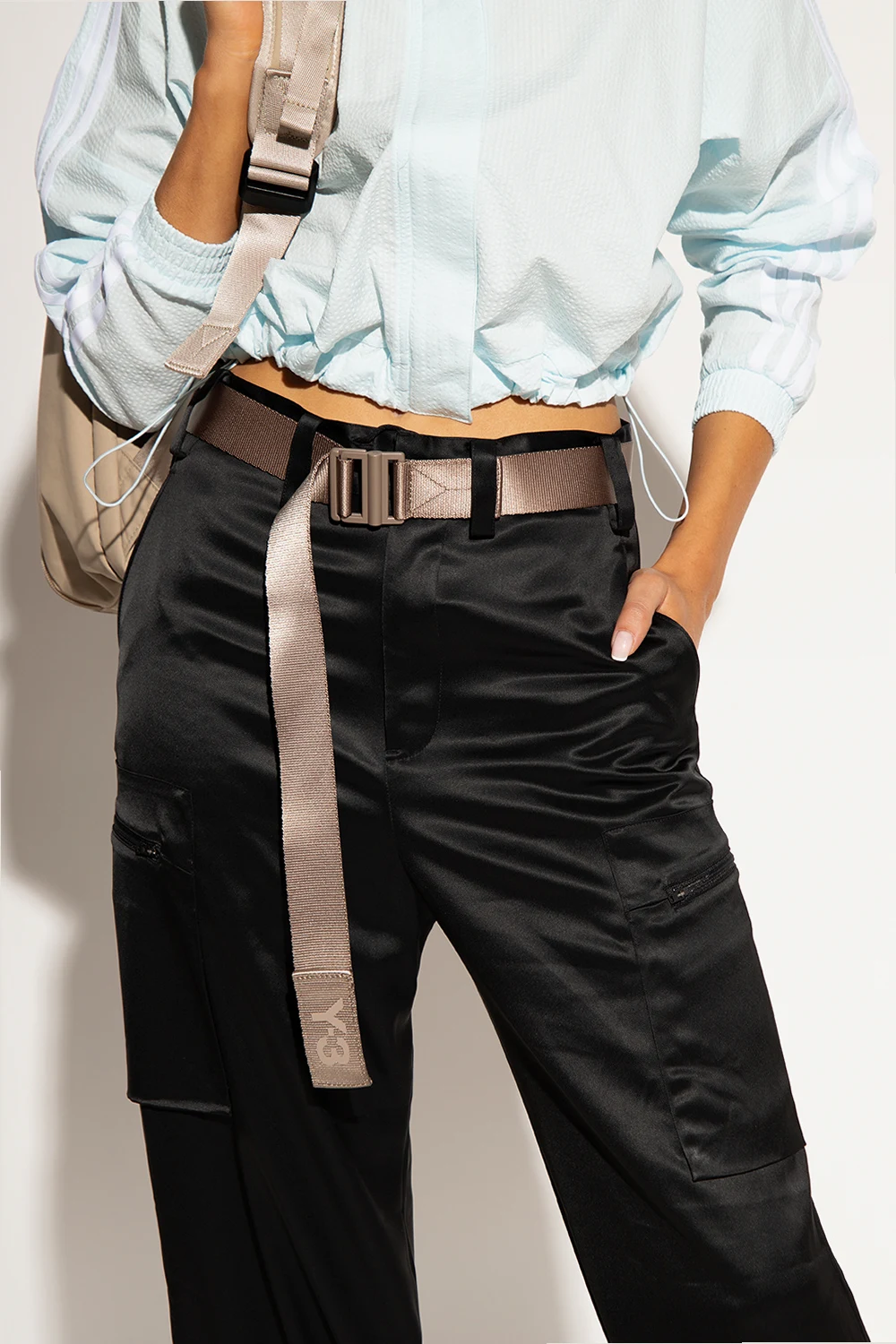 Szarobeżowy pasek Y-3 Yohji Yamamoto. Ozdobiony nadrukiem z czarnym oraz szarobeżowym logo. Wykończony pomarańczową klamrą.