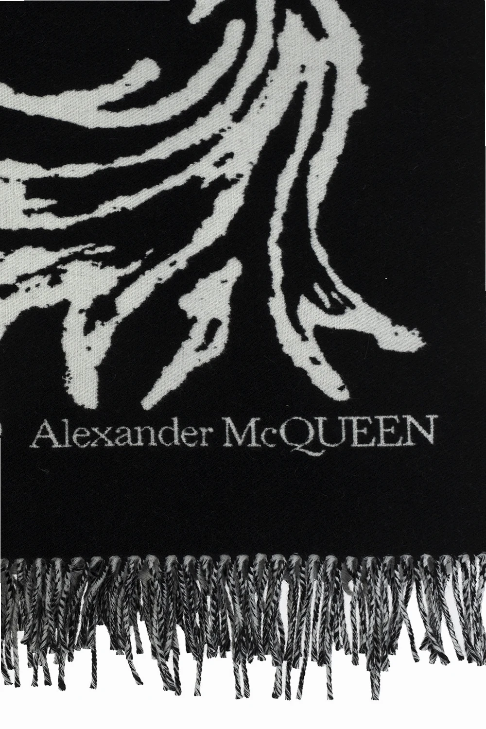 Czarno-biały koc Alexander McQueen. Wykonany z wełny. Ozdobiony wzorem oraz logo. Brzegi wykończone frędzlami.