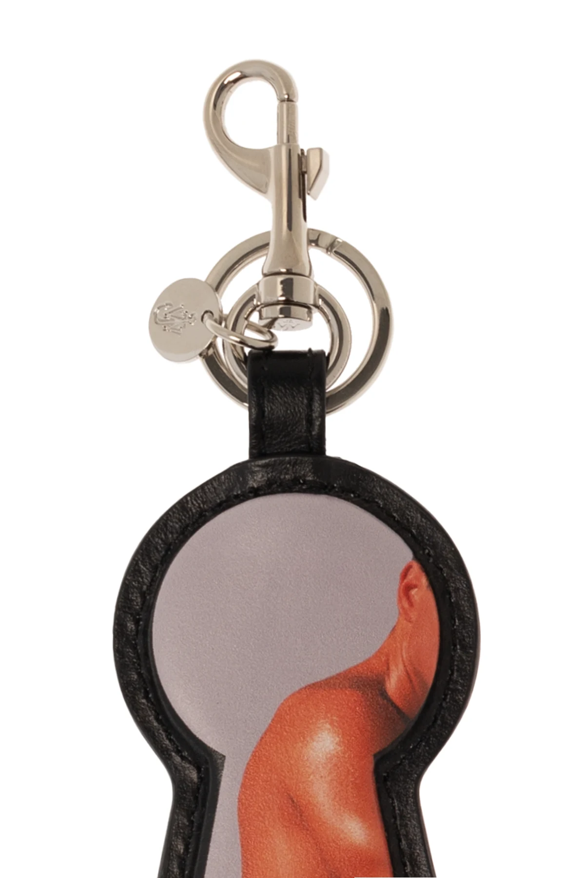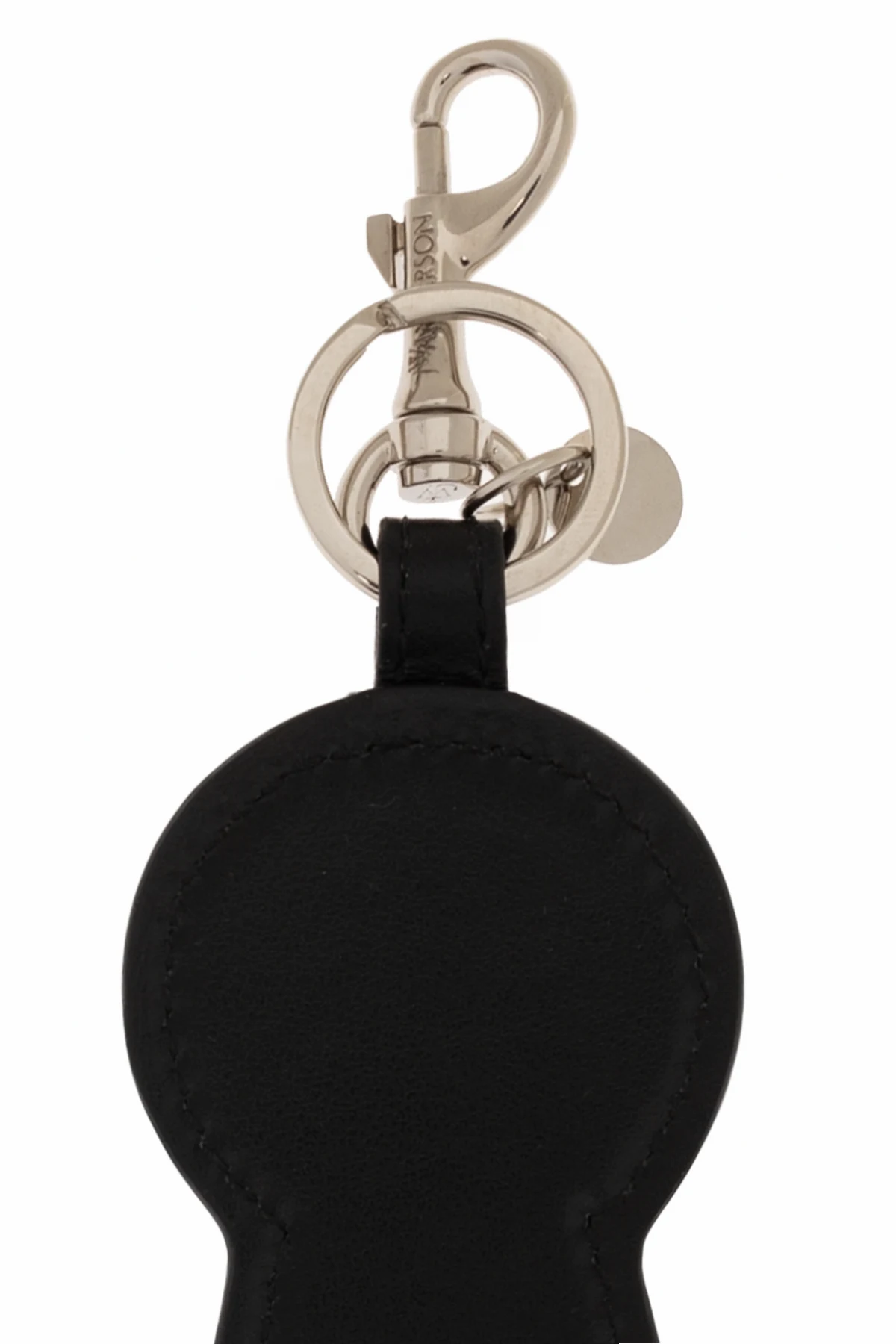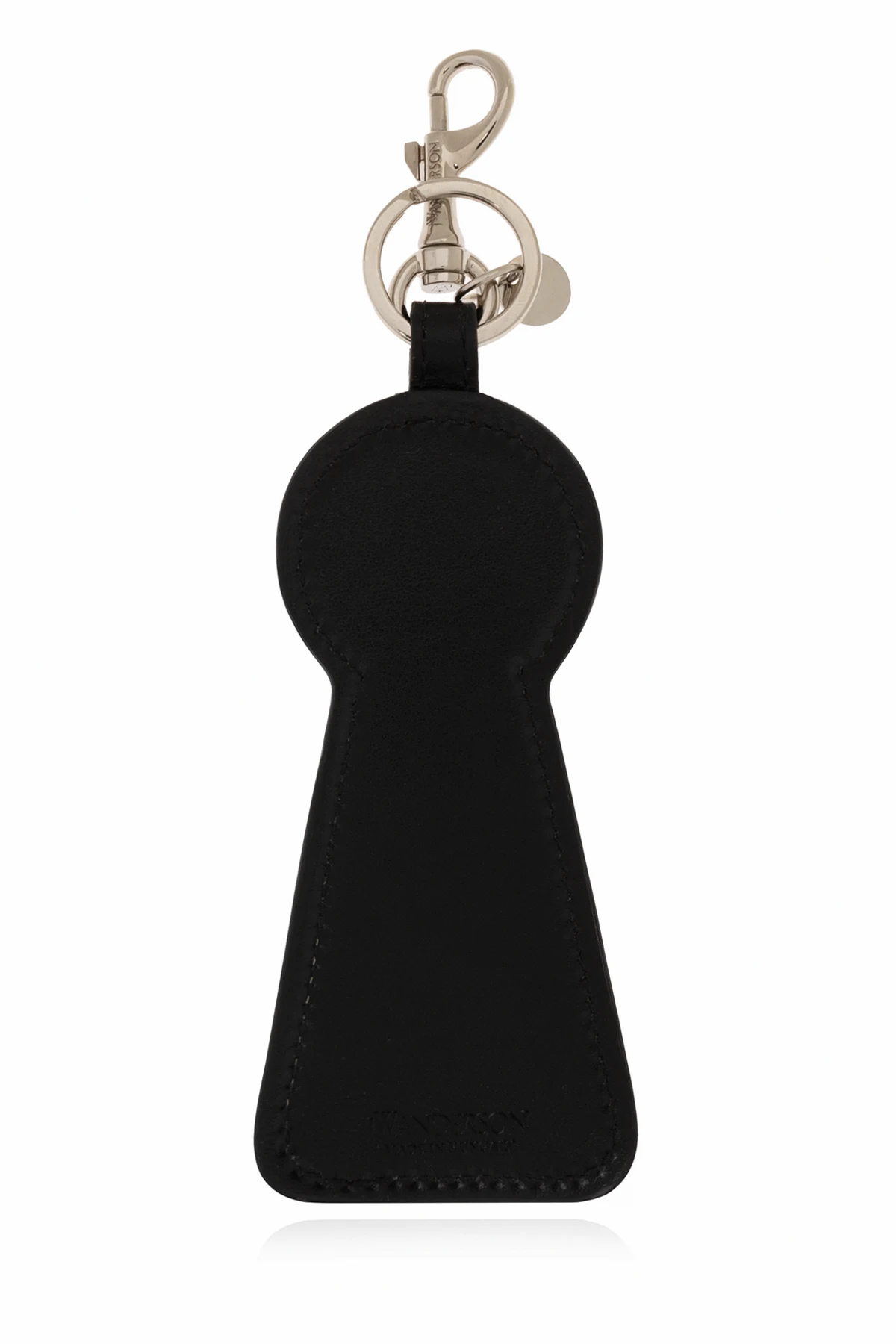 Czarny brelok w kształcie dziurki od klucza JW Anderson. Wykonany ze skóry cielęcej. Ozdobiony kolorowym nadrukiem i wytłoczonym logo. Metalowe elementy w kolorze srebrnym.