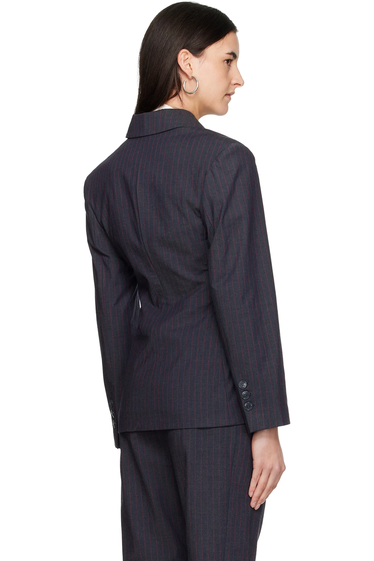 Szara marynarka Ganni. Częściowo wykonana z materiałów pochodzących z recyklingu. Zapinana na guziki. Ozdobiona wzorem w jasnoszare prążki. W ramionach wszyta poduszka. Z przodu dwie kieszenie. Długie rękawy.