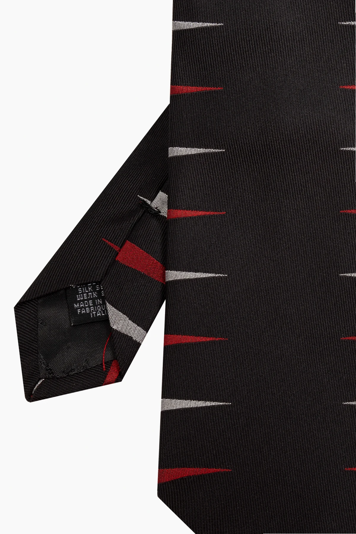 Krawat posiada klasyczny, szeroki kształt z wąskim końcem, co nadaje mu ponadczasowy charakter. Na czarnym tle znajduje się powtarzający się wzór z krótkich, pionowych linii w kolorach czerwonym i srebrnym, układających się naprzemiennie, co dodaje mu wyrafinowanej elegancji.