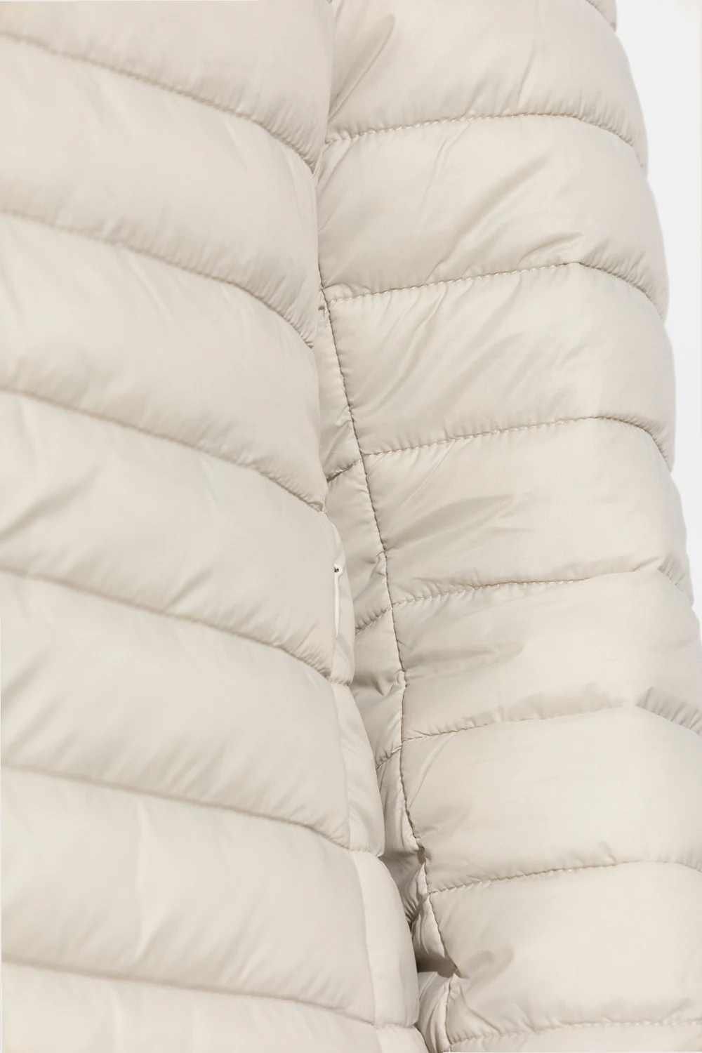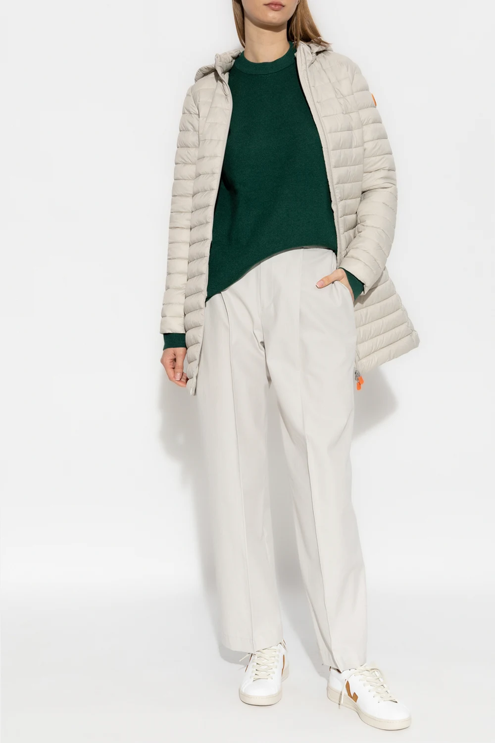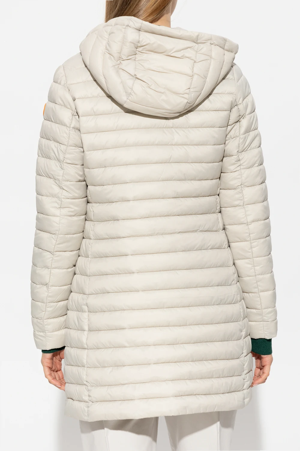 Jasnoszara, pikowana kurtka, model ‘Bryanna’ Save The Duck. Zapinana na dwubiegunowy zamek. Z przodu dwie kieszenie zapinane na zamek. Odpinany kaptur ściągany trokami. Długie rękawy, na jednym gumowa naszywka z logo.