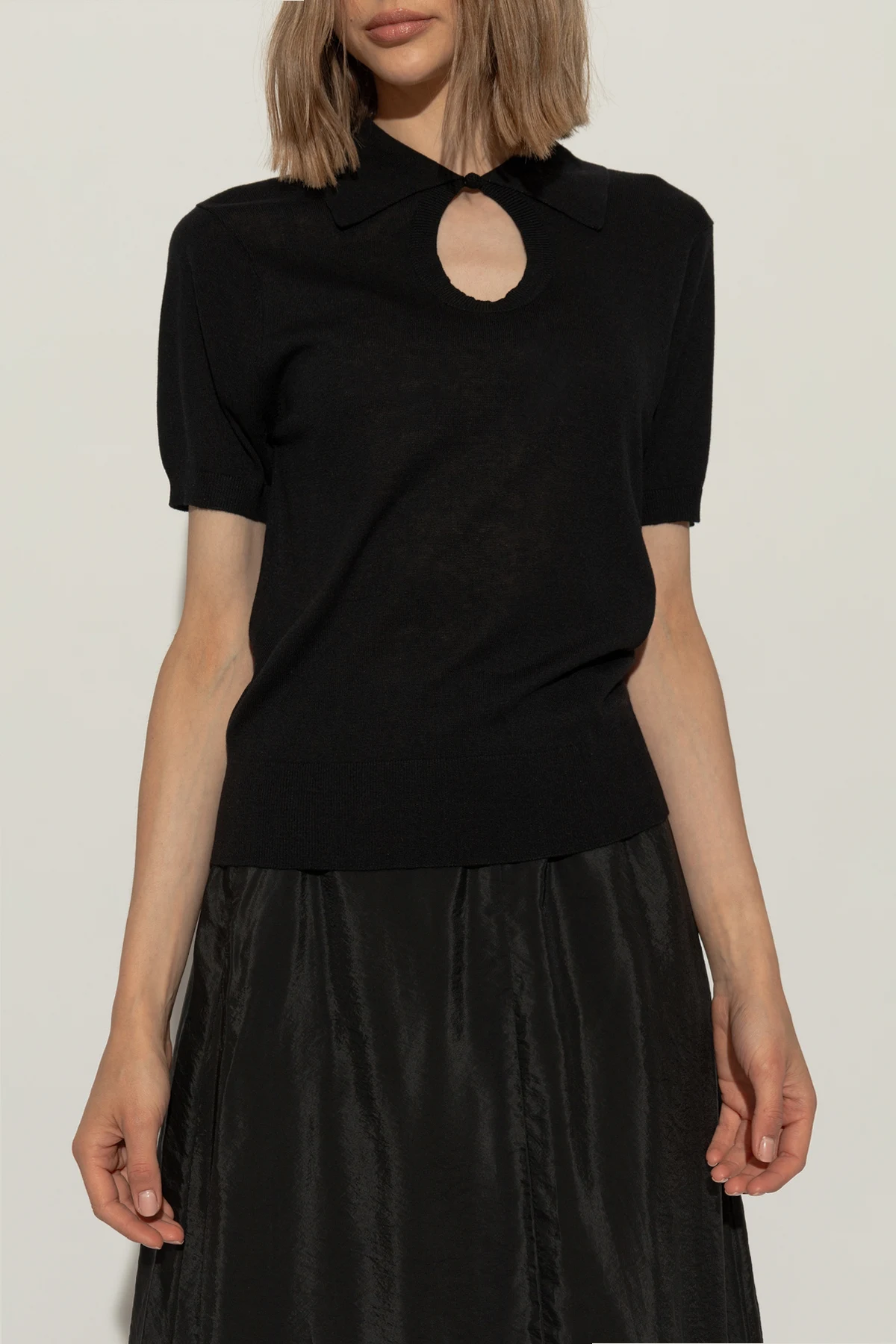 Charakterystyczny, zwijany kołnierzyk nadaje koszulce klasyczny wygląd typowy dla modeli polo, zaś mały, okrągły dekolt dodaje jej nowoczesności. Wykończenie polo guzikiem w dolnej części kołnierzyka umożliwia indywidualne dopasowanie i jest subtelnym, lecz wyrafinowanym szczegółem podkreślającym ekskluzywny charakter koszulki.