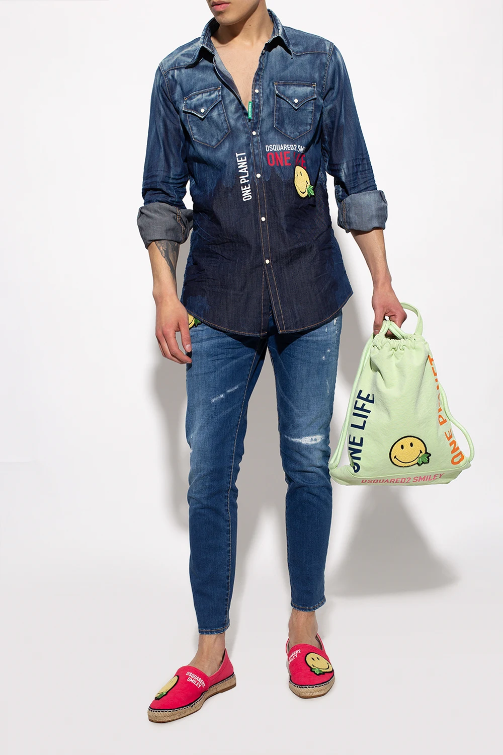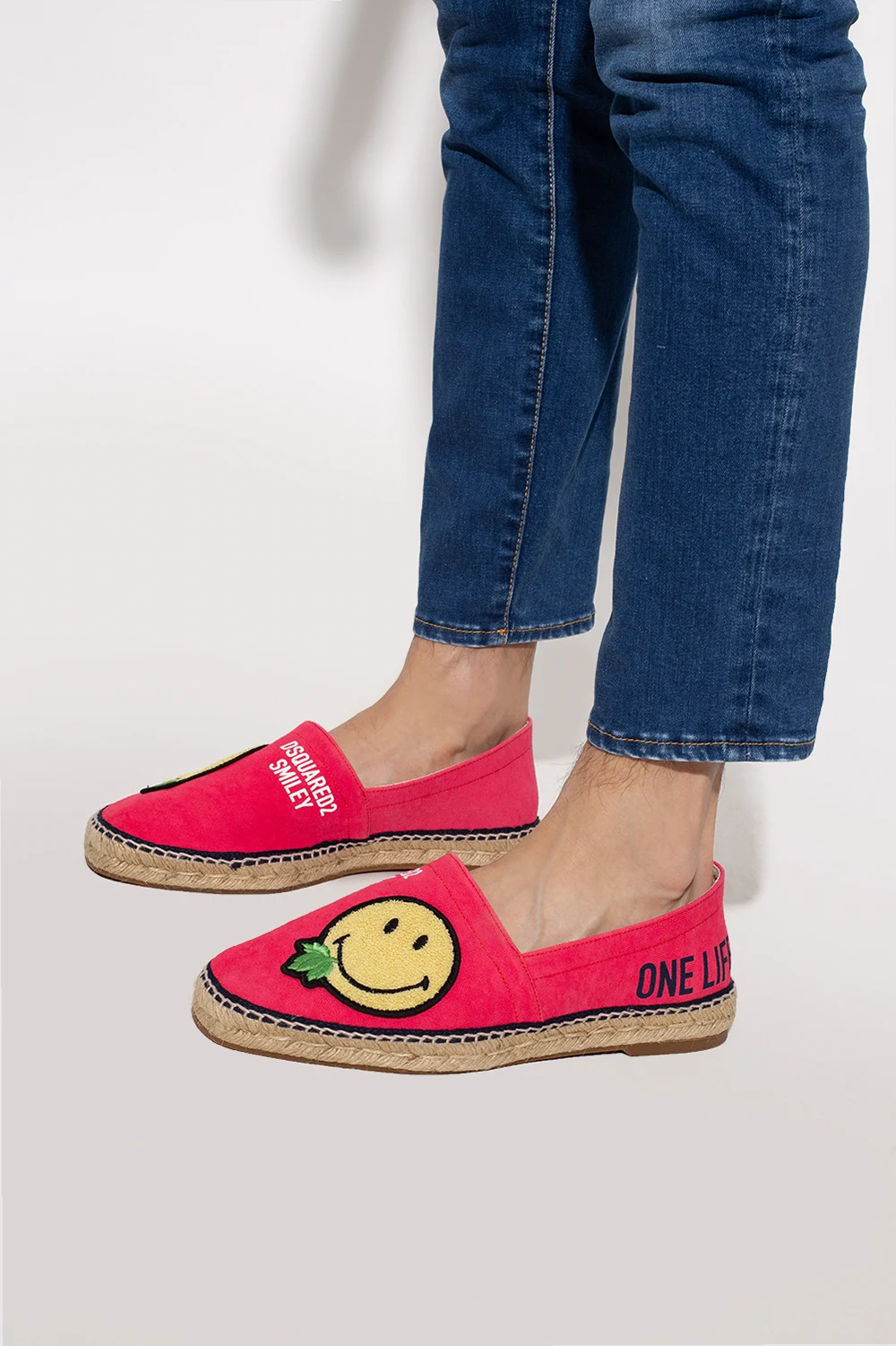Różowe espadryle Dsquared2 x Smiley®, kolekcja ‘One Life One Planet’. Ozdobione kolorową naszywką oraz nadrukiem z logo. Beżowa, gumowa podeszwa wykończona jutą.
