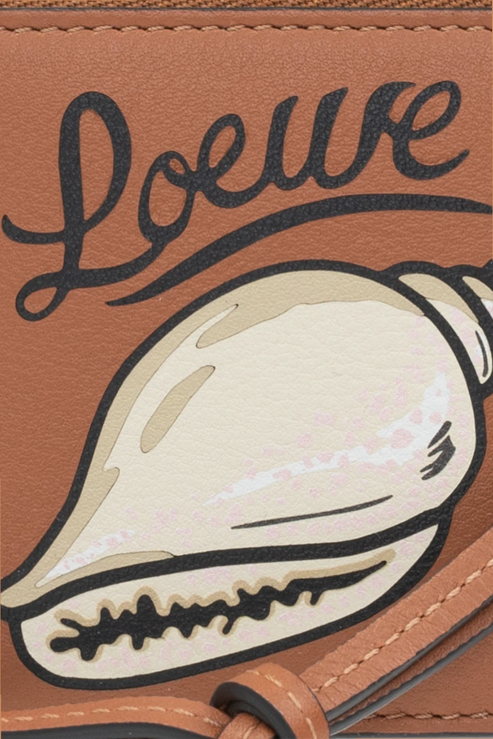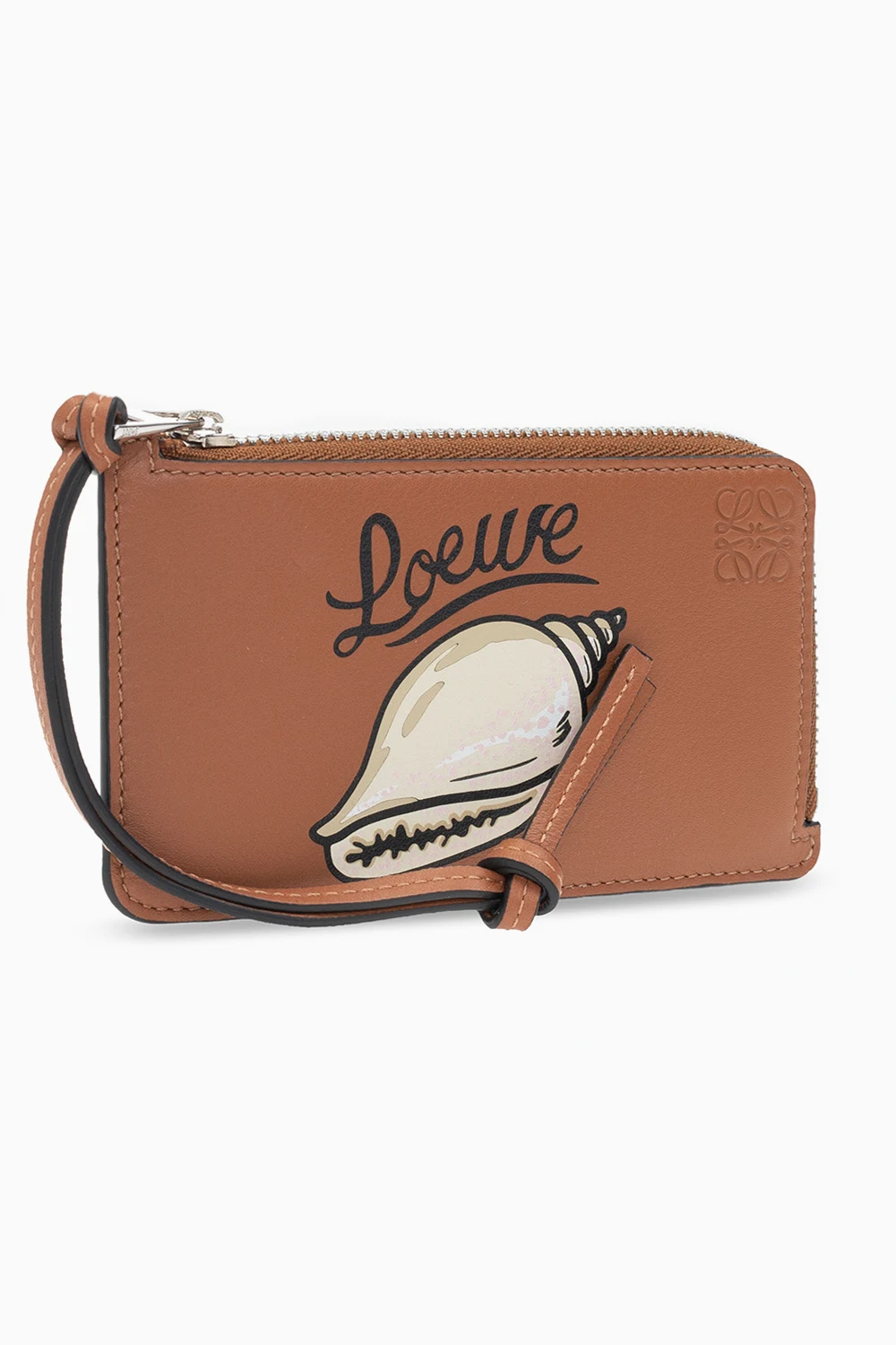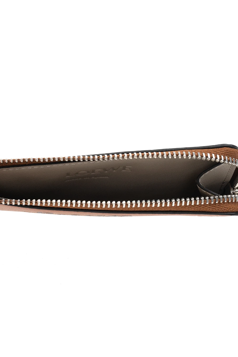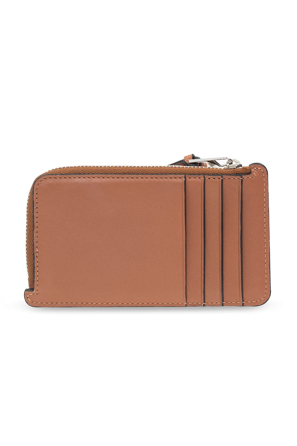 Brązowe etui na karty Loewe x Paula's Ibiza. Wykonane ze skóry. Zamykane na zamek. Ozdobione wytłoczonym i nadrukowanym wzorem oraz logo w kolorze beżowo-czarnym. Cztery wsuwane kieszenie. Wewnątrz komora.