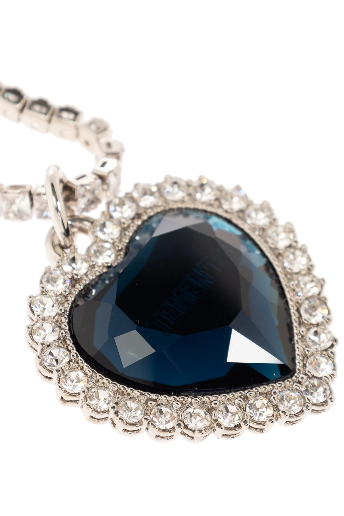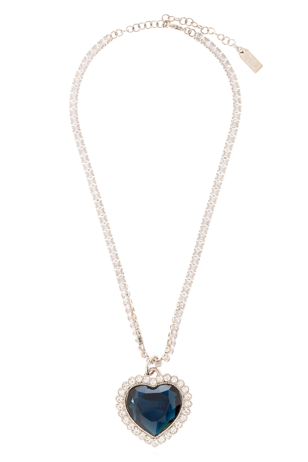 Mosiężny naszyjnik w kolorze srebrnym VETEMENTS. Ozdobiony połyskującymi kryształami. Zawieszka w kształcie serca z niebieskim kryształem. Regulowane zapięcie na karabińczyk.
