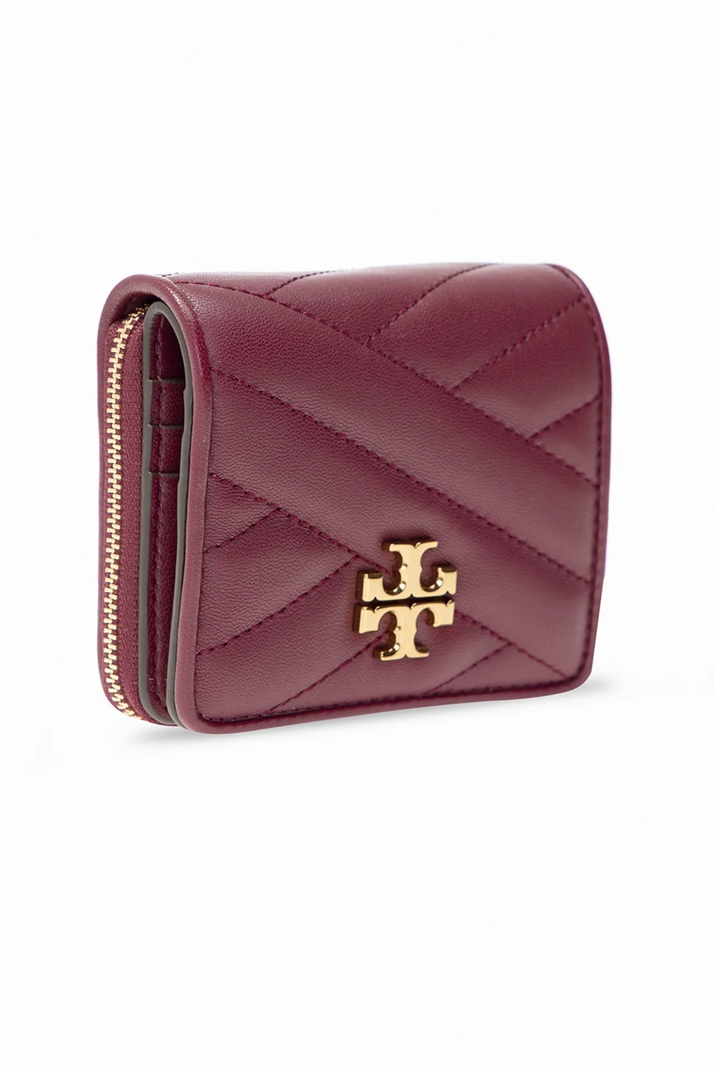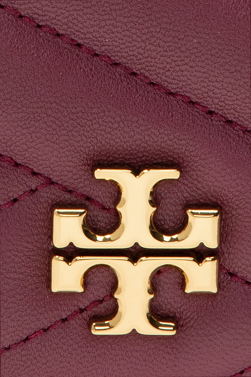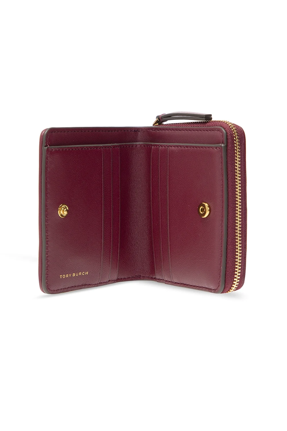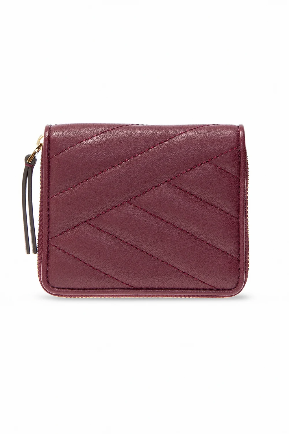 Bordowy portfel, model 'Kira' Tory Burch. Wykonany ze skóry jagnięcej o specjalnej fakturze. Zamykany na zatrzask. Ozdobiony metalową aplikacją z logo w kolorze złotym. Wewnątrz sześć miejsc na karty, kieszeń na banknoty oraz kieszeń na monety zamykana na zamek.