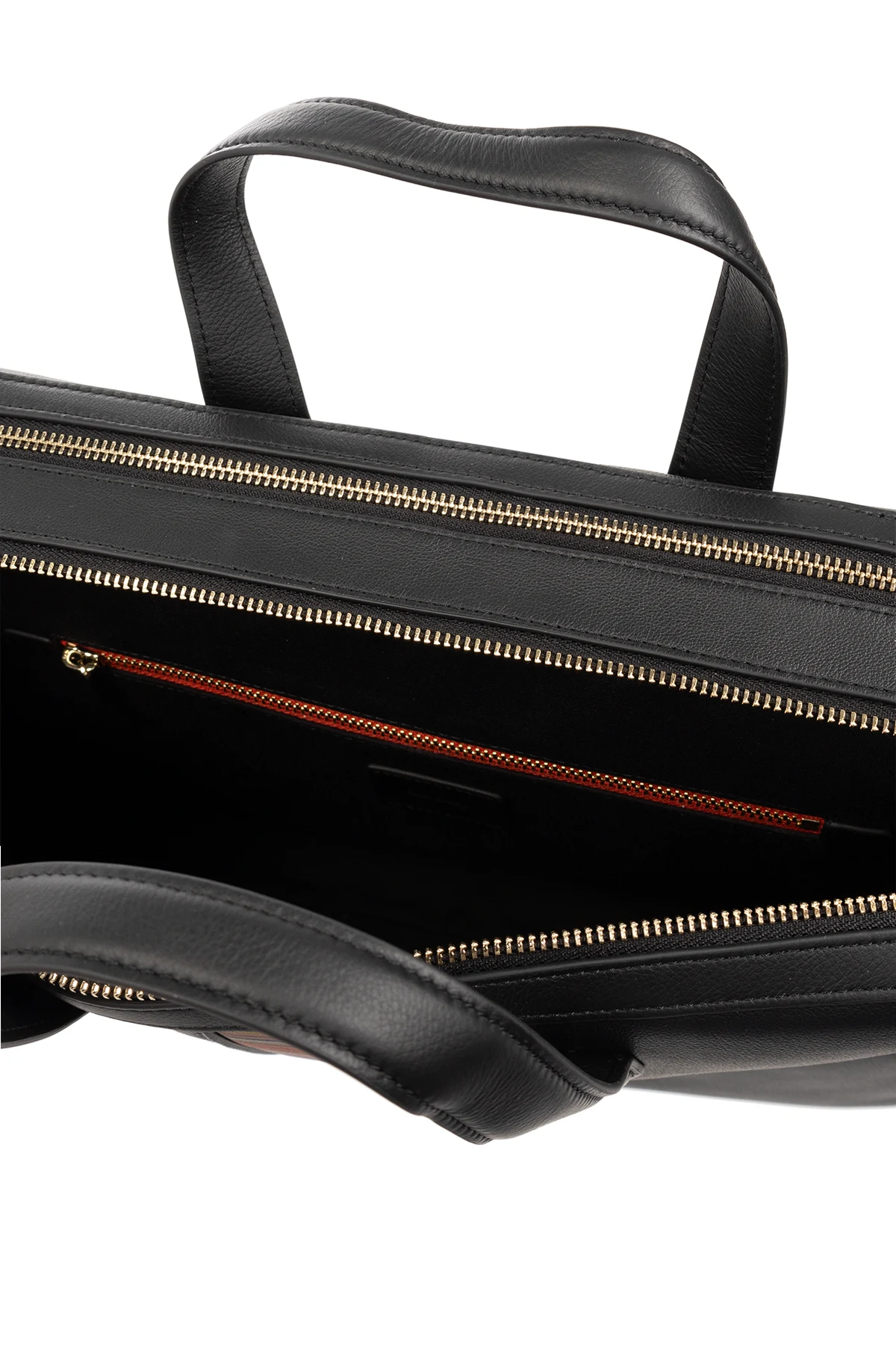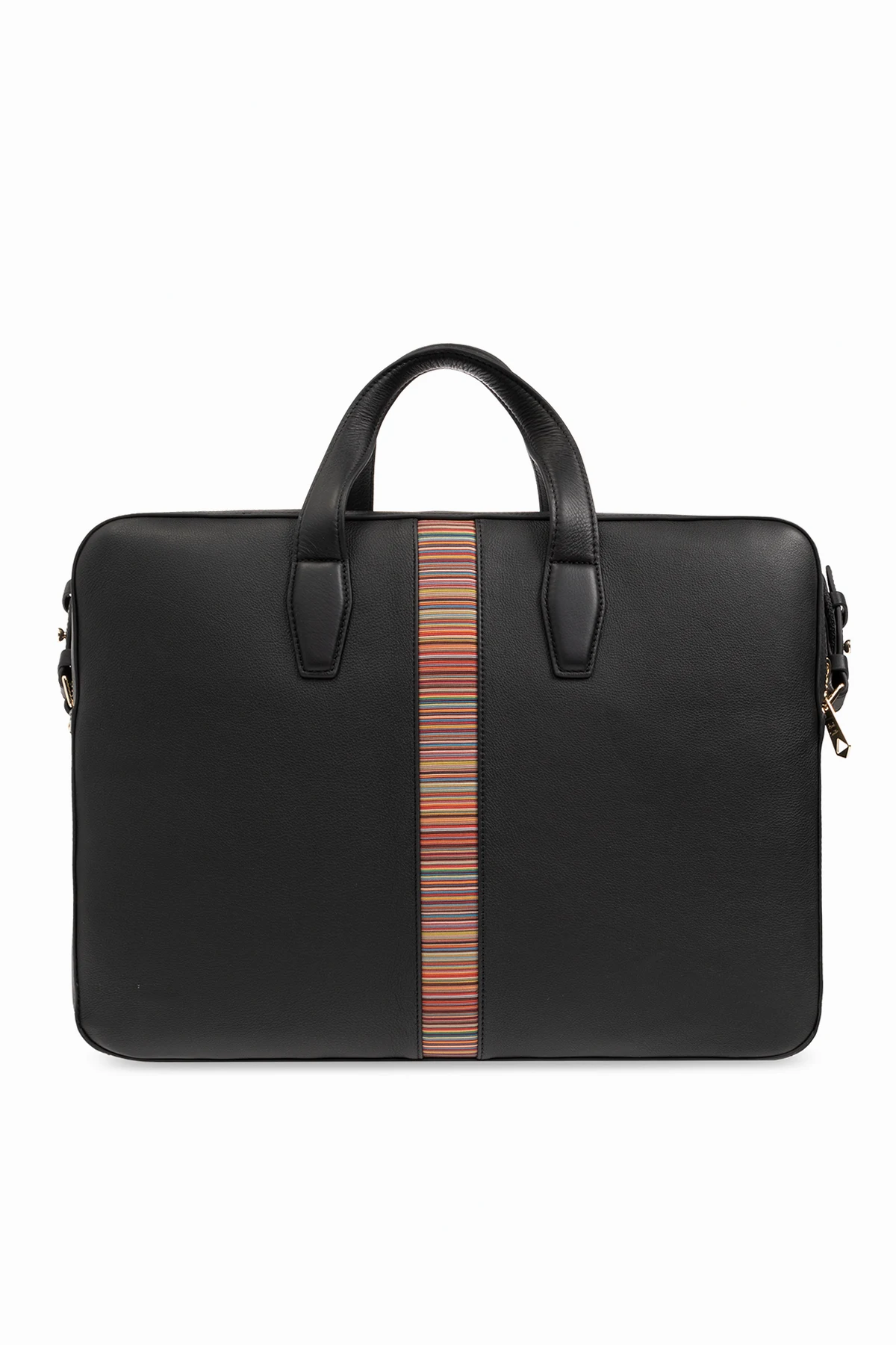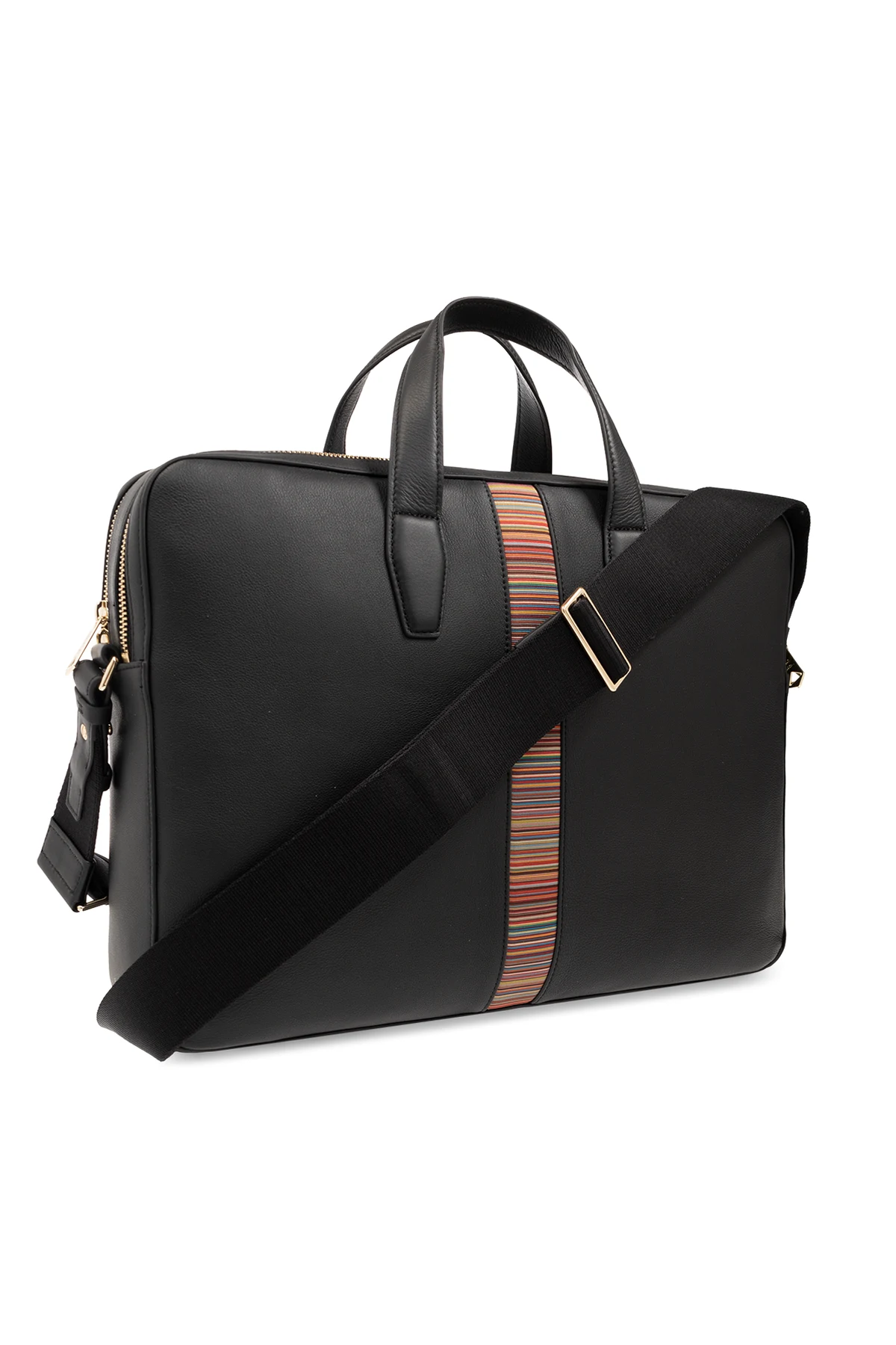 Czarna torba na laptopa Paul Smith. Wykonana ze skóry. Zamykana na dwubiegunowy zamek. Ozdobiona kolorowym wzorem w paski. Dwie półokrągłe rączki. Regulowany pas na ramię. Wewnątrz dwie komory: jedna z kieszenią zamykaną na zamek.