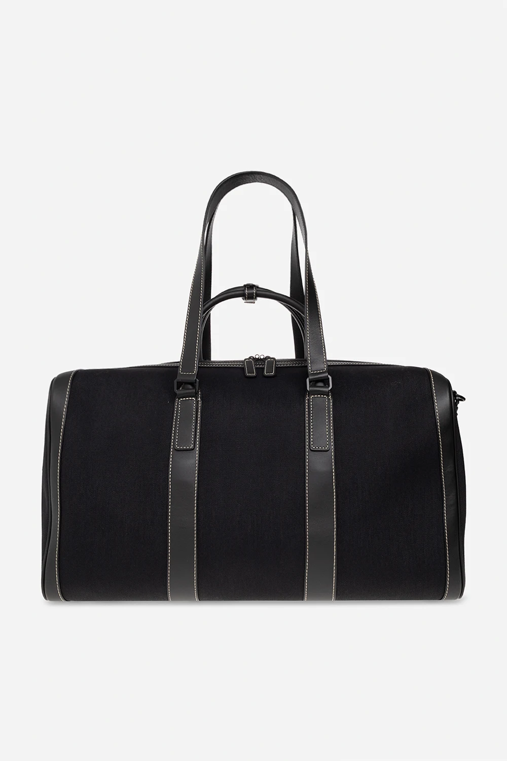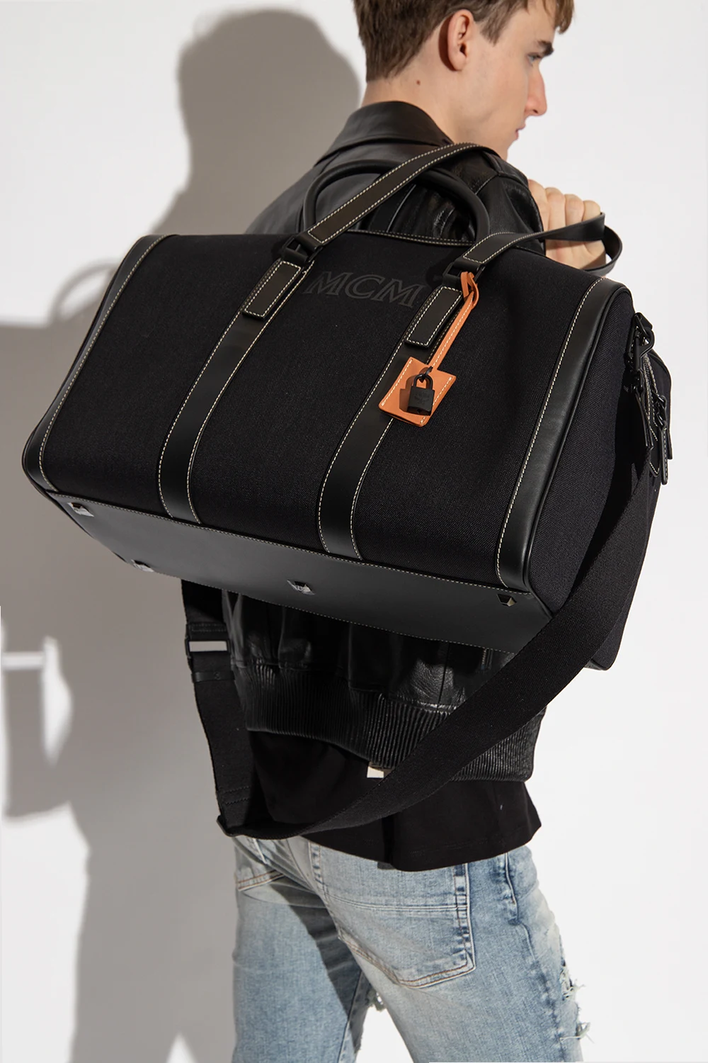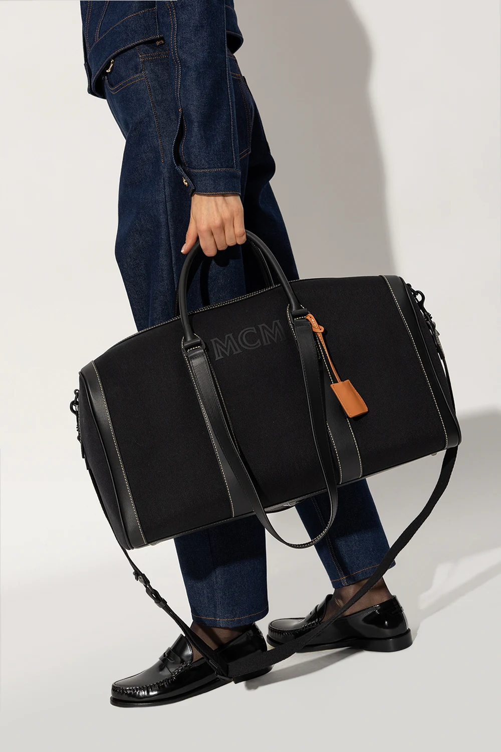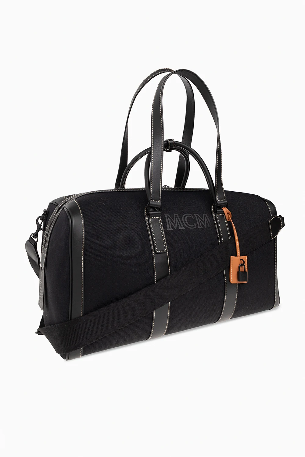 Czarna torba podręczna MCM. Wykonana z płótna i wykończona imitacją skóry. Zamykana na dwubiegunowy zamek. Z przodu ozdobiona nadrukowanym logo. Dołączona brązowa zawieszka z kłódką i chowanymi kluczykami. Cztery rączki oraz odpinany pas na ramię z możliwością regulacji długości. Wewnątrz komora z dwiema kieszeniami z zamknięciem na zatrzaski. Metalowe wykończenie w kolorze srebrnym.