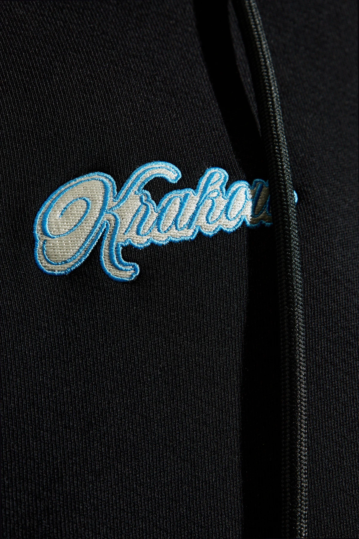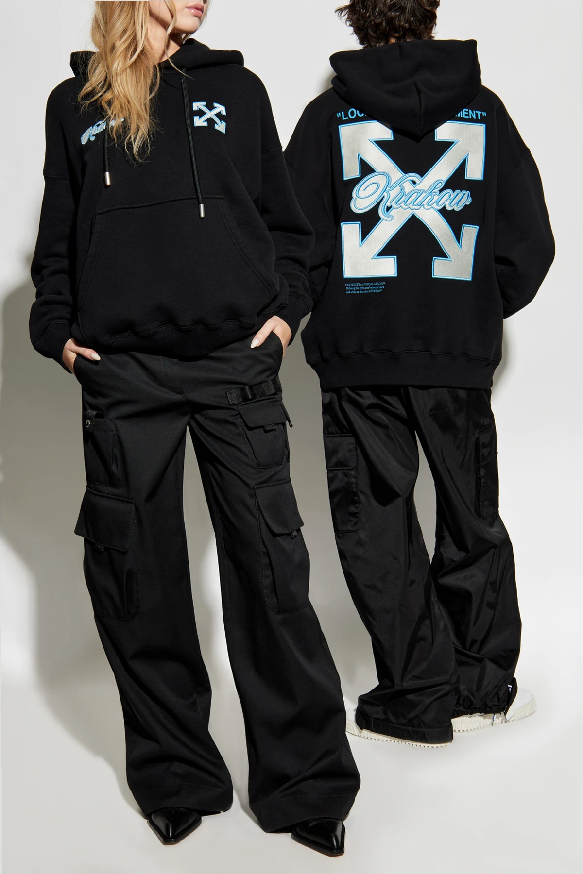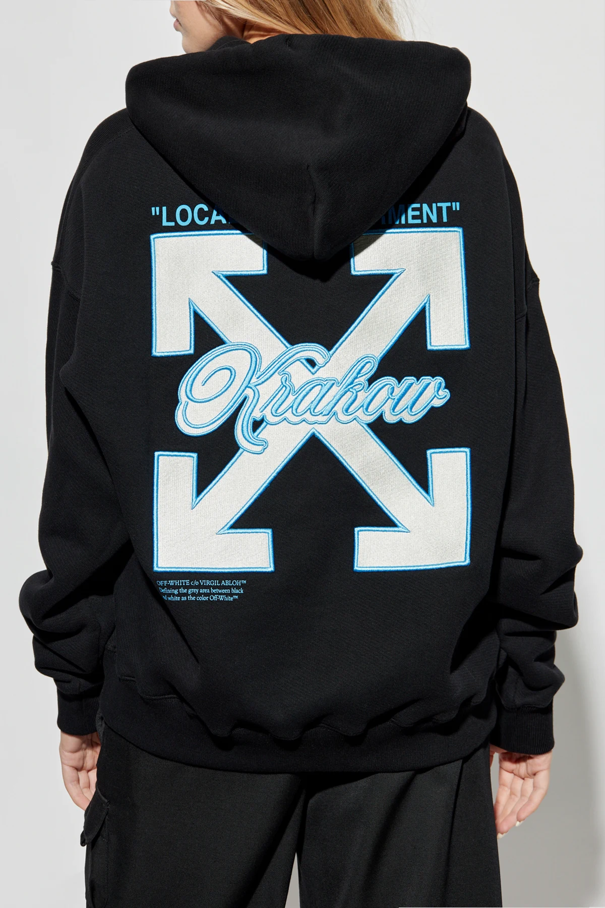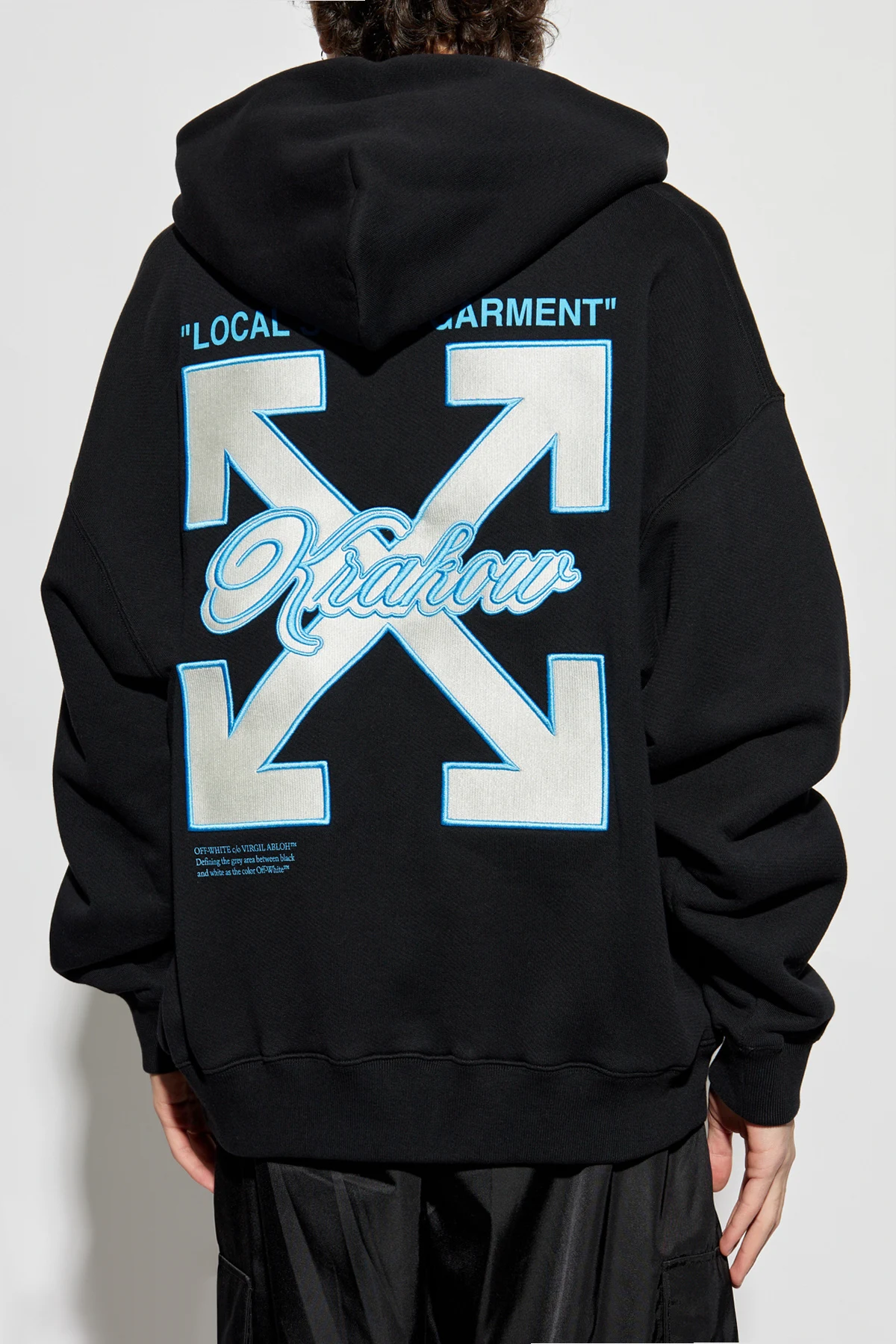Na plecach bluzy widnieje duża grafika, przedstawiająca krzyż ze strzałek oraz centralnie umieszczony napis „Kraków”, nad którym znajduje się napis „LOCAL GARMENT”. Kolorystyka czarna z jasnoniebieskimi i białymi akcentami tworzy nowoczesny i stylowy wygląd.