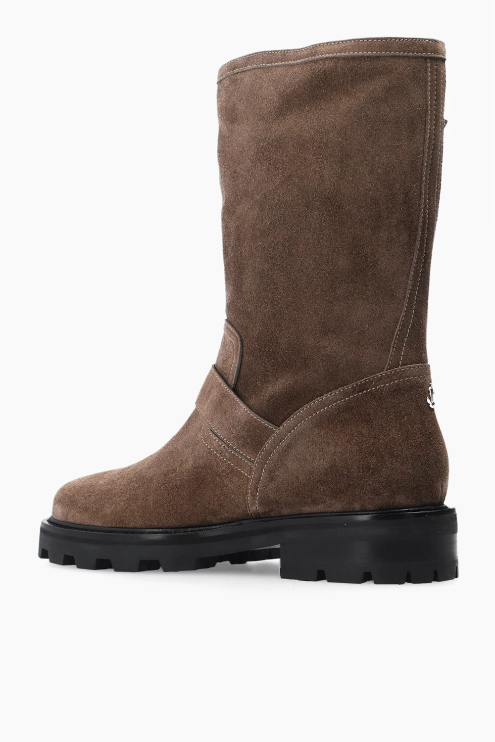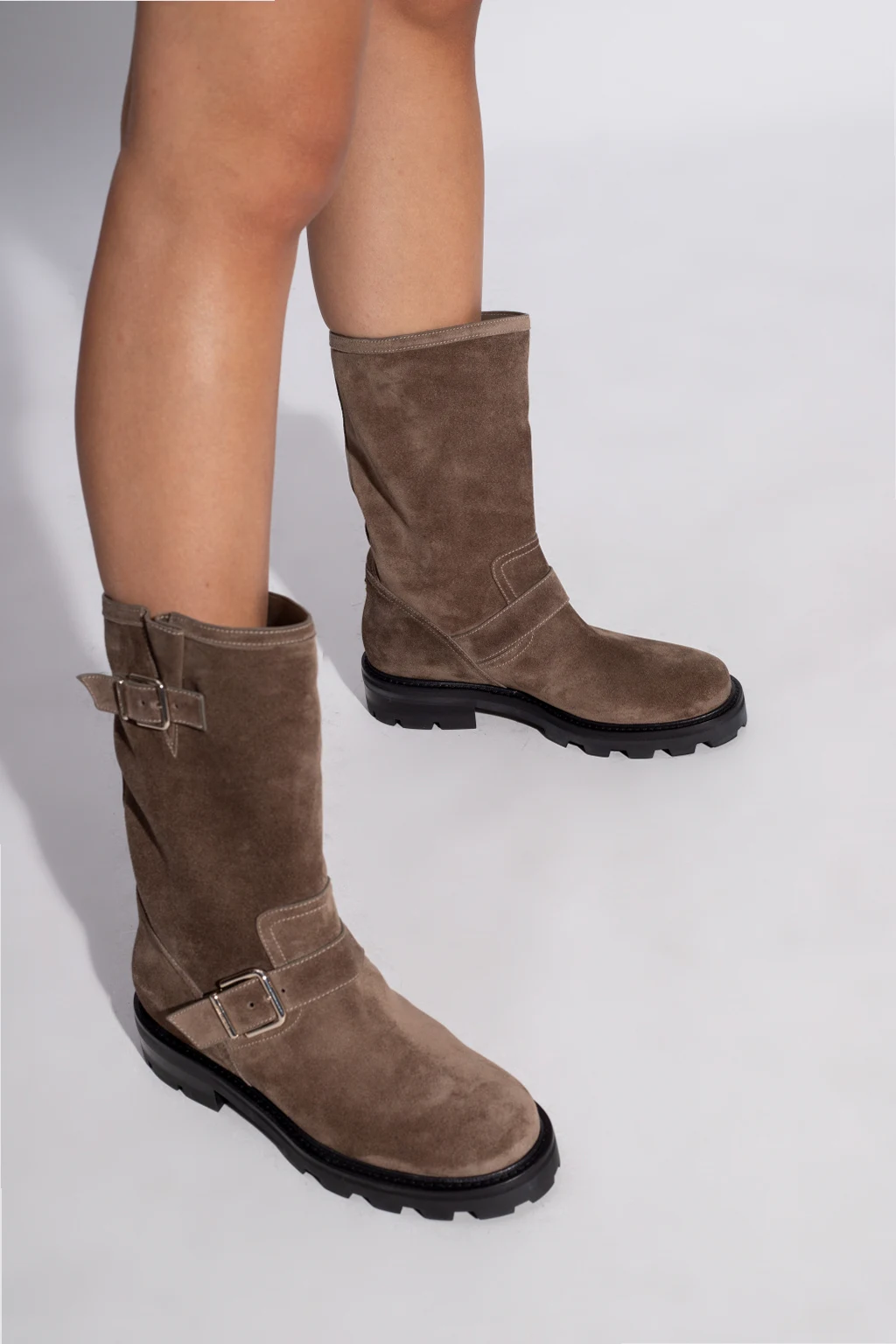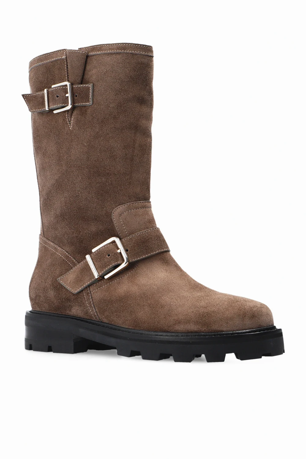 Brązowo-szare botki, model ‘Biker II’ Jimmy Choo. Wykonane z zamszu. Ozdobione paskami z klamrą w kolorze srebrnym. Czarna, gumowa podeszwa.