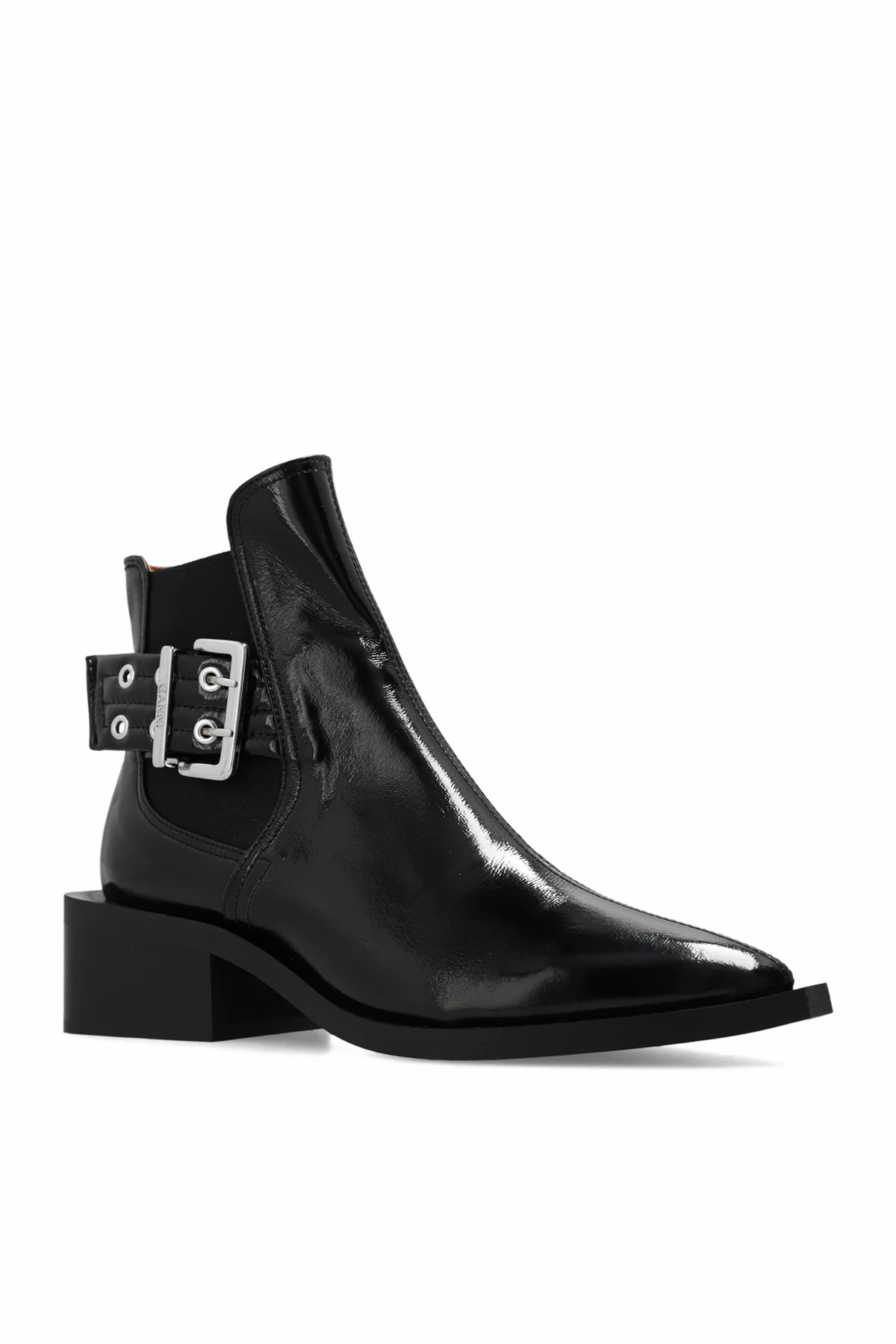 Czarne botki za kostkę Ganni. Wykonane z materiału imitującego skórę. Po bokach wszyta taśma elastyczna. Nosek w szpic. Pas z klamrą w kolorze srebrnym. Czarna, gumowa podeszwa.