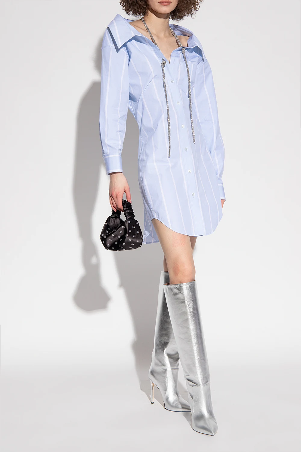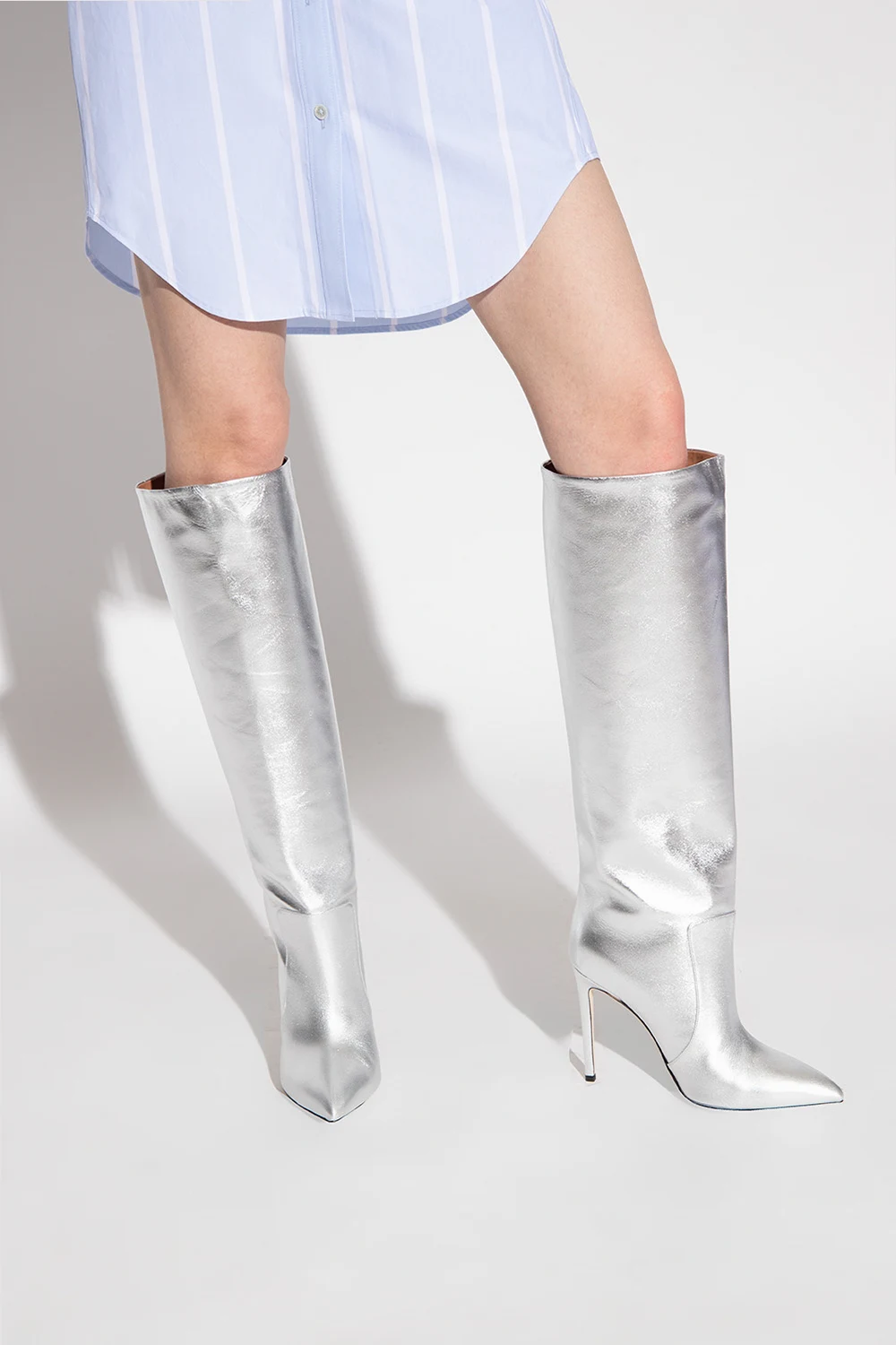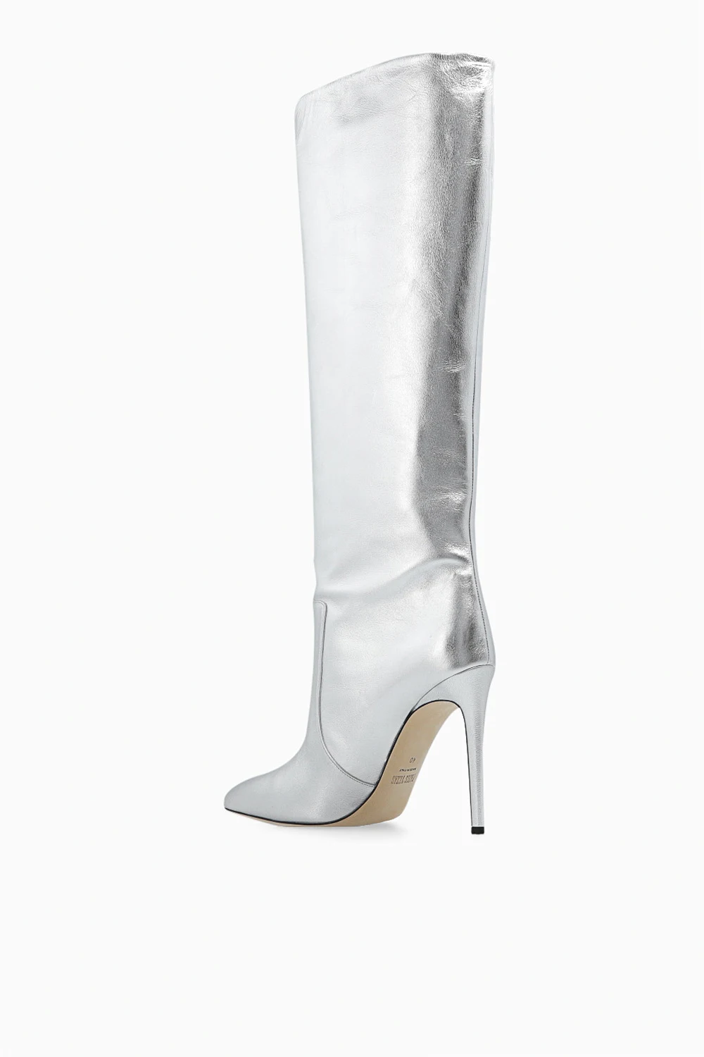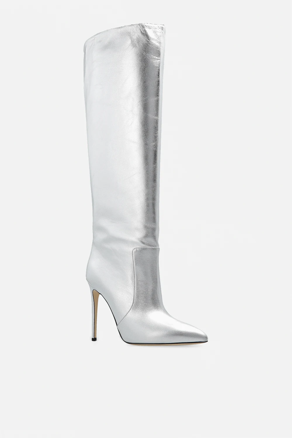 Wsuwane kozaki na obcasie w kolorze srebrnym, model ‘Stiletto’ Paris Texas. Wykonane ze skóry. Nosek w szpic. Kremowa, skórzana podeszwa.