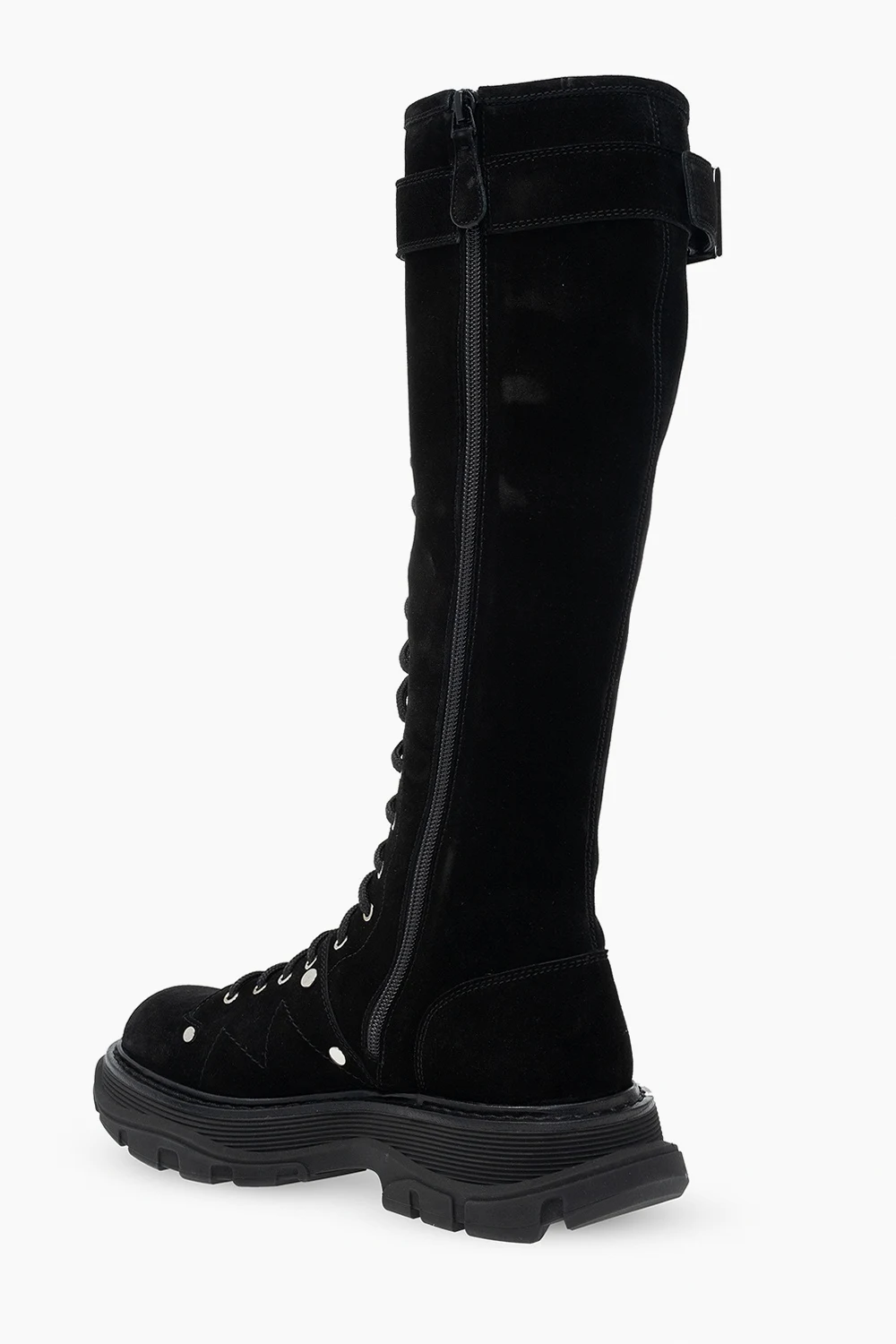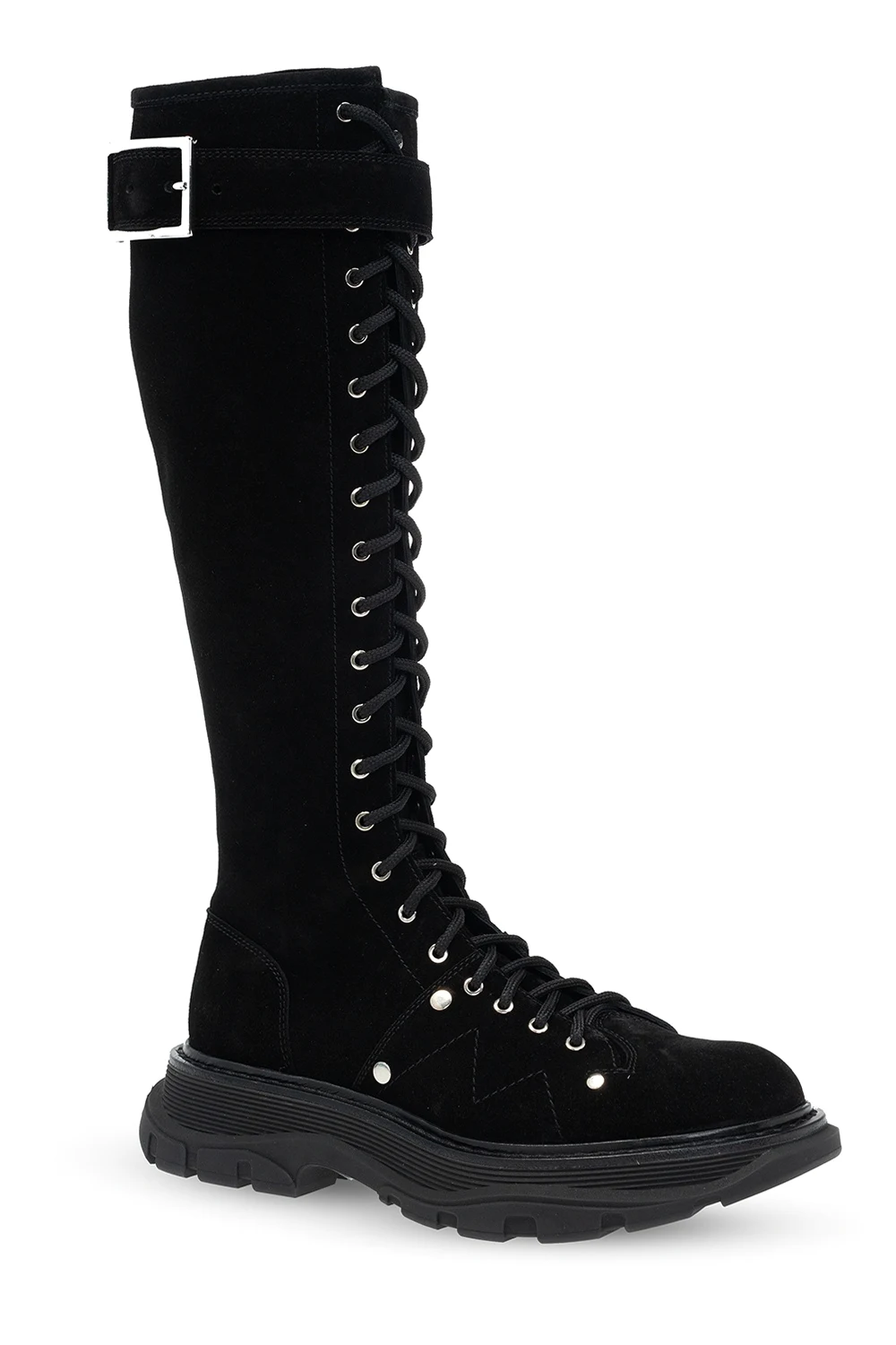 Czarne, skórzane, sznurowane kozaki na platformie Alexander McQueen. Zapinane na zamek i regulowany pasek z klamrą. Metalowe elementy w kolorze srebrnym. Czarna, gumowa podeszwa.