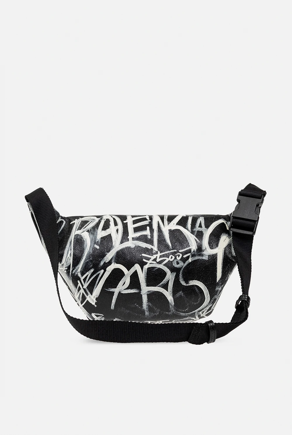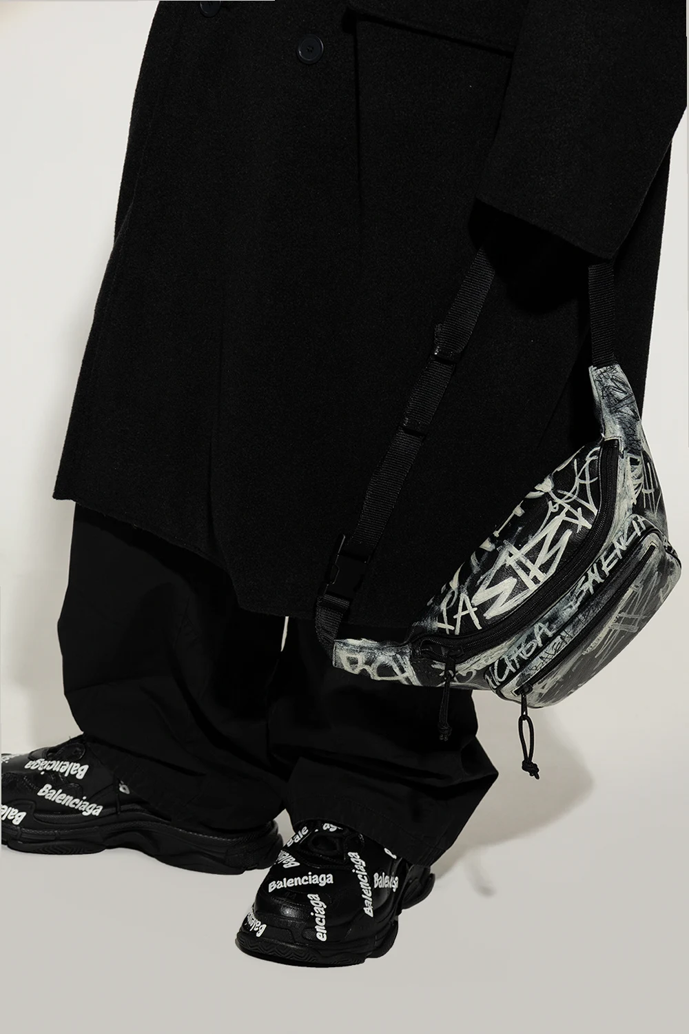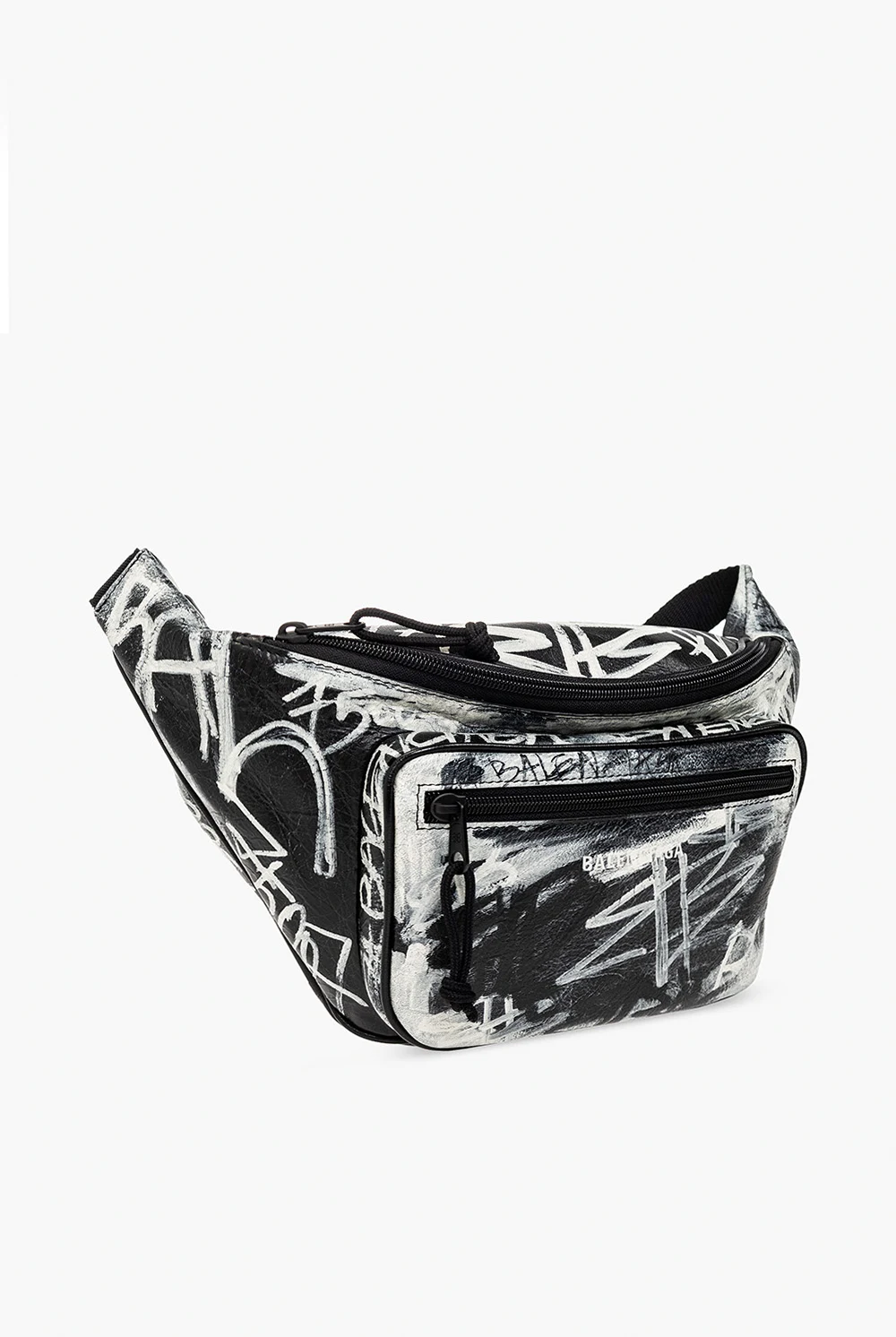 Czarna torba na pas, model ‘Explorer’ Balenciaga. Wykonana ze skóry jagnięcej o gniecionej fakturze. Główna komora oraz przednia kieszeń zamykane na zamek. Ozdobiona kremowym wzorem, inspirowanym sztuką Graffiti oraz logo. Regulowany pas z zapięciem na klamrę.