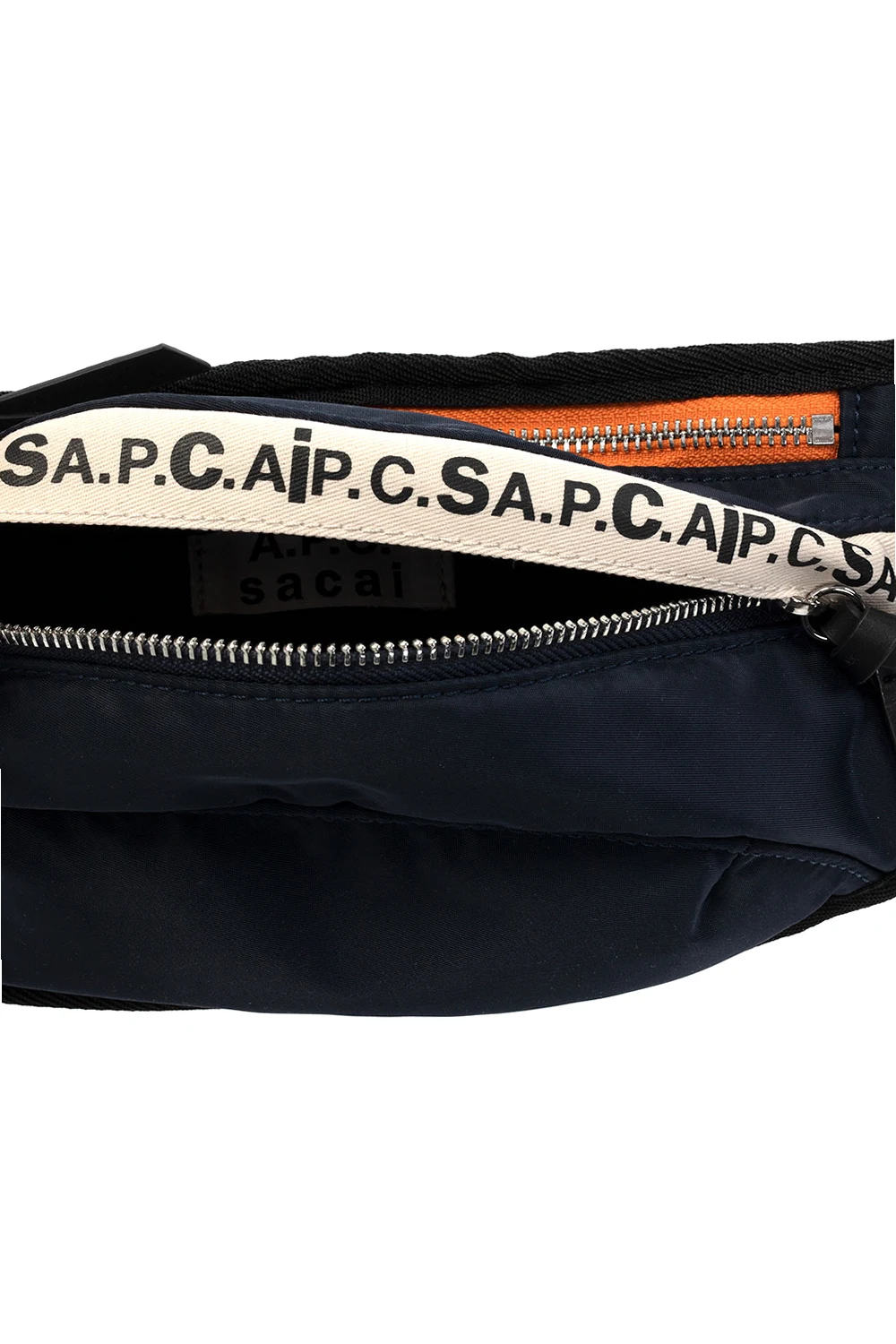Granatowa torba na pas A.P.C. x Sacai. Zamykana na zamek. Ozdobiona nadrukowanym logo w kolorze czarnym. Z przodu kieszeń zamykana na zamek. Regulowany pasek biodrowy. Wewnątrz komora z kieszenią zamykaną na zamek. Kolaboracja łącząca minimalizm z eksperymentalnym podejściem i innowacyjnymi produktami.