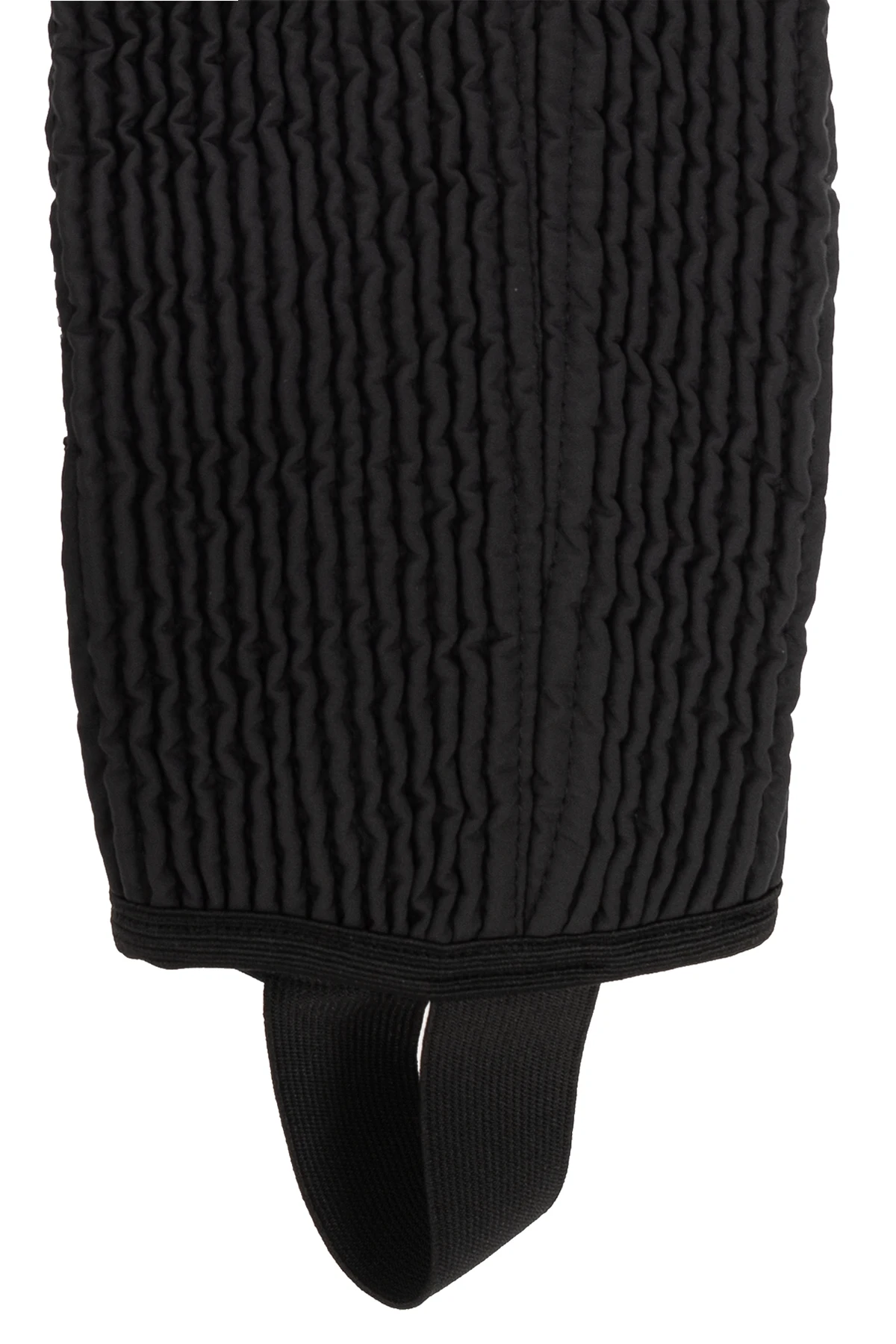 Czarne, pikowane getry Y-3 Yohji Yamamoto. Po bokach dwie kieszenie zapinane na zamek ozdobione białym, wyszytym logo. Na dole wszyty elastyczny pasek na stopę.