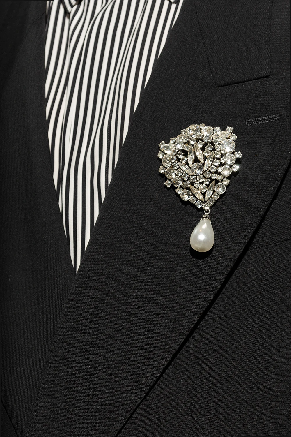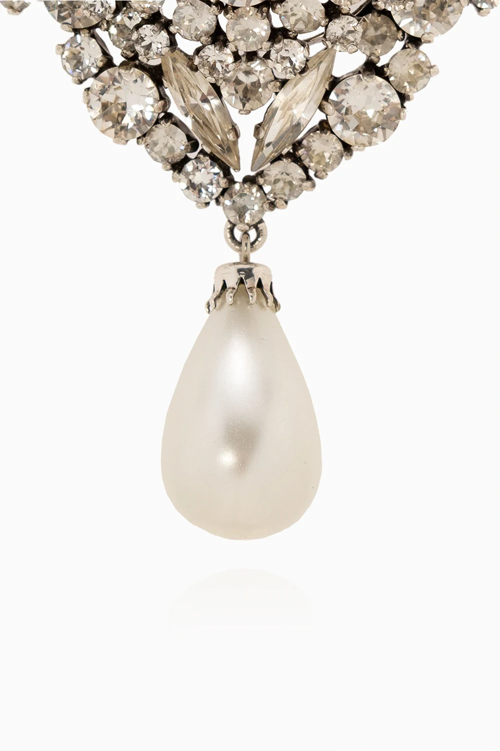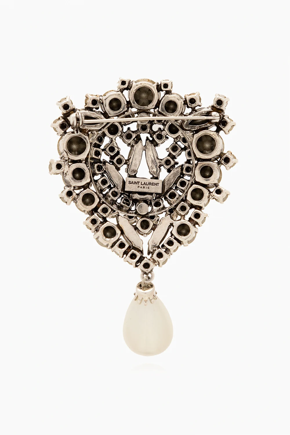 Mosiężna broszka w kolorze srebrnym Saint Laurent. Wysadzana połyskującymi kryształami i szklaną perłą.