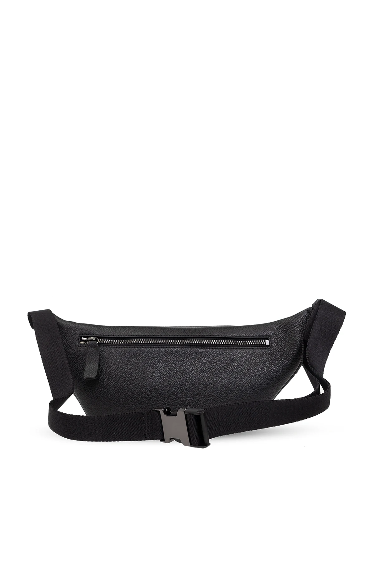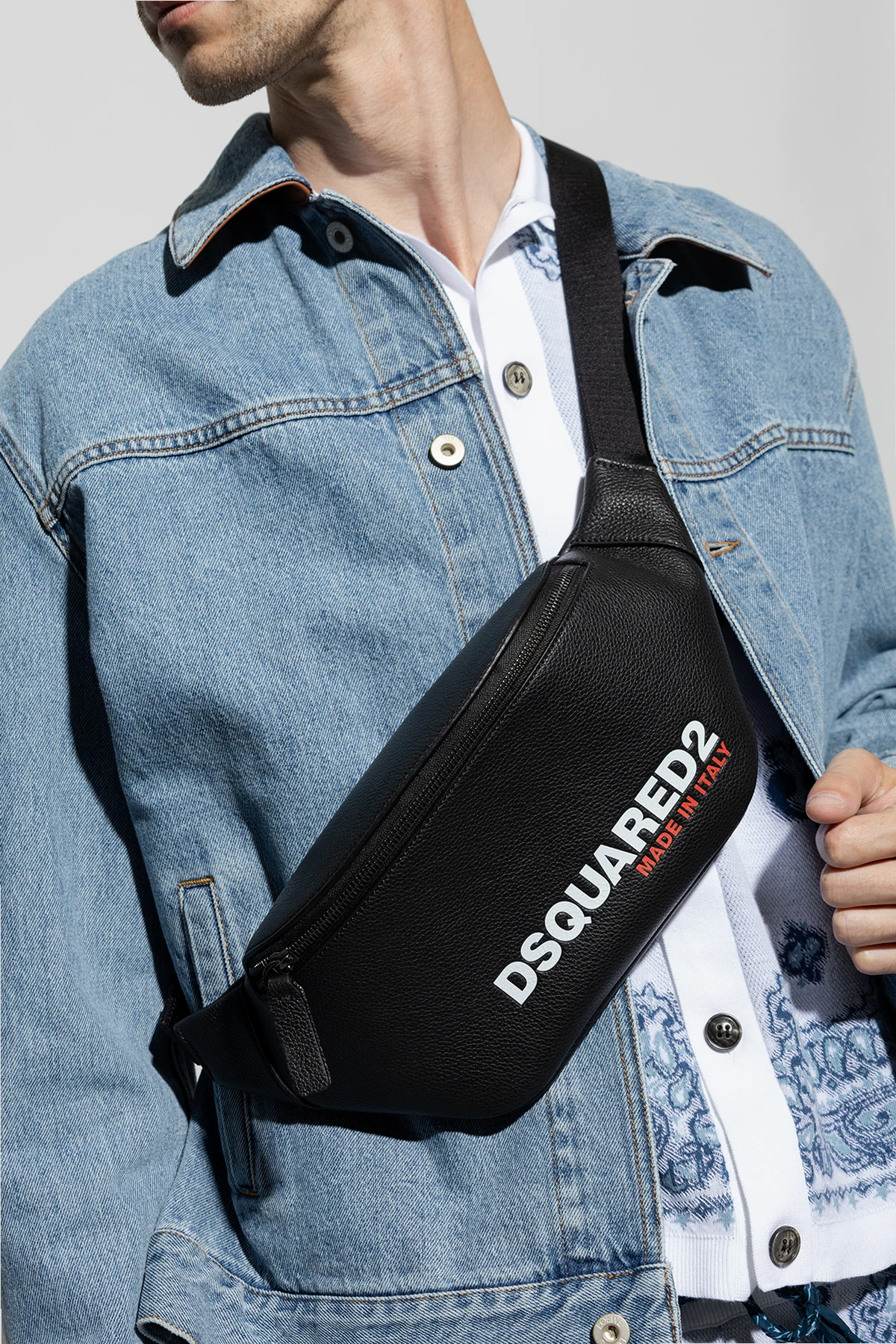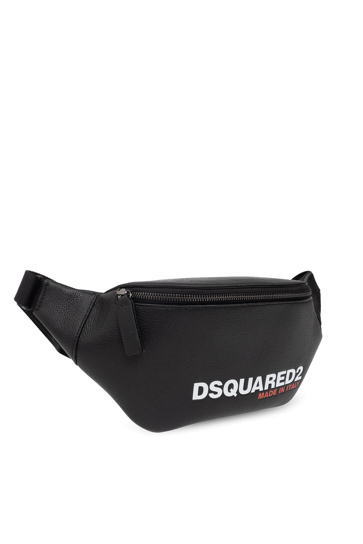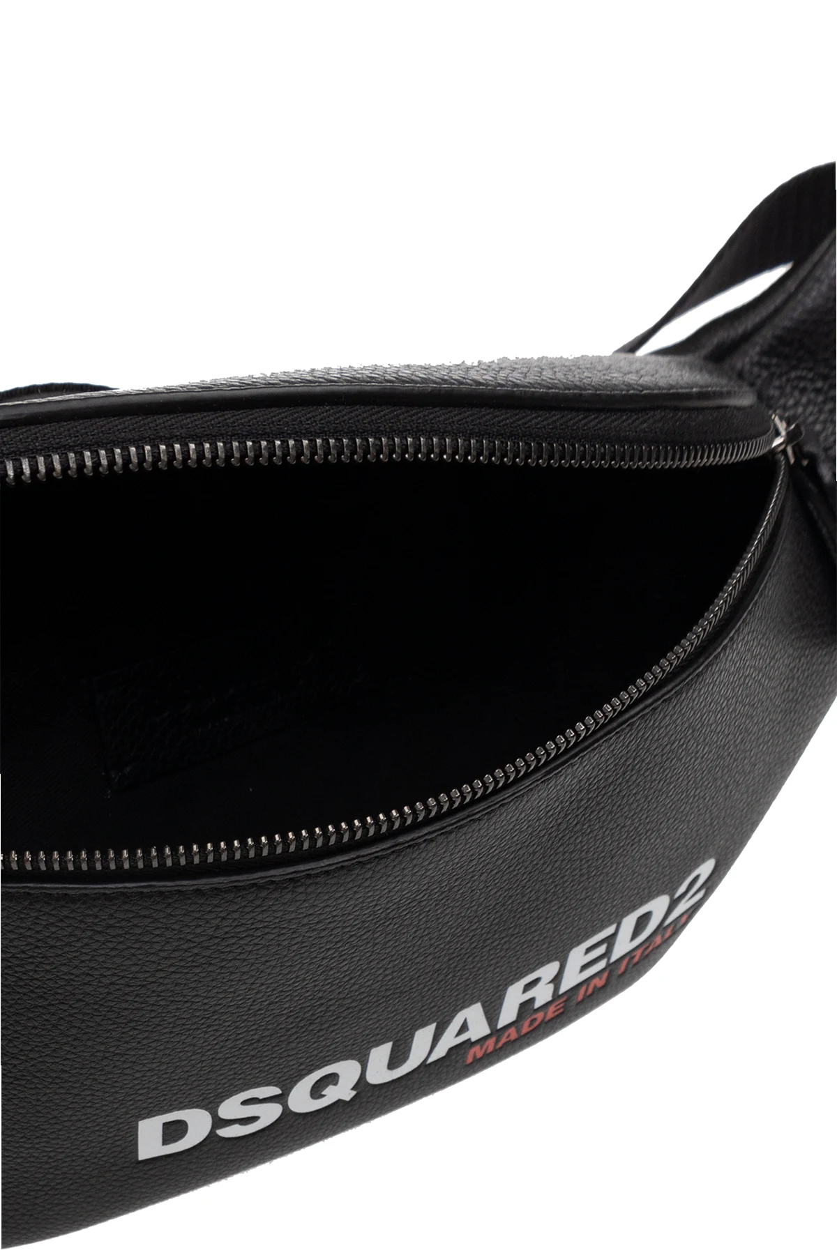Czarna torba na pas Dsquared2. Wykonana ze skóry. Zamykana na zamek. Z przodu ozdobiona nadrukowanym biało-czerwonym logo. Z tyłu kieszeń zamykana na zamek. Regulowany pas. Wewnątrz komora i wsuwana kieszeń.
