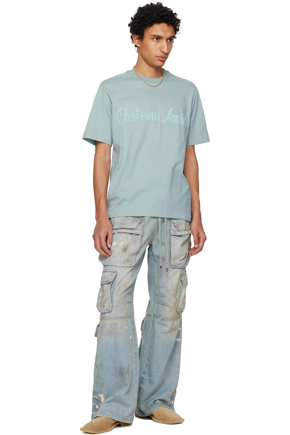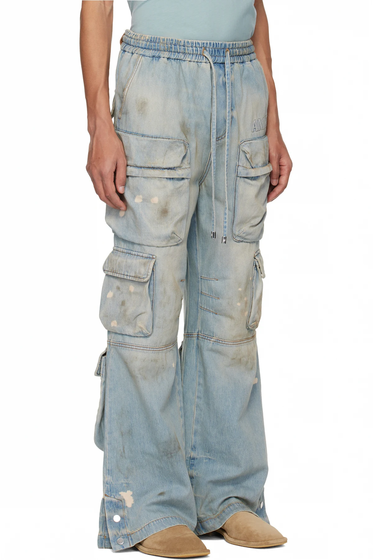 Niebieskie jeansy z efektem ‘vintage’ oraz sprania Amiri. Zapinane na guziki. Z tyłu naszywka z logo. Liczne kieszenie. Krój typu ‘cargo’. Długie nogawki.