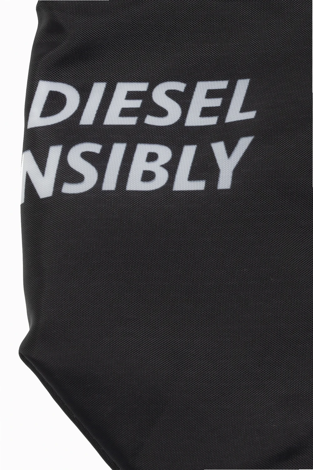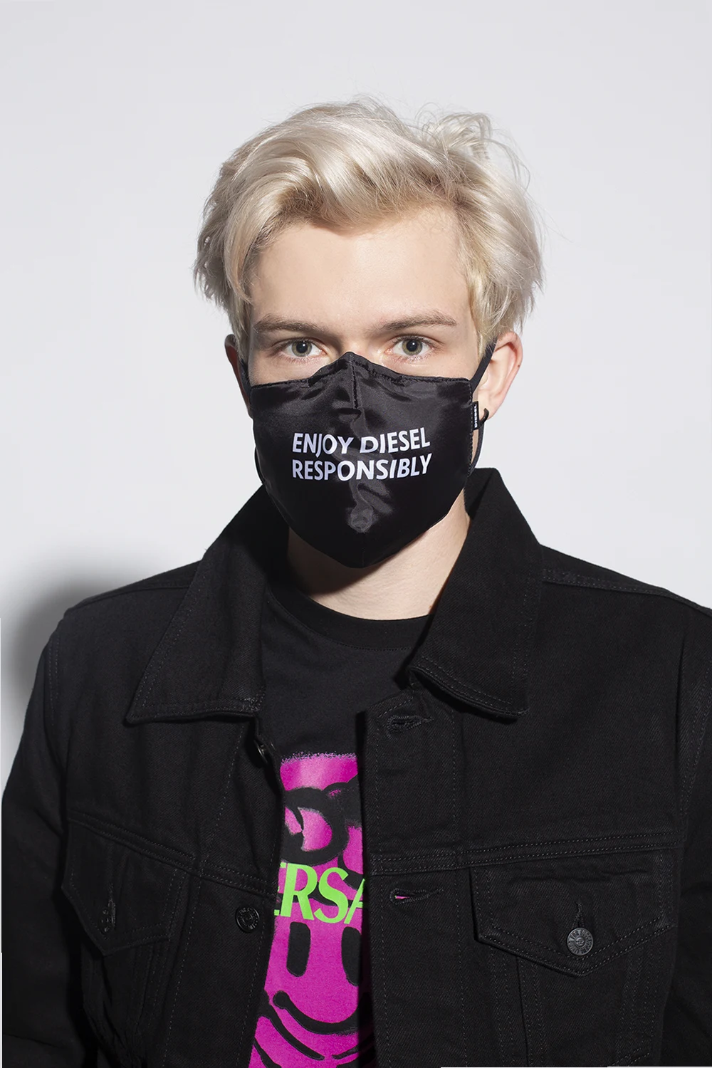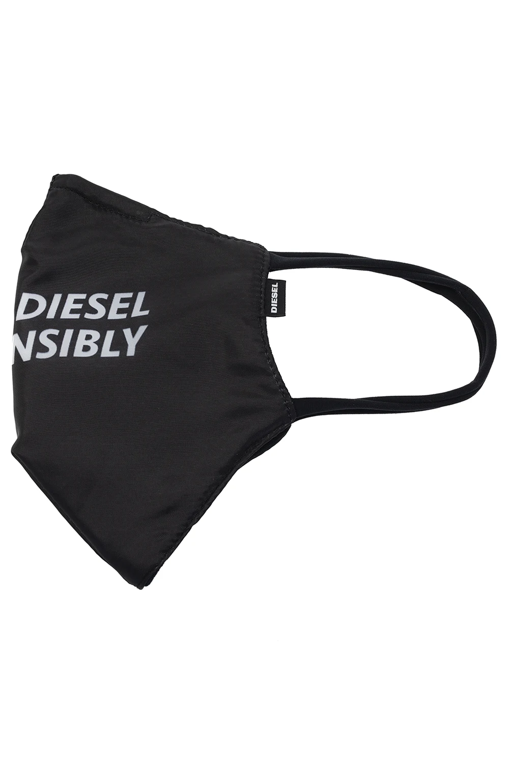Czarna maseczka Diesel. Wykonana z hipoalergicznego i oddychającego materiału. Ozdobiona nadrukiem z napisem w kolorze białym. 99% filtracji bakteryjnej.