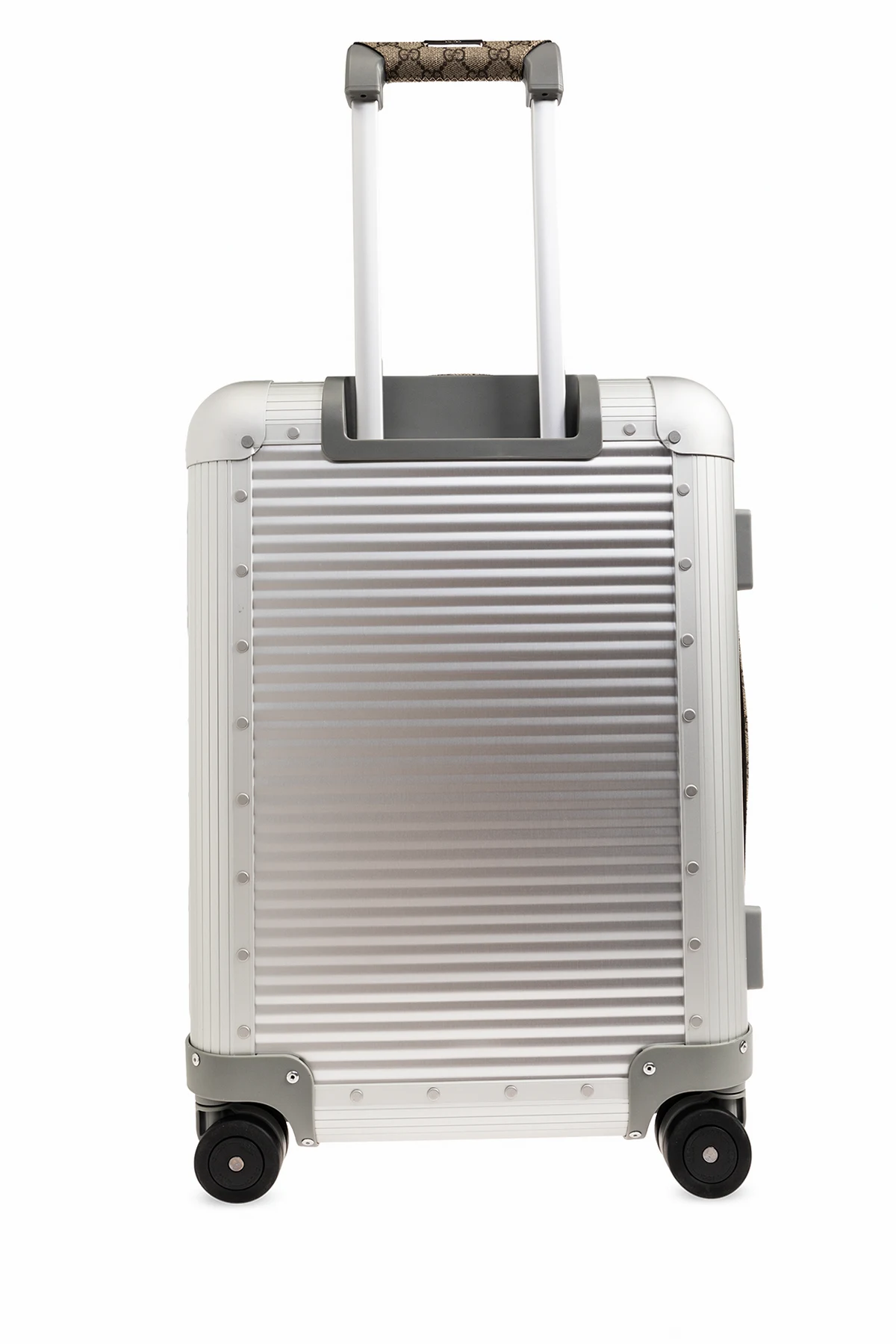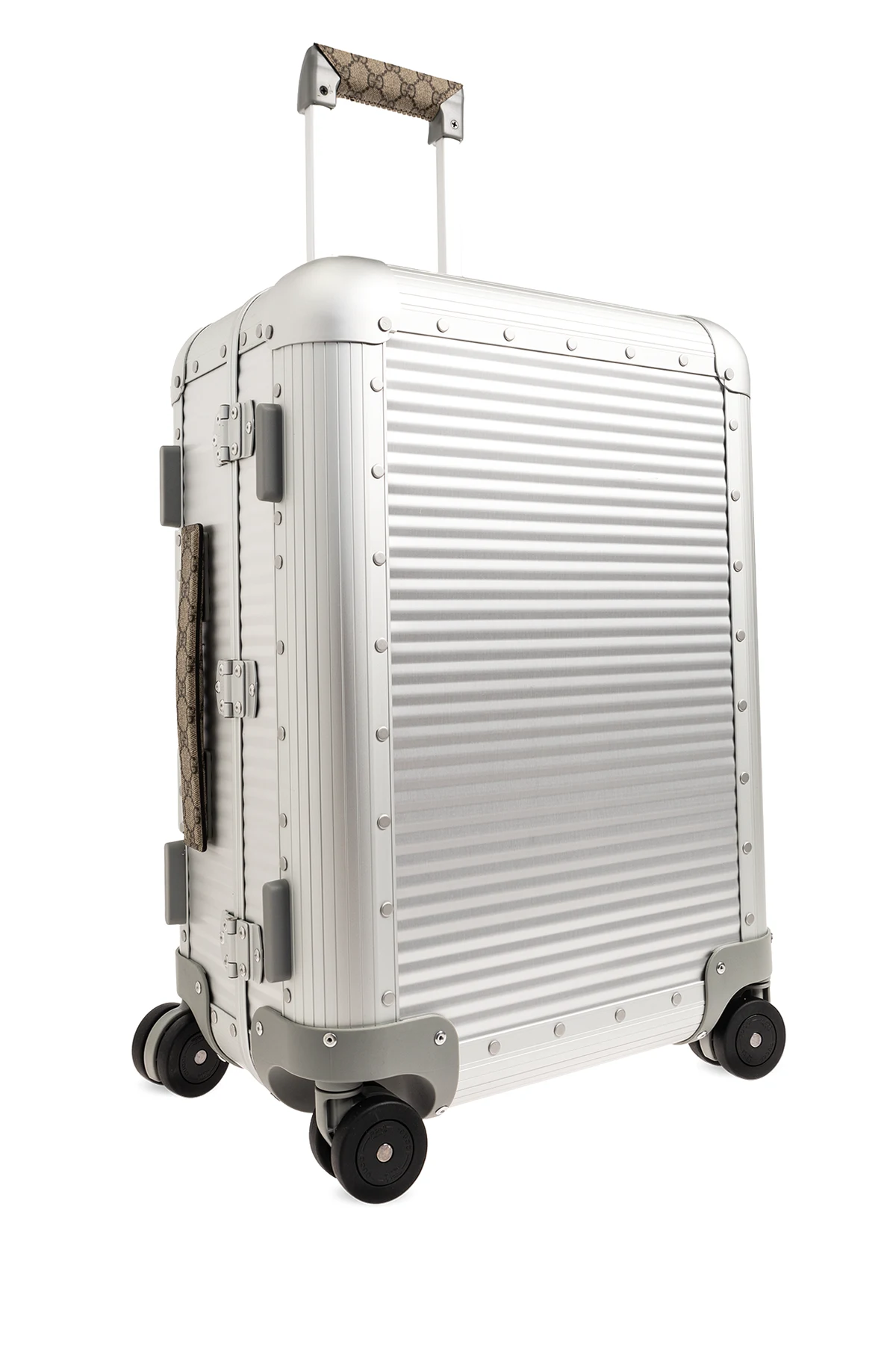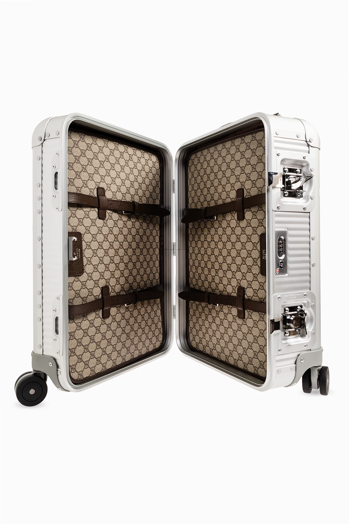 Walizka na kółkach w kolorze srebrnym Gucci. Wykonana z aluminium. Wykończona płótnem ‘GG Supreme’. Zamykana na zamek z kodem. Pasek bagażowy z motywem paska ‘Web’ w kolorze zielono-czerwono-zielonym’. Odpinana zawieszka identyfikacyjna. Cztery koła 360°. Wysuwane i teleskopowe uchwyty górne oraz jeden uchwyt boczny. Wewnątrz elastyczne paski zabezpieczające rzeczy i kieszeń zamykana na zamek. Metalowe elementy w kolorze srebrnym. Walizka powstała we współpracy z włoskim producentem luksusowych walizek FPM.