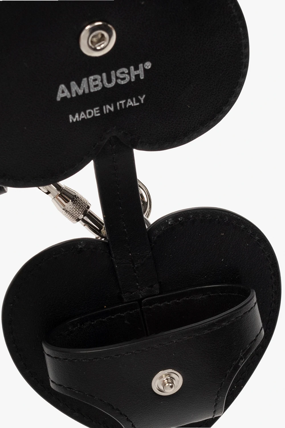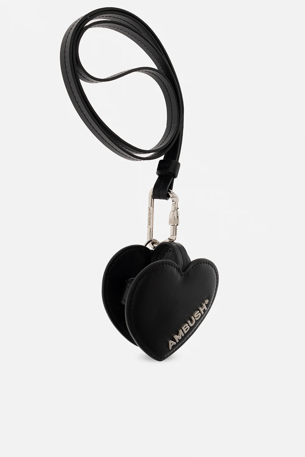Czarne, skórzane etui w kształcie serca Ambush. Zapięcie na zatrzask. Ozdobiony aplikacją z logo w kolorze srebrnym. Dołączony odpinany pas na szyję.
