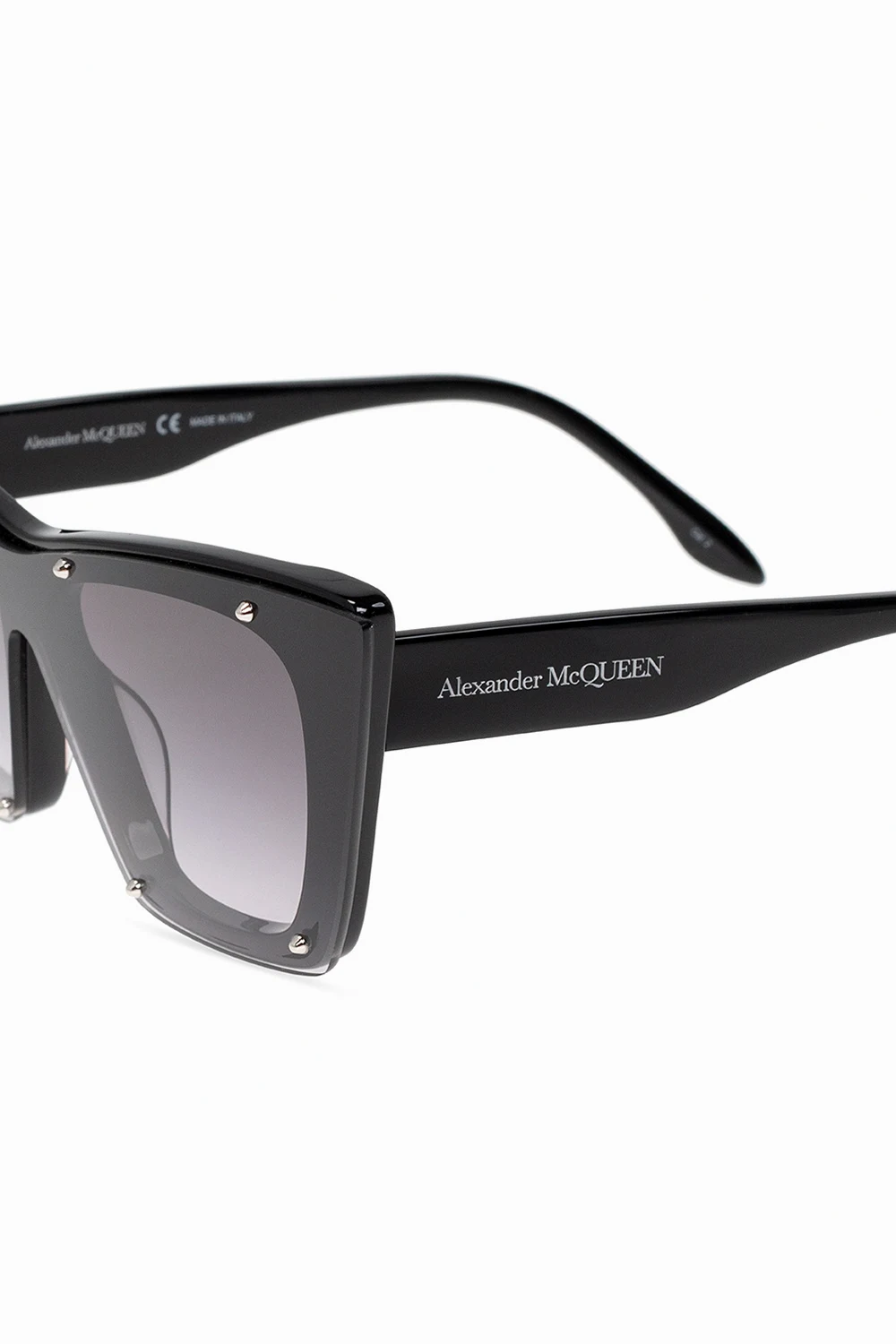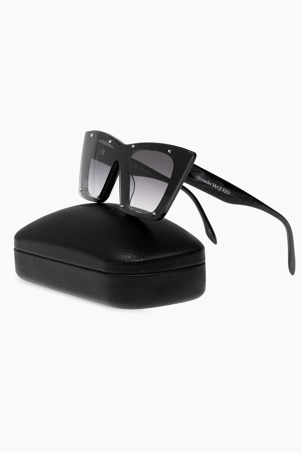 Czarne okulary przeciwsłoneczne Alexander McQueen. Ozdobione wytłoczonym logo w kolorze białym. Metalowe aplikacje w kolorze srebrnym. Szare, gradientowe soczewki ze 100% ochroną przed promieniami UVA/UVB. Dołączone etui.