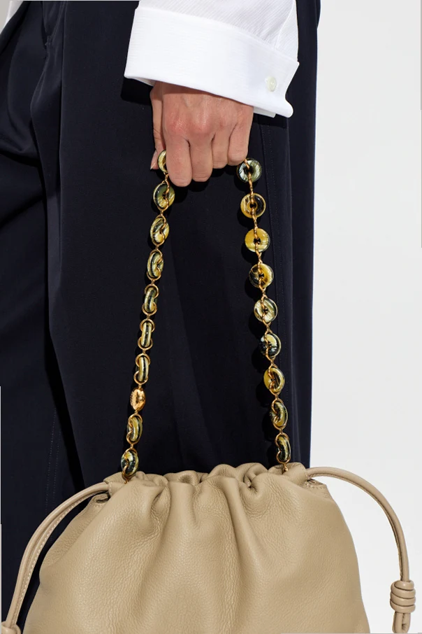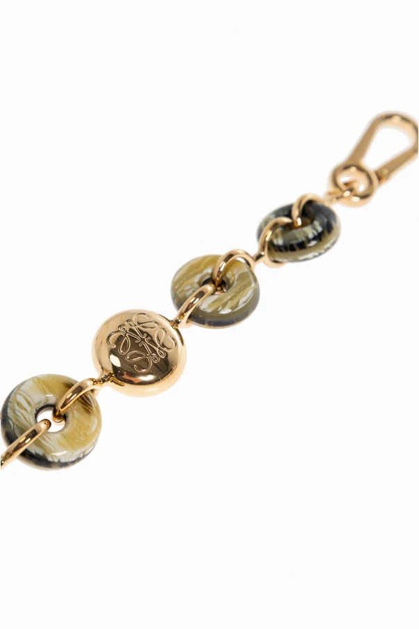 Łańcuch do torby marki Loewe to wyrafinowana ozdoba, która idealnie komponuje się z ekskluzywną galanterią. Unikatowe, okrągłe ogniwa, o gładkiej i zaokrąglonej formie, zachwycają subtelnym efektem marmurkowym w tonacji złotej oraz oliwkowej. Szlachetna transparentność ogniw, wykonanych z wysokogatunkowego tworzywa sztucznego, harmonijnie współgra z metalowym, złotym łańcuszkiem, ukazując staranność wykonania i dbałość o najmniejsze detale.