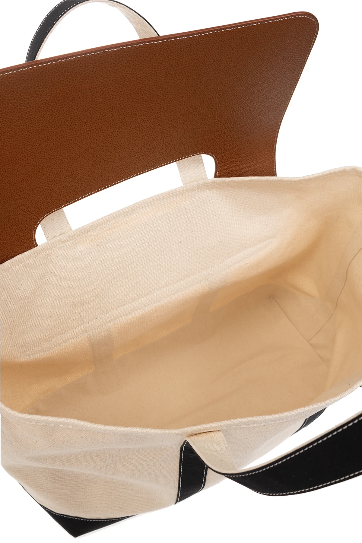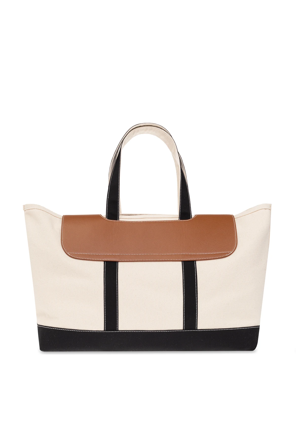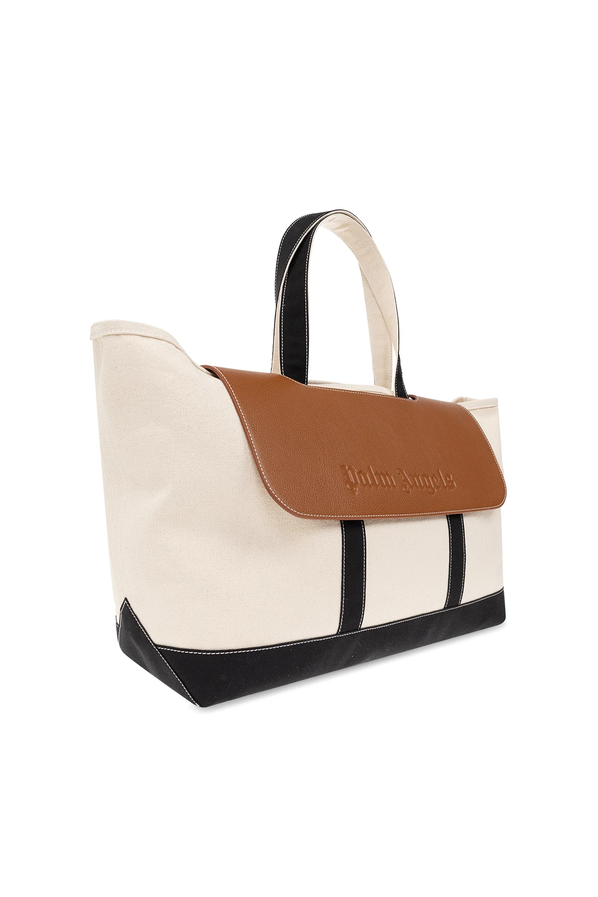 Kremowo-brązowo-czarna torba podręczna Palm Angels. Wykonana ze skóry oraz materiału. Zamknięcie z klapą. Dwie półokrągłe rączki. Wewnątrz komora.