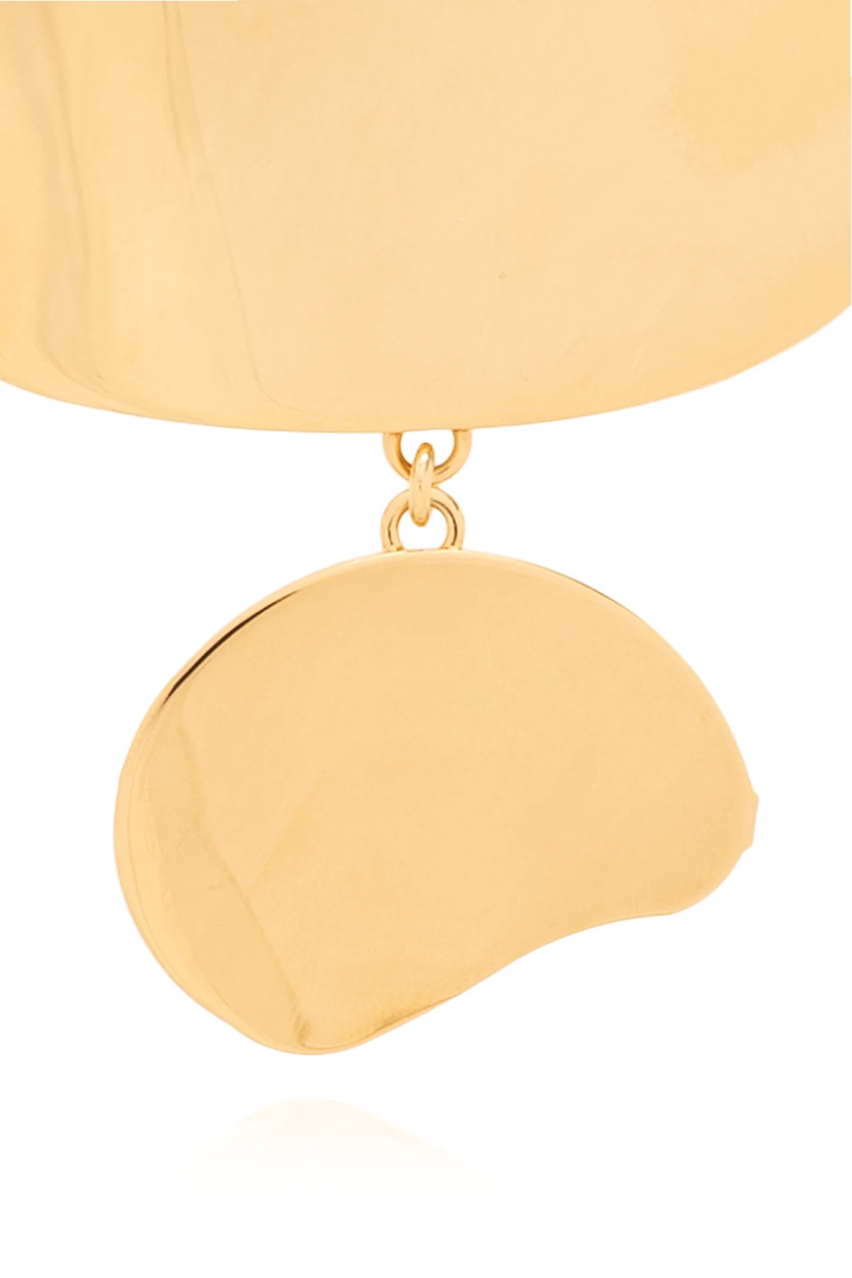 Broszka w kolorze złotym JIL SANDER. Wykonana z mosiądzu. Zapinana na szpilkę z blokadą. Ozdobiona zawieszką o nieregularnym kształcie.