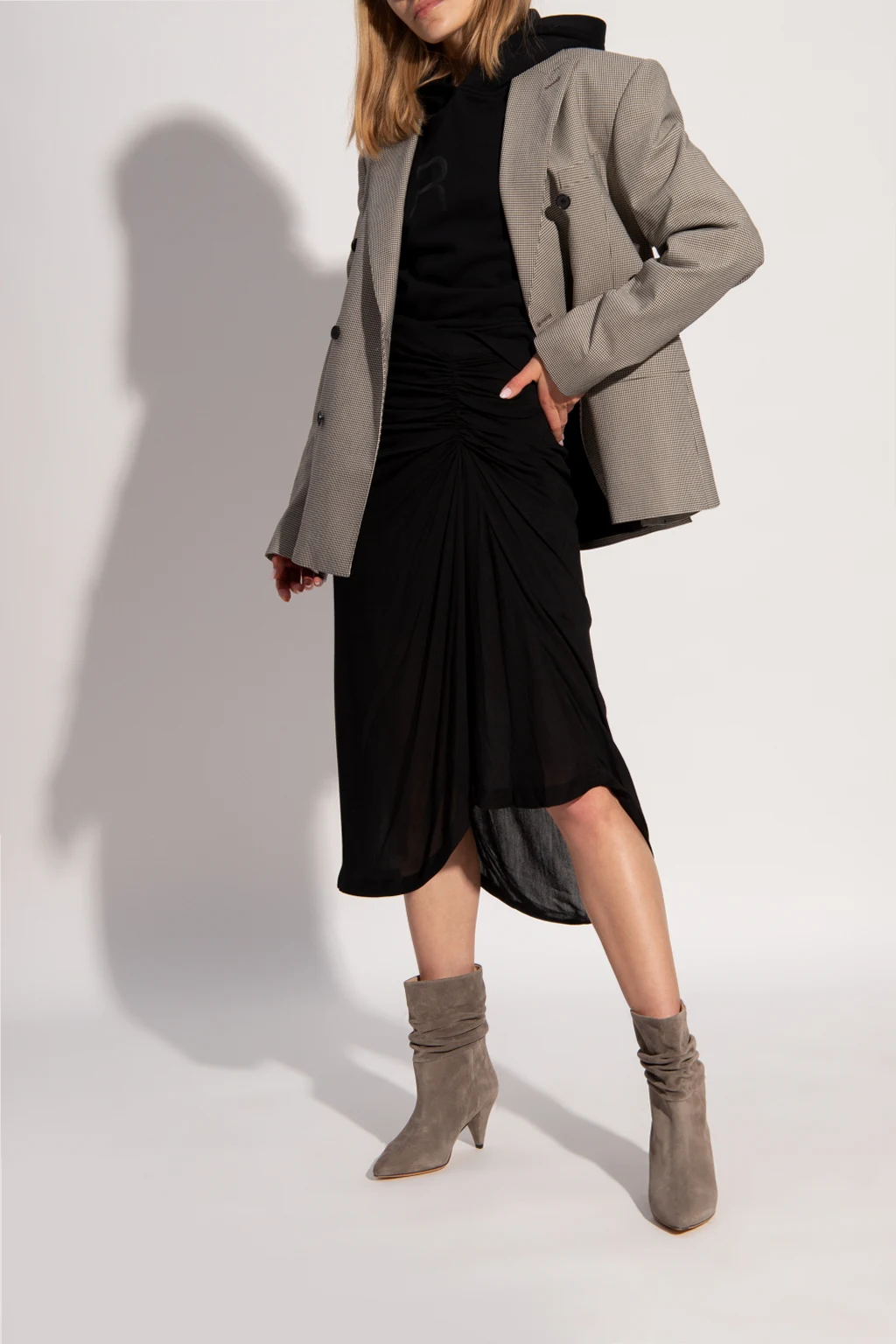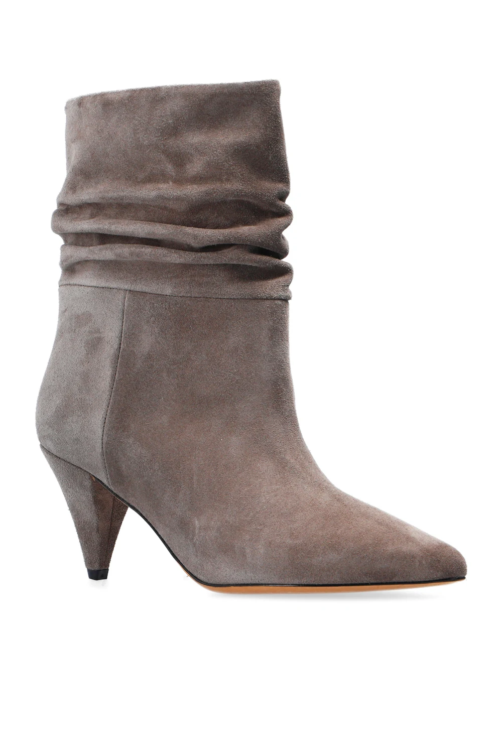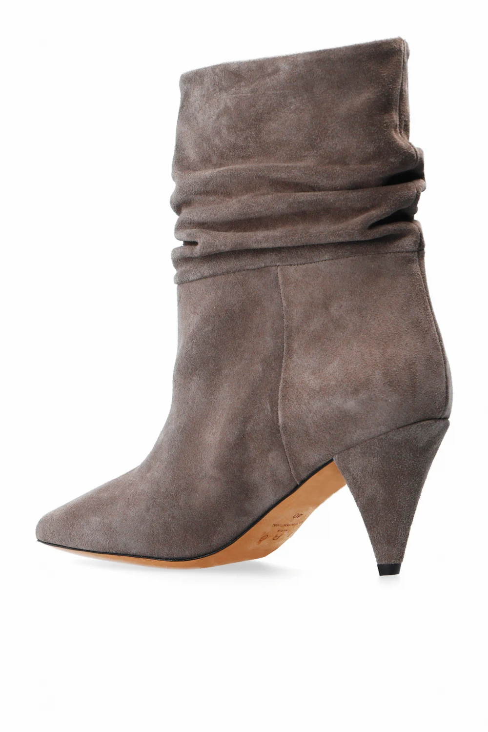 Szare botki na obcasie Iro. Wykonane z zamszu. Nosek w szpic. Dekoracyjnie marszczona cholewka. Beżowa, skórzana podeszwa.