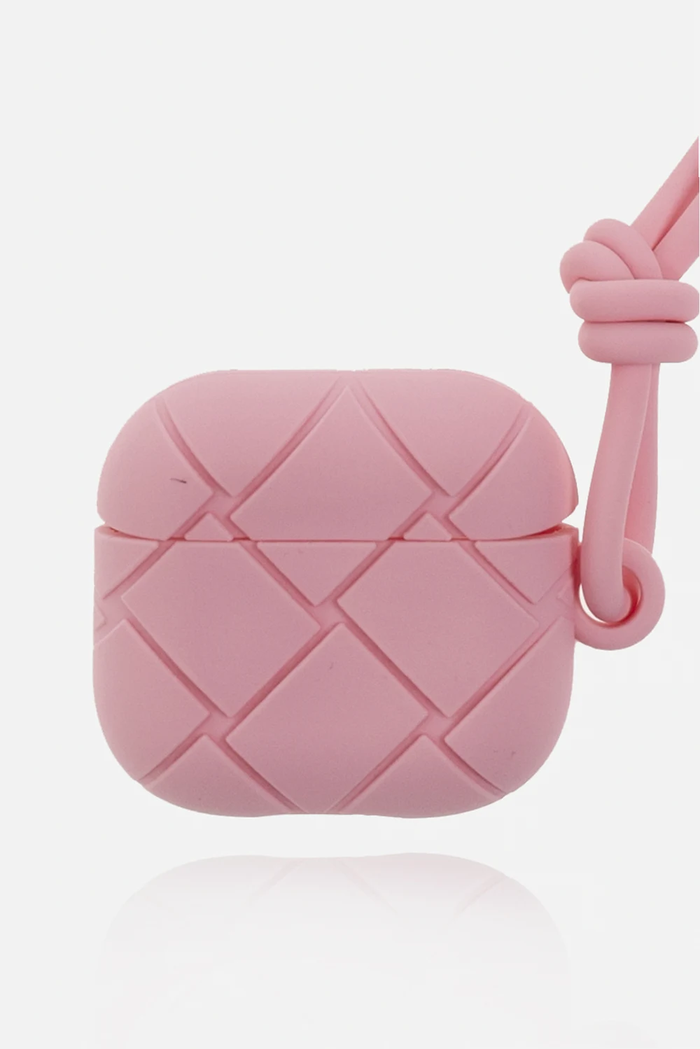 Różowe etui na AirPods 3 generacji Bottega Veneta. Wykonane z silikonu. Ozdobione charakterystycznym dla marki wzorem imitującym plecionkę ‘Intreccio’. Dołączony pasek.