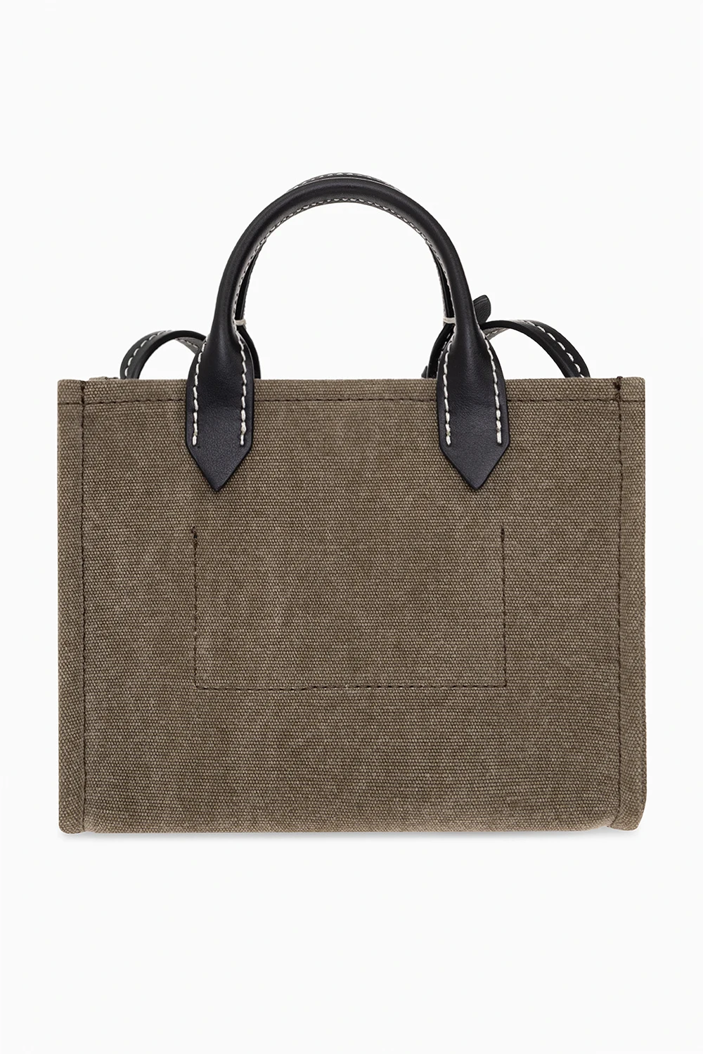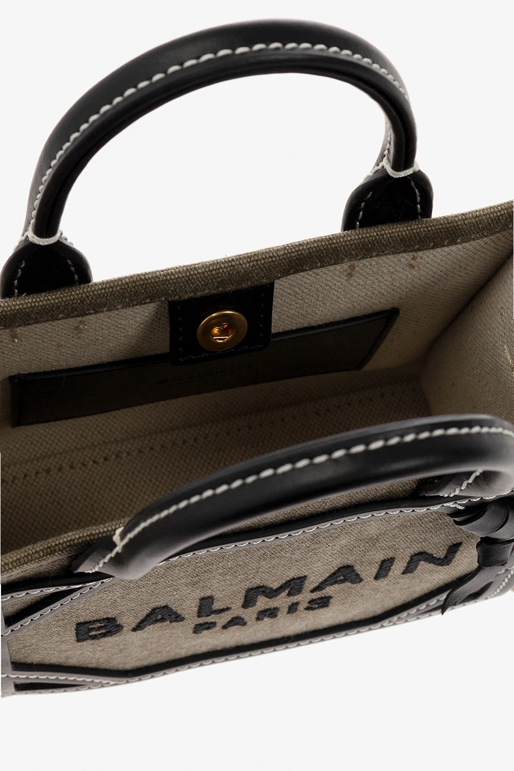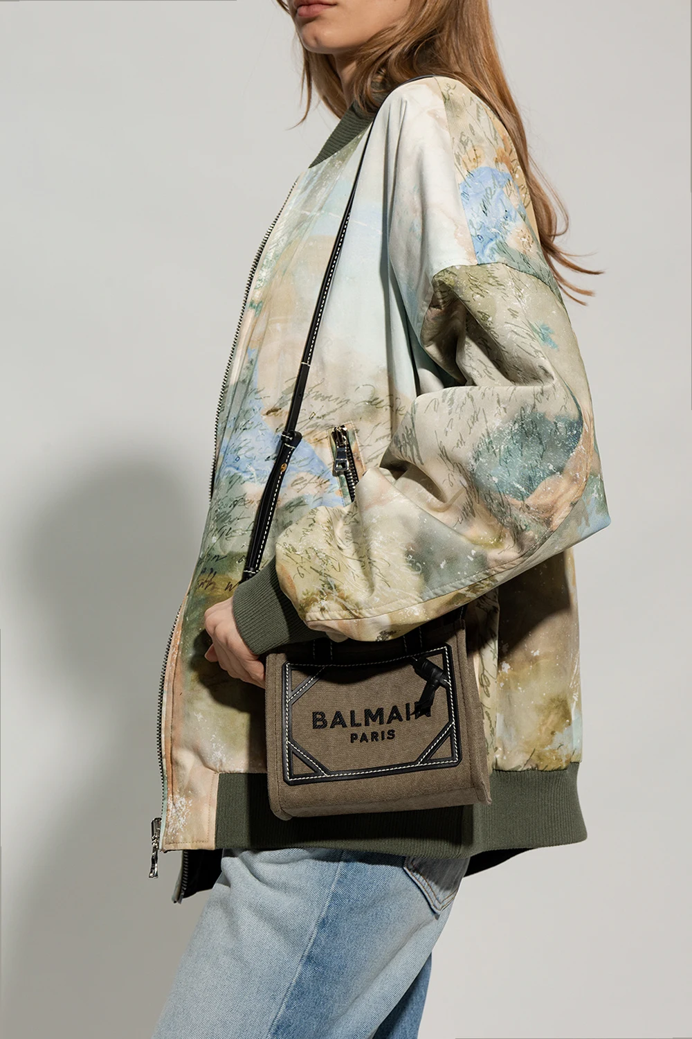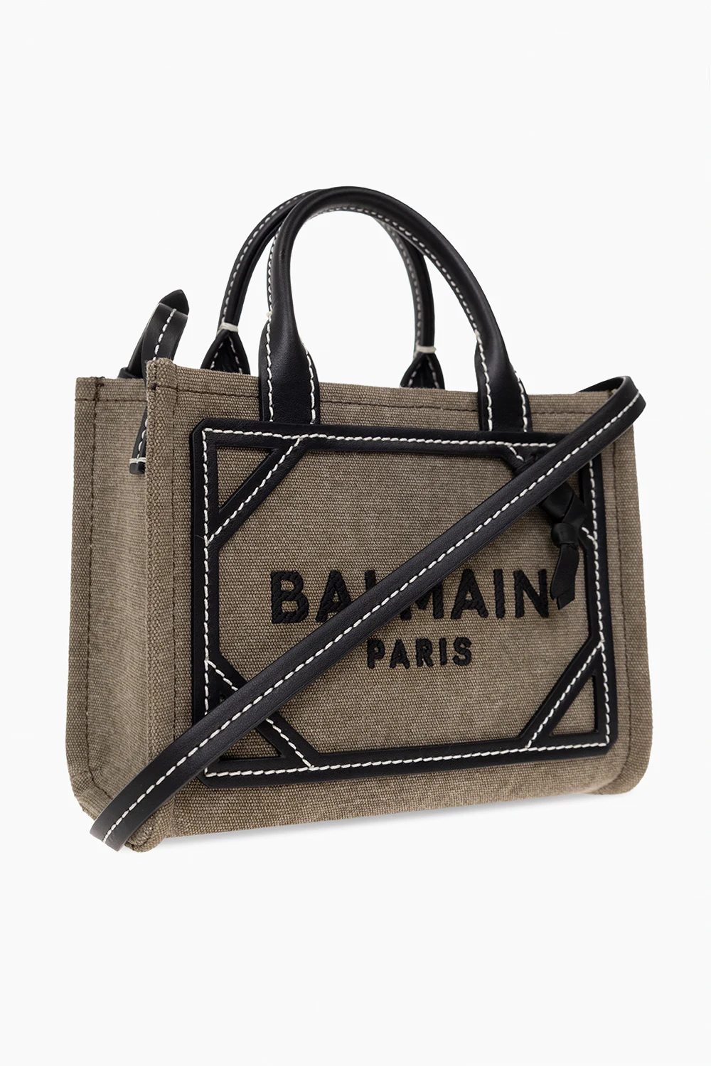 Torba na ramię w kolorze khaki, model 'B-Army Mini' Balmain. Wykonana z mieszanki lnu i bawełny. Wykończona skórą cielęcą. Zamykana na zatrzask. Z przodu ozdobiona haftem z logo w kolorze czarnym. Dwie półokrągłe rączki oraz pas z możliwością regulacji. Wewnątrz komora i miejsce na kartę. Metalowe elementy w kolorze złotym.