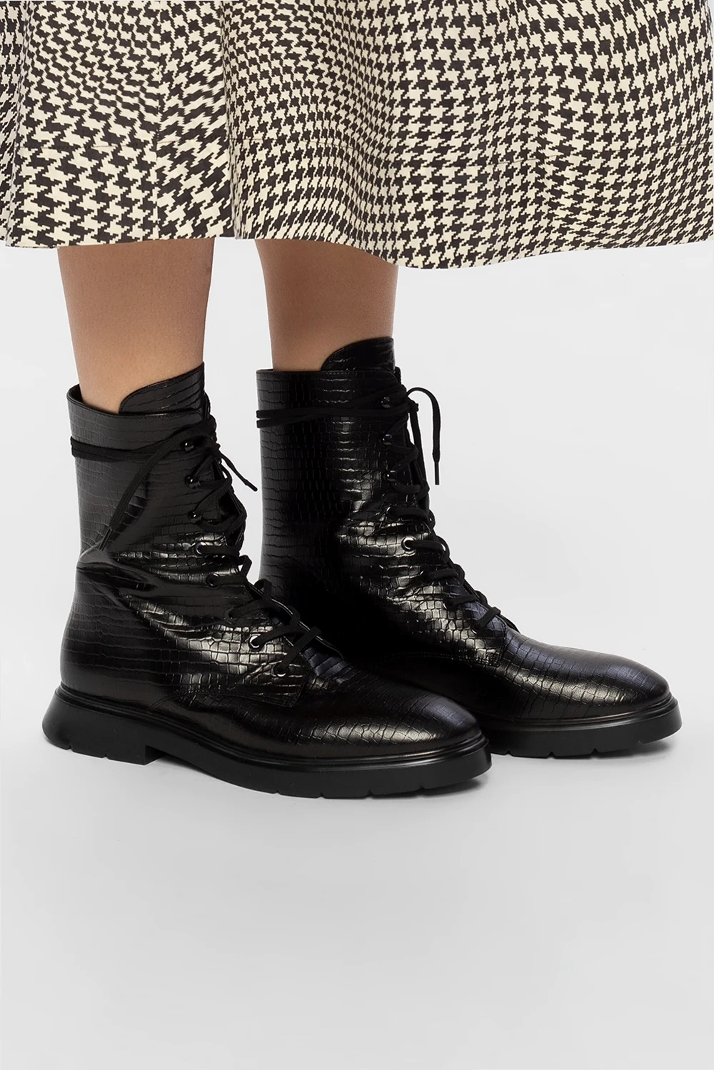 Czarne, sznurowane botki, model ‘Mckenzee’ Stuart Weitzman. Wykonane ze skóry o specjalnej fakturze. Czarna, gumowa podeszwa.