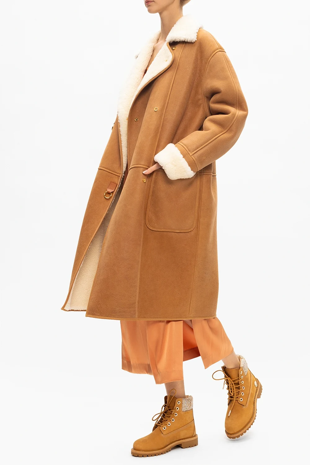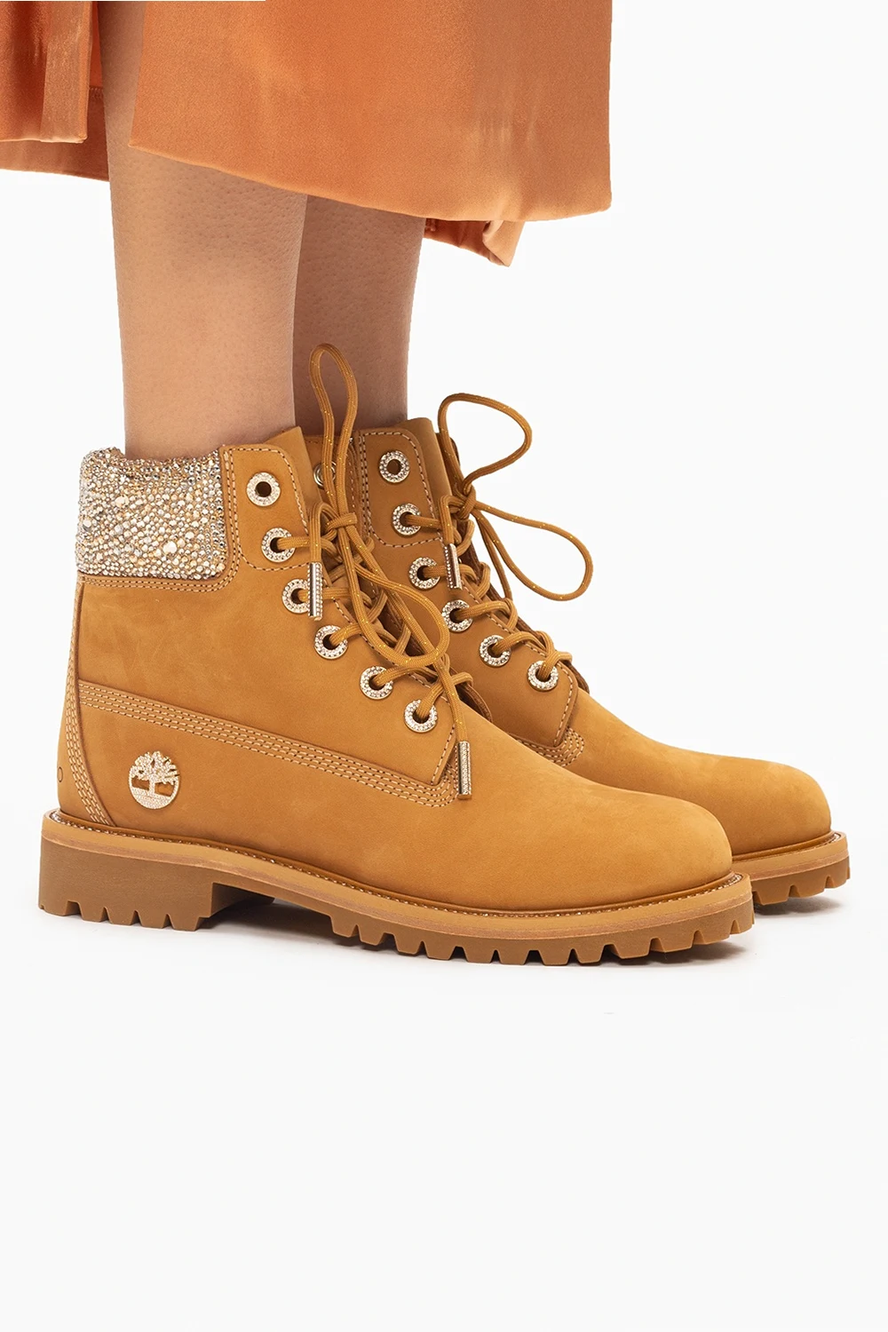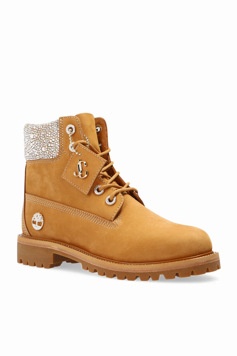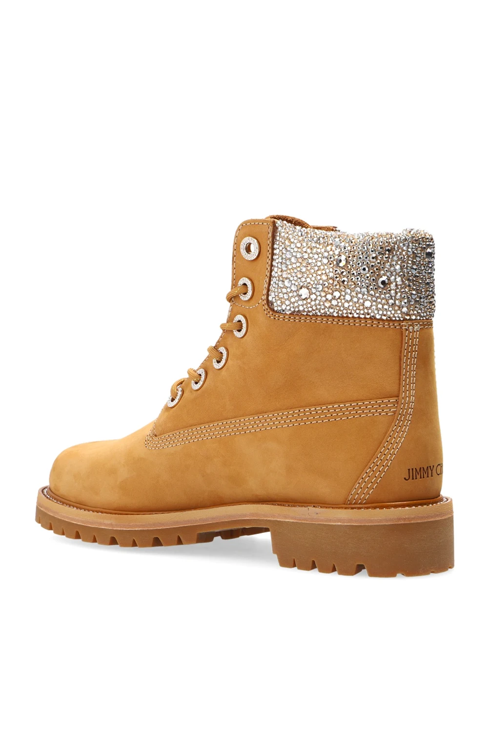 Jasnobrązowe, sznurowane botki Jimmy Choo x Timberland. Wykonane z nubuku. Ozdobione kryształami Swarovskiego. Z tyłu wytłoczone logo. Dołączona zawieszka. Brązowa, gumowa podeszwa.