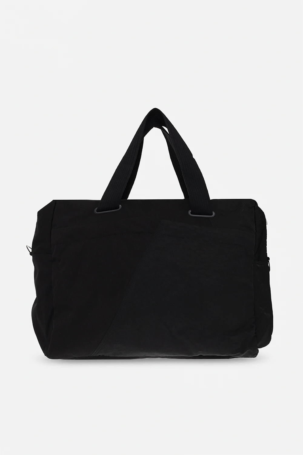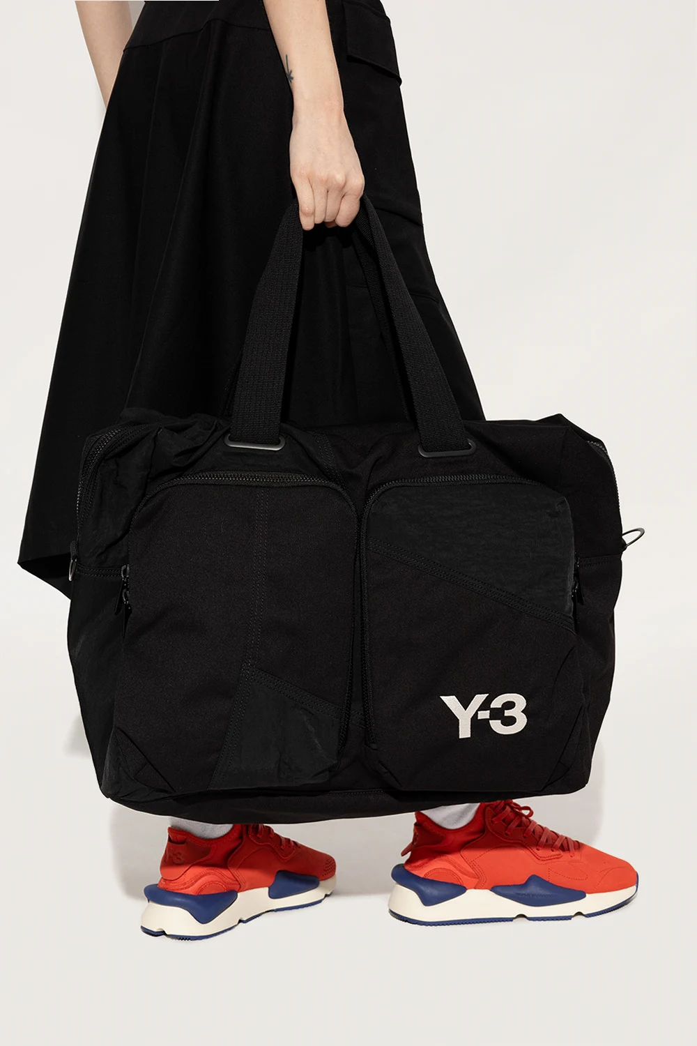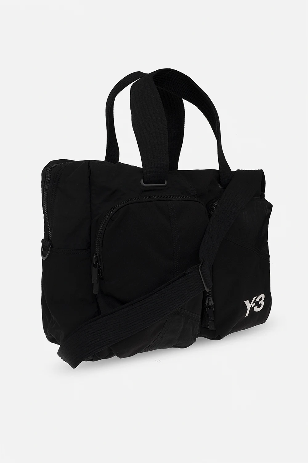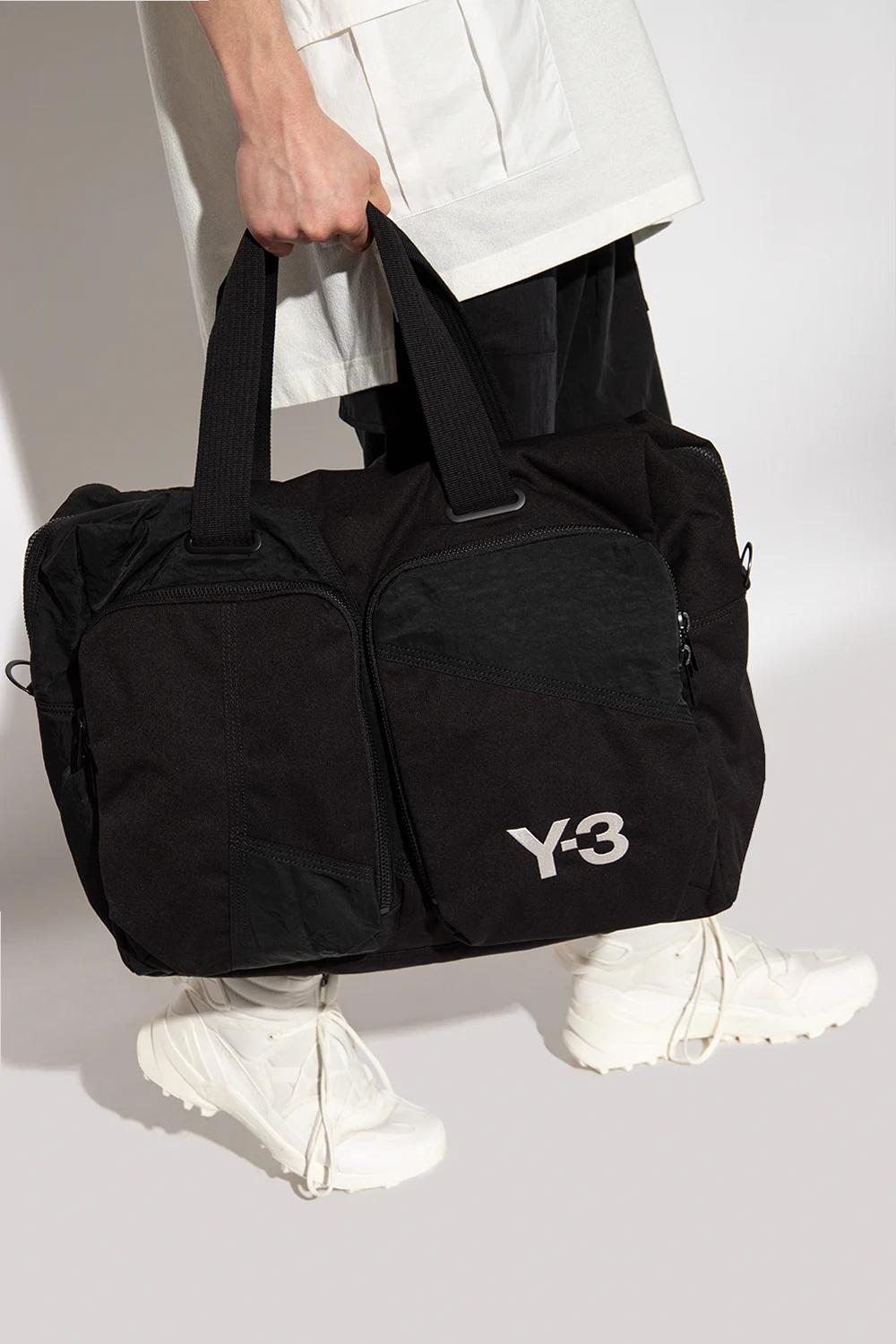Czarna torba podręczna Y-3 Yohji Yamamoto. Wykonana z materiału z recyklingu. Zamykana na dwubiegunowy zamek. Ozdobiona białym, wyszytym logo. Trzy kieszenie zamykane na zamek: dwie z przodu i z tyłu. Dwie półokrągłe rączki. Odpinany, regulowany pasek. Wewnątrz komora, dwie wsuwane kieszenie i zamykana na zamek. Metalowe elementy w kolorze złotym.