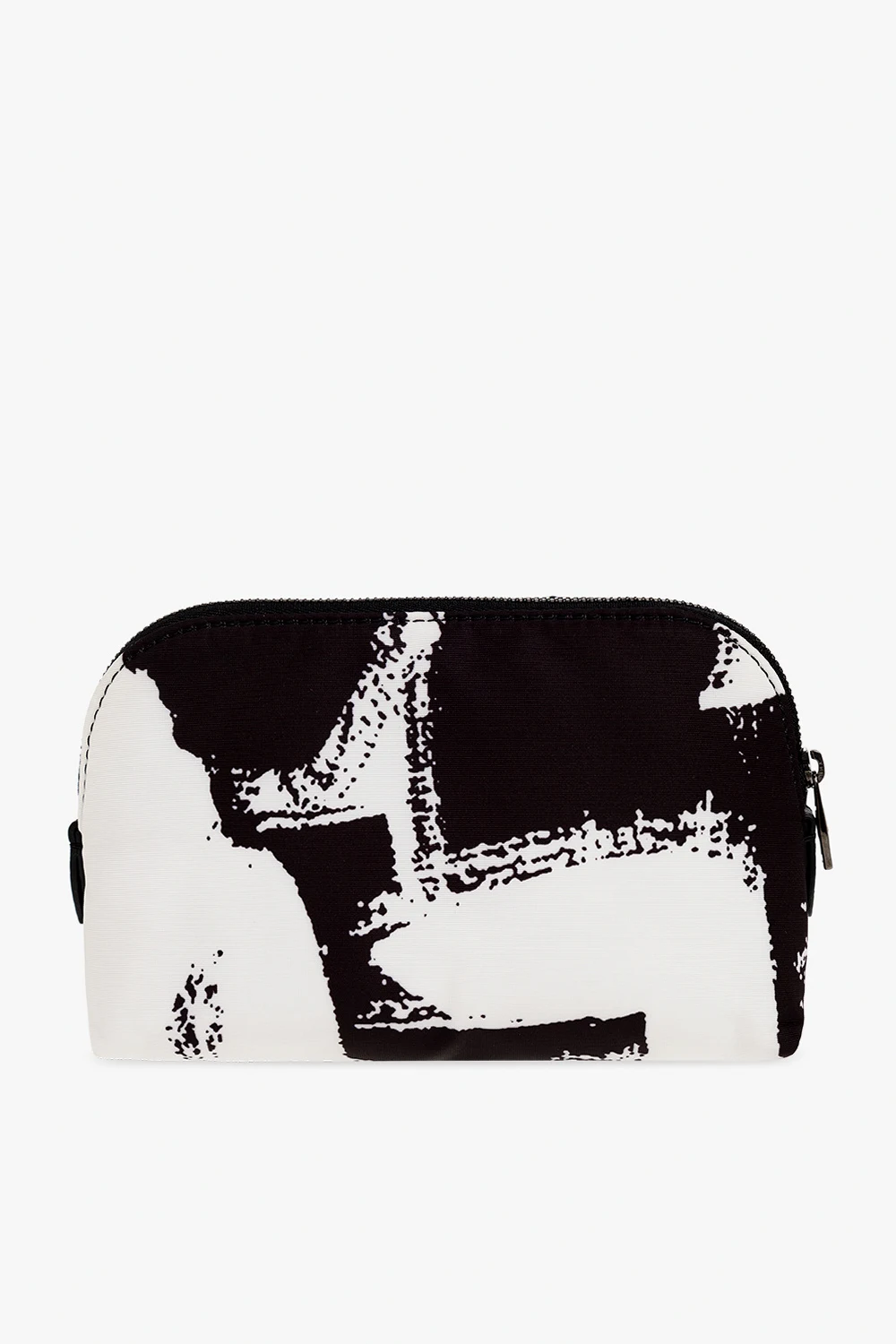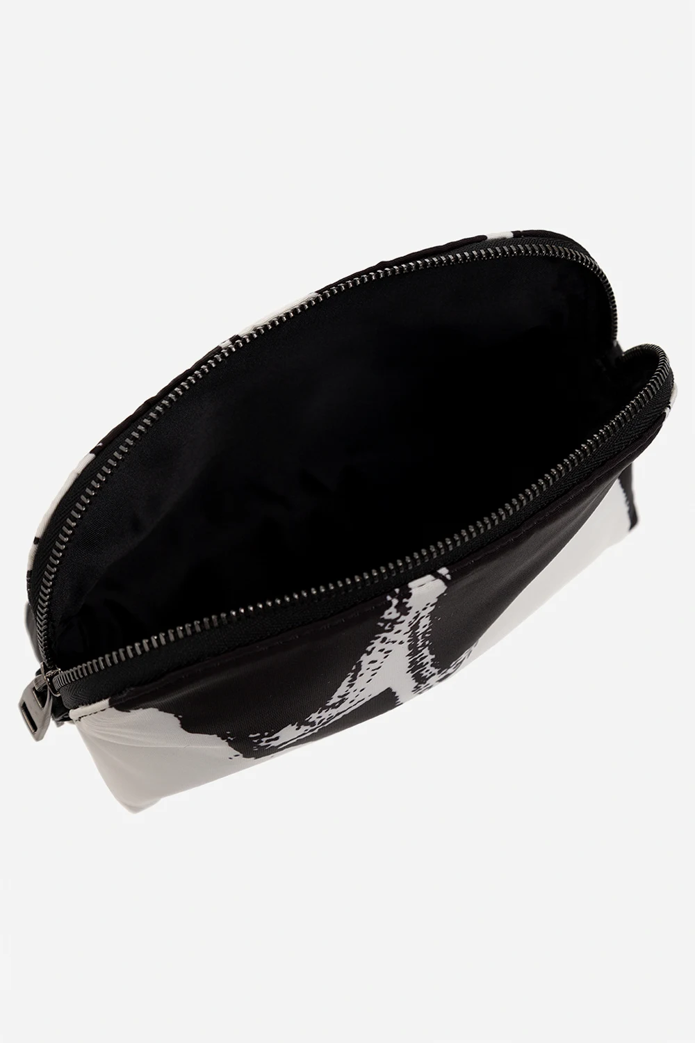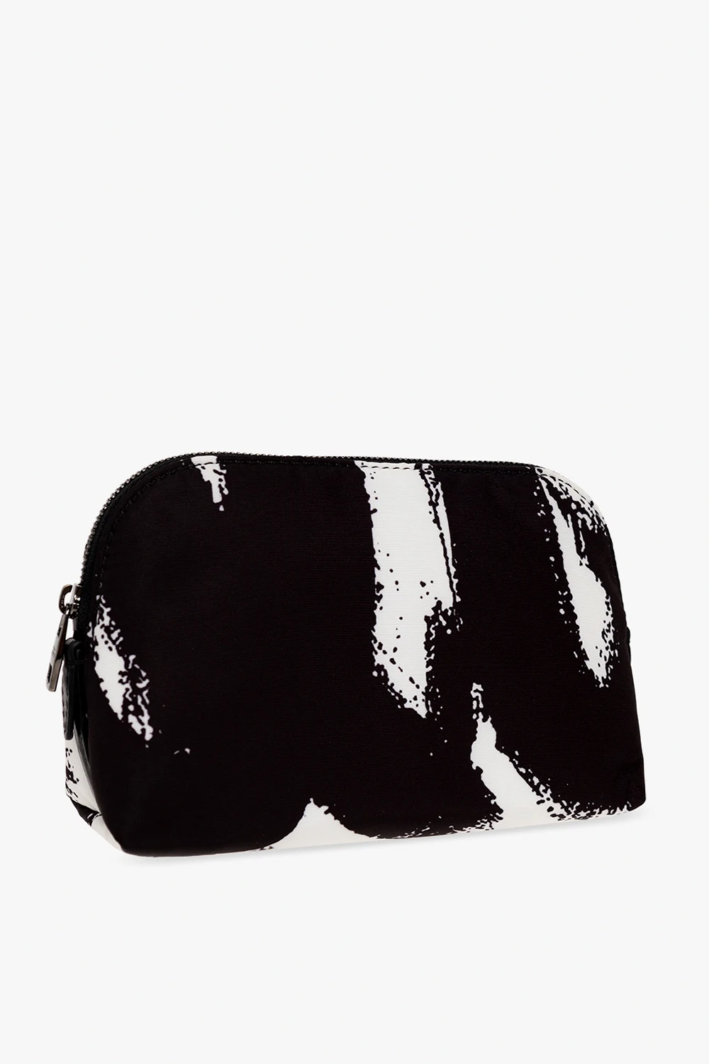 Biało-czarna kosmetyczka Alexander McQueen. Zamykana na zamek. Ozdobiona wzorem ‘McQueen Graffiti’. Wewnątrz komora.