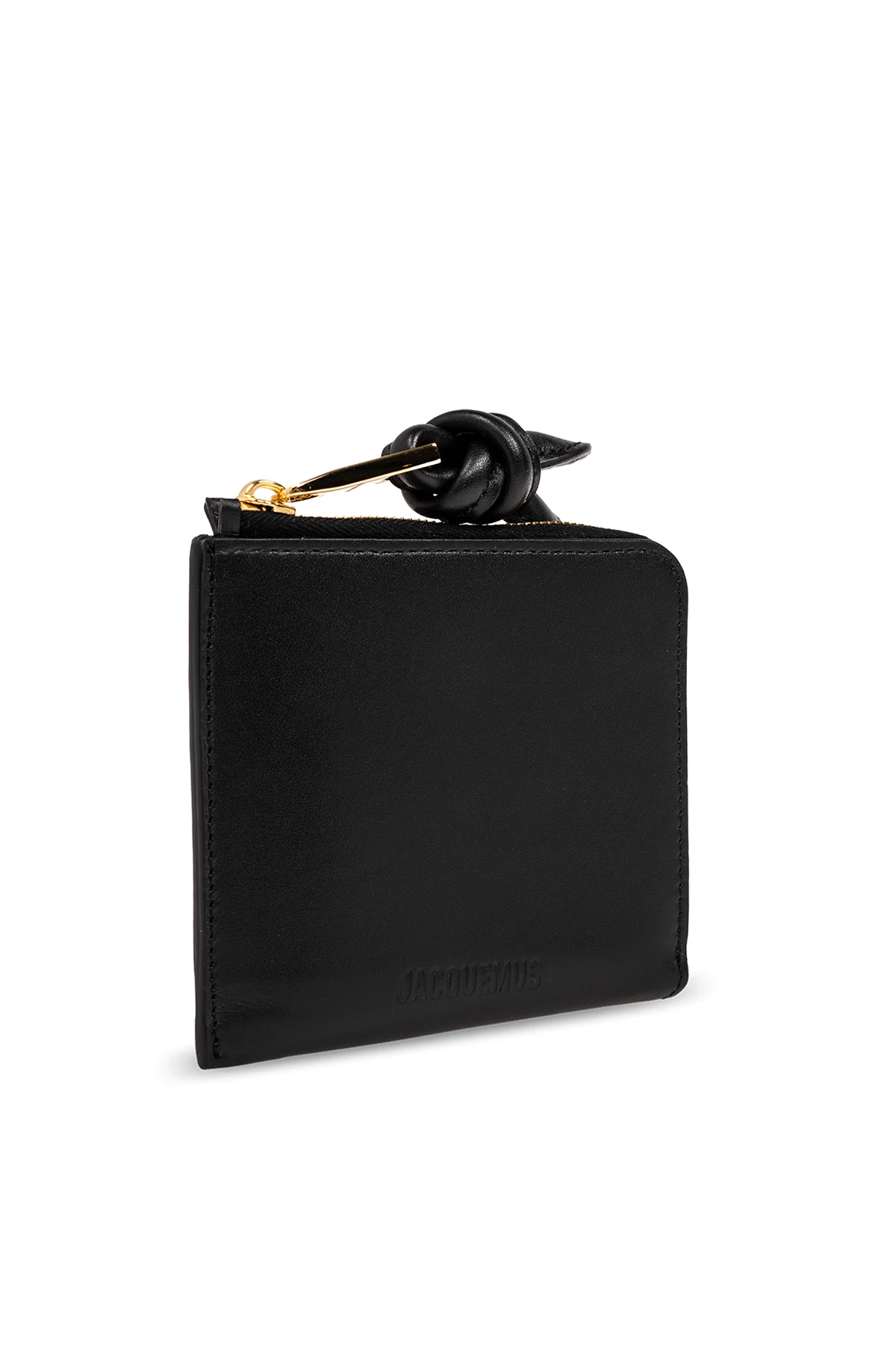 Czarny, skórzany portfel, model 'Le Porte-Monnaie Tourni' Jacquemus. Zamykany na zamek. Z przodu wytłoczone logo. Wewnątrz komora z czterema miejscami na karty.