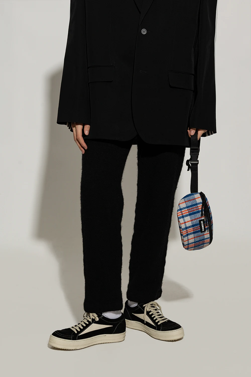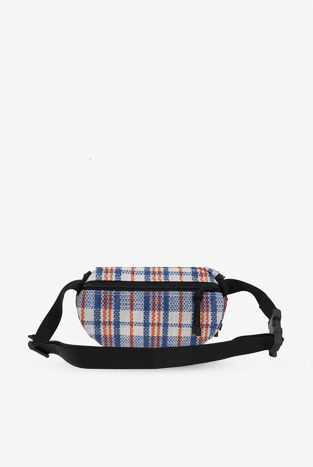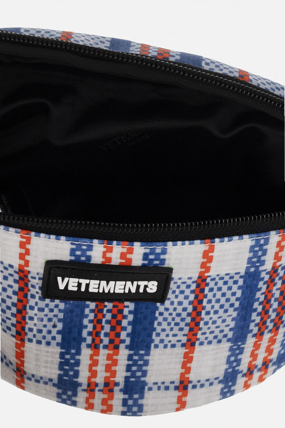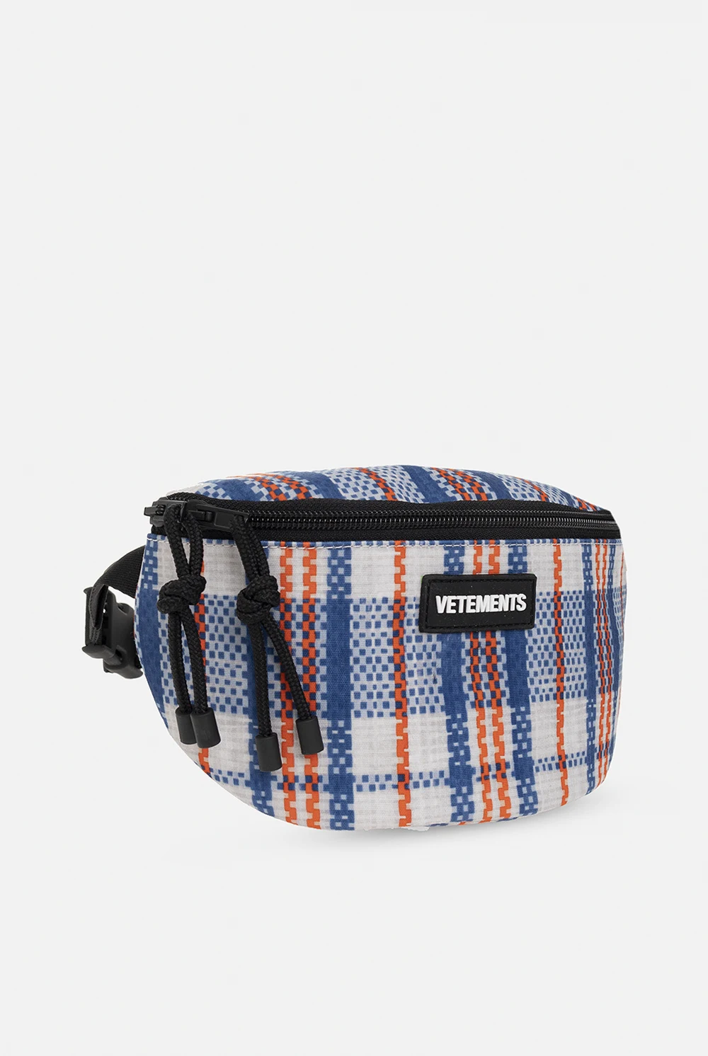 Szaro-niebiesko-pomarańczowa torba na pas VETEMENTS. Zamykana na dwubiegunowy zamek. Ozdobiona wzorem w kratę. Z przodu gumowa naszywka z logo w kolorze czarno-białym. Z tyłu kieszeń z zamknięciem na zamek. Pas z możliwością regulacji długości. Wewnątrz komora.